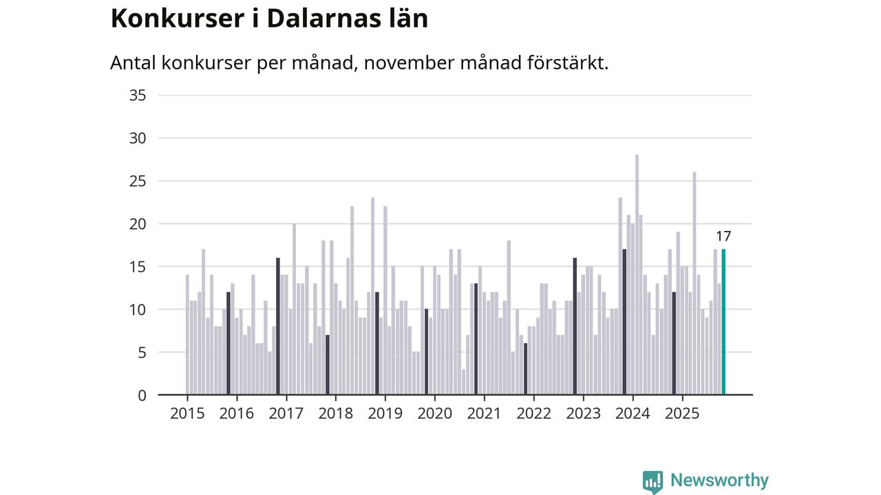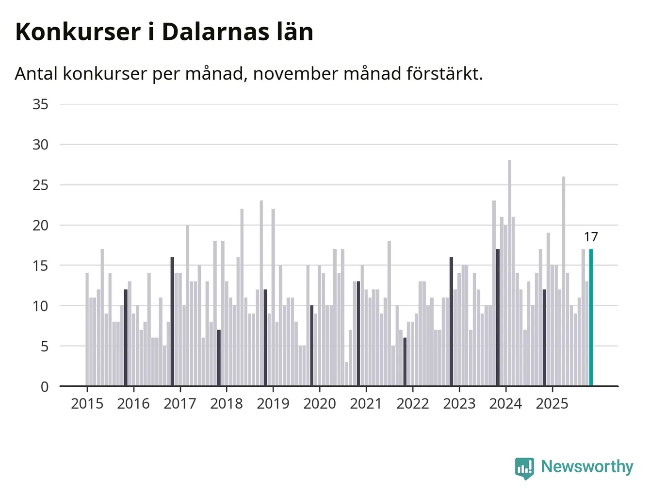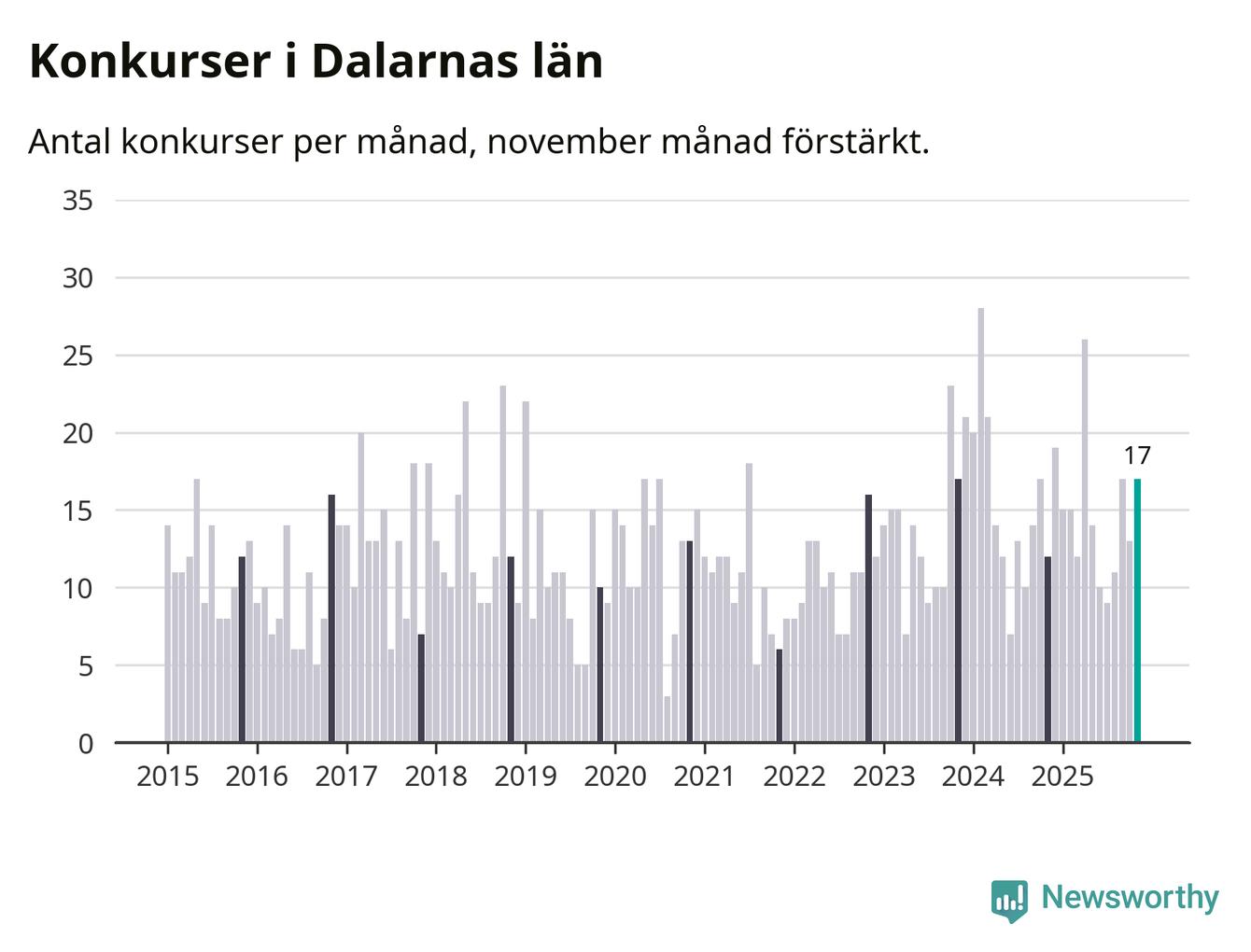 Under november månad gick 17 bolag i konkurs i Dalarna. Det är en tämligen normal nivå för den här tiden på året. I fjol noterades tolv konkurser under november.