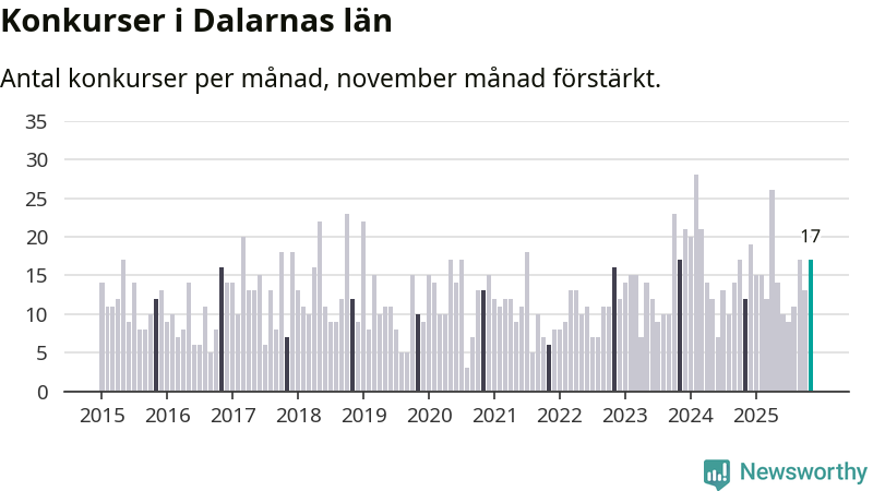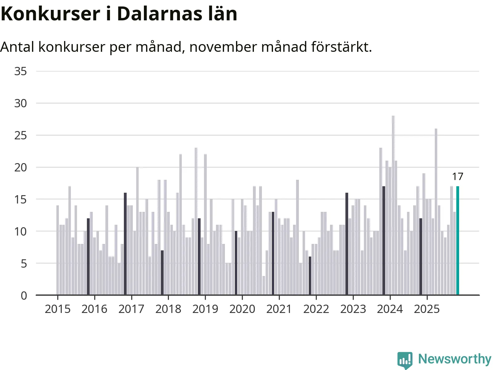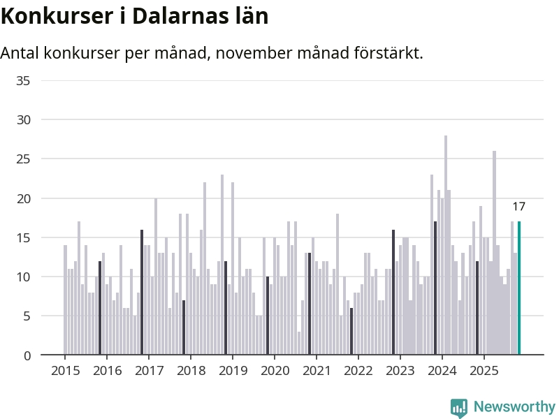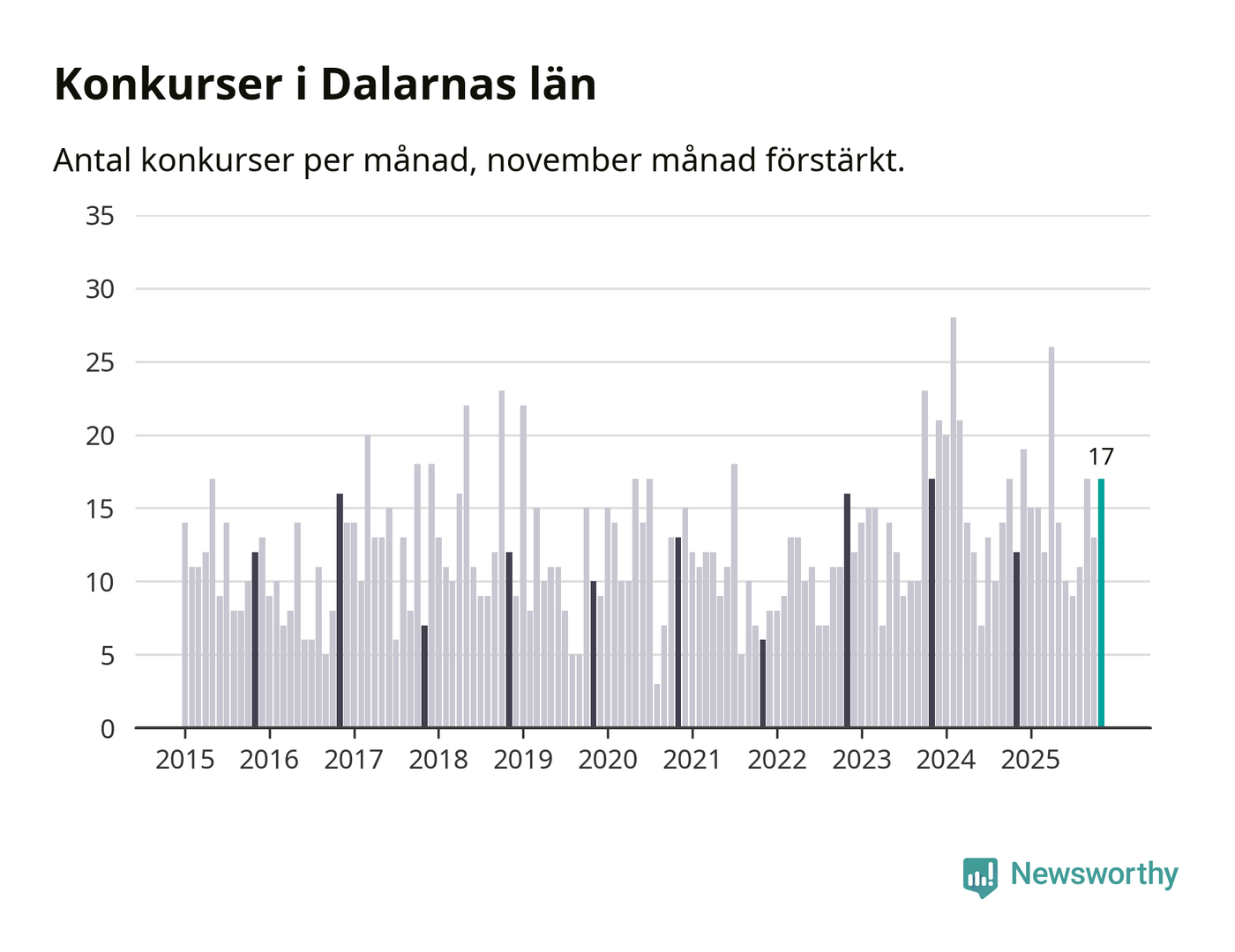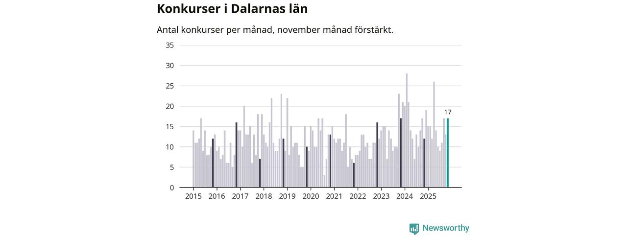Under november månad gick 17 bolag i konkurs i Dalarna. Det är en tämligen normal nivå för den här tiden på året. I fjol noterades tolv konkurser under november.