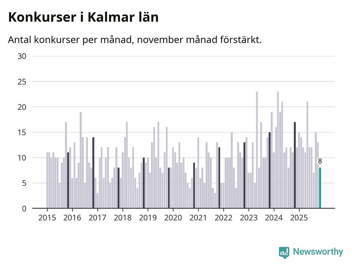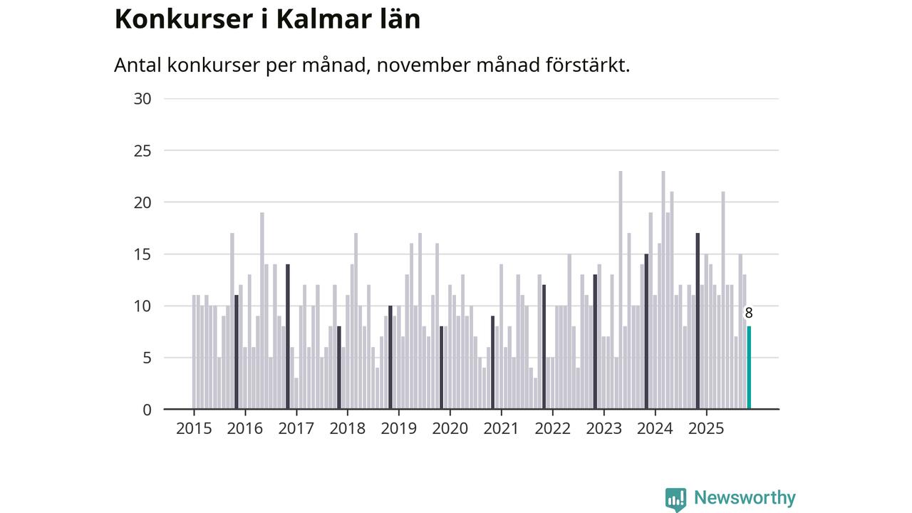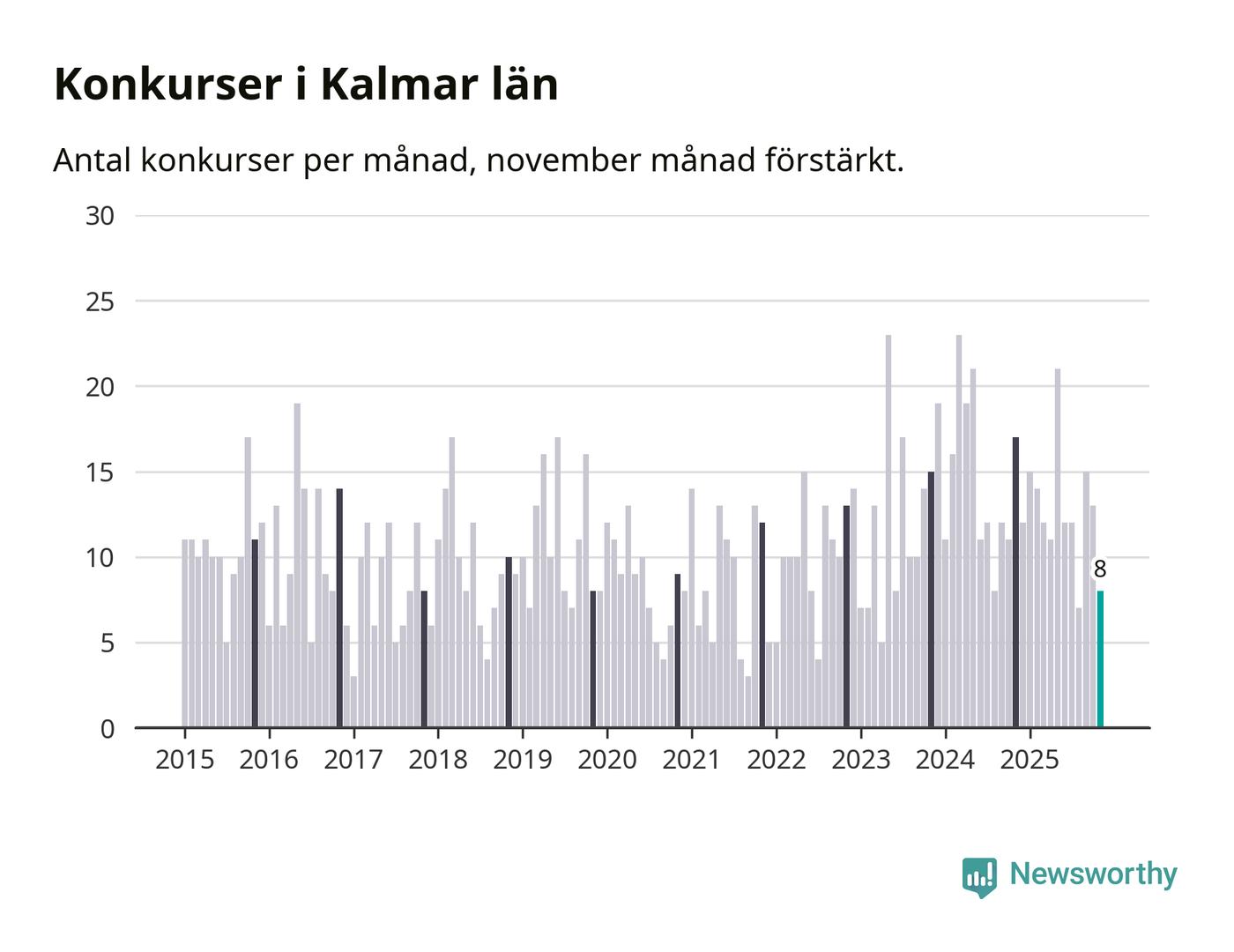 Under november månad gick åtta bolag i konkurs i Kalmar län. Det är en tämligen normal nivå för den här tiden på året. I fjol noterades 17 konkurser under november.