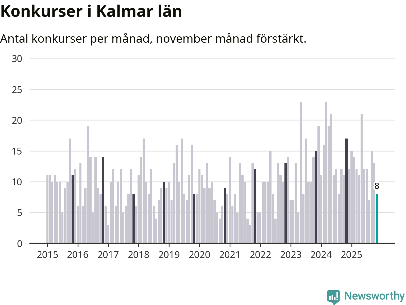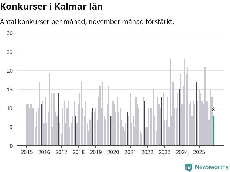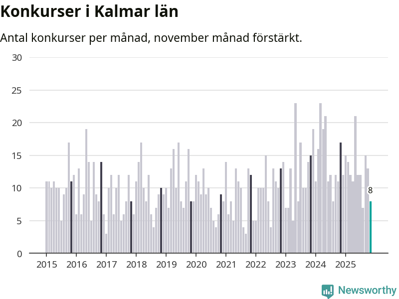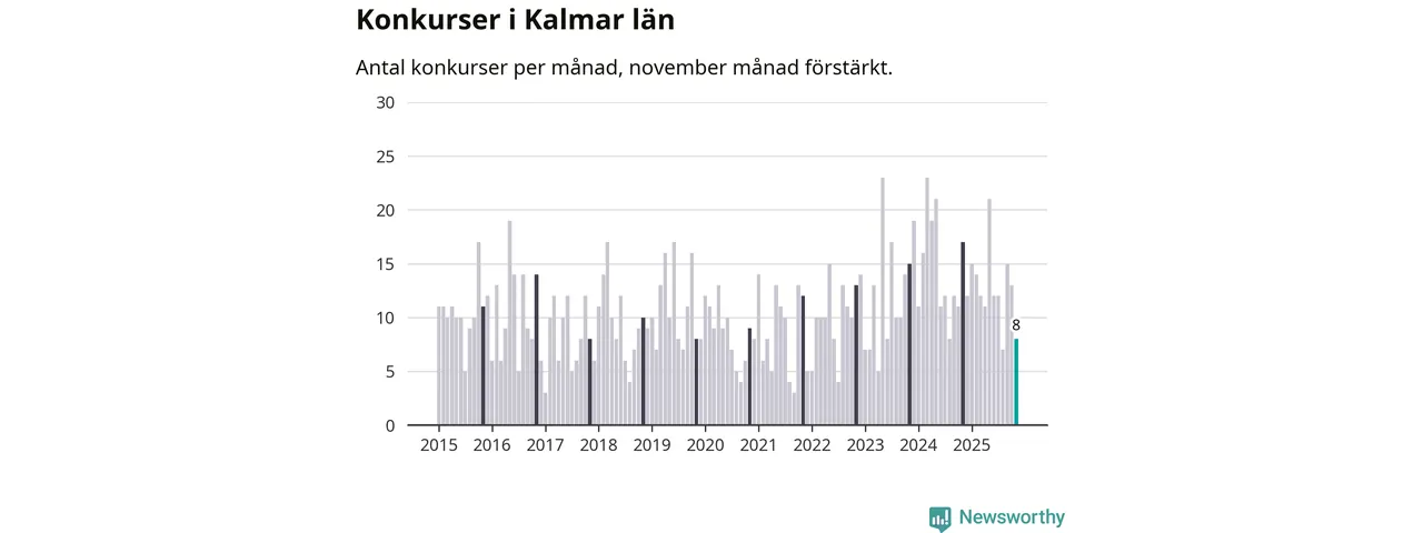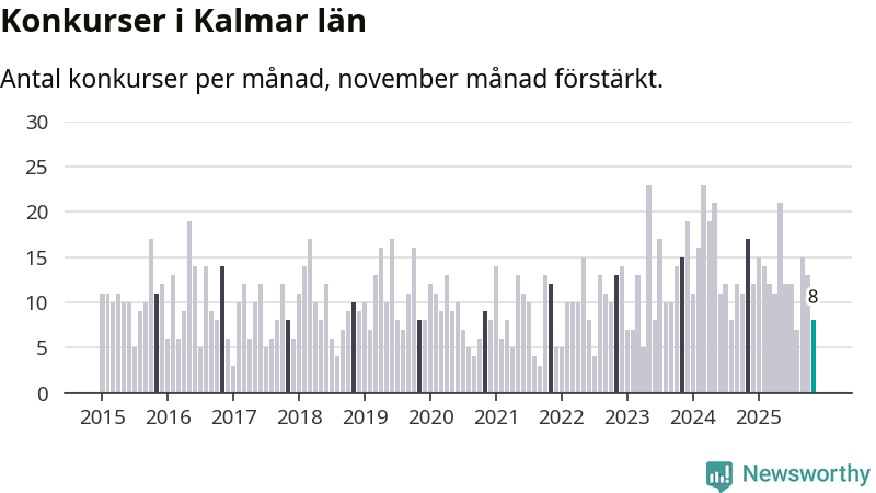 Under november månad gick åtta bolag i konkurs i Kalmar län. Det är en tämligen normal nivå för den här tiden på året. I fjol noterades 17 konkurser under november.