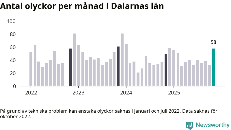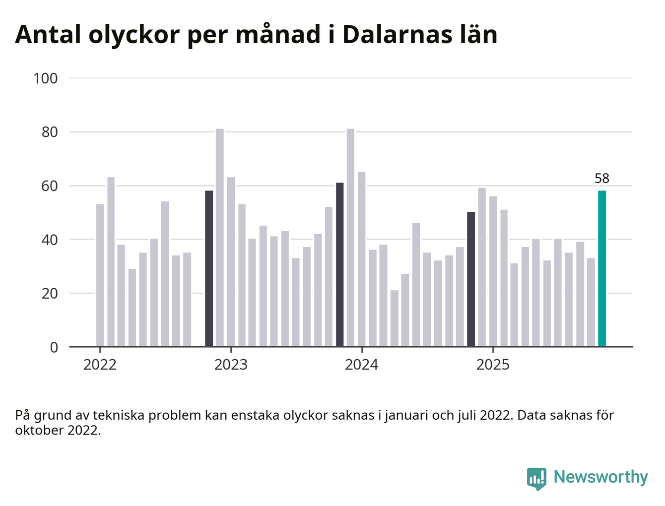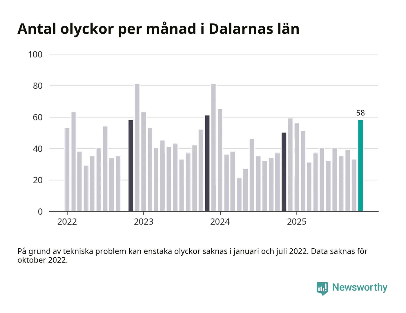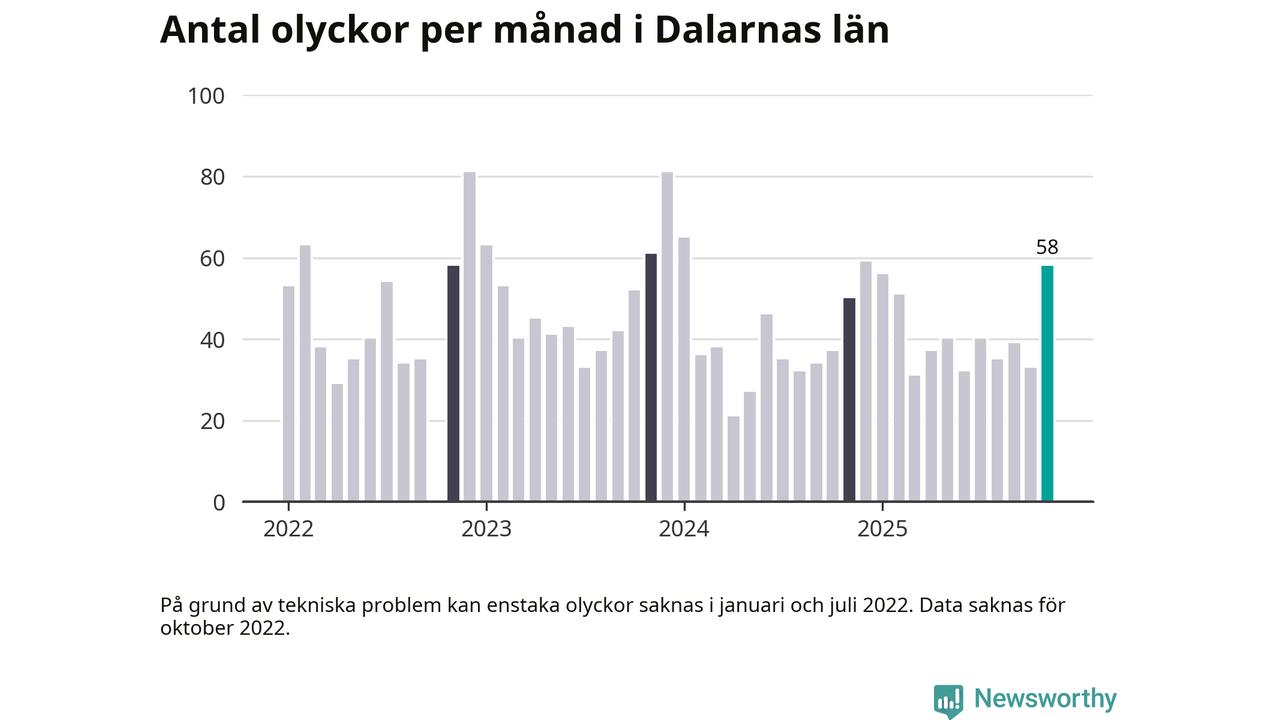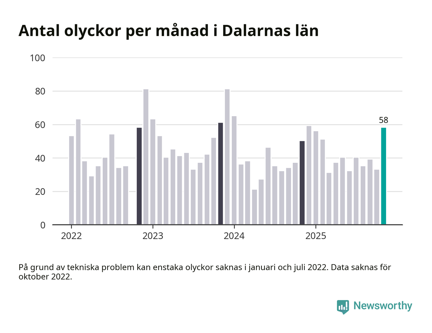 I Dalarnas län var trafikolyckorna fler än under samma månad i fjol: 58 olyckor längs de stora vägarna i länet. Det visar data från Trafikverket som Newsworthy sammanställt.