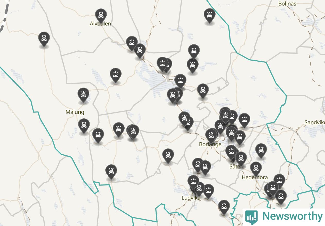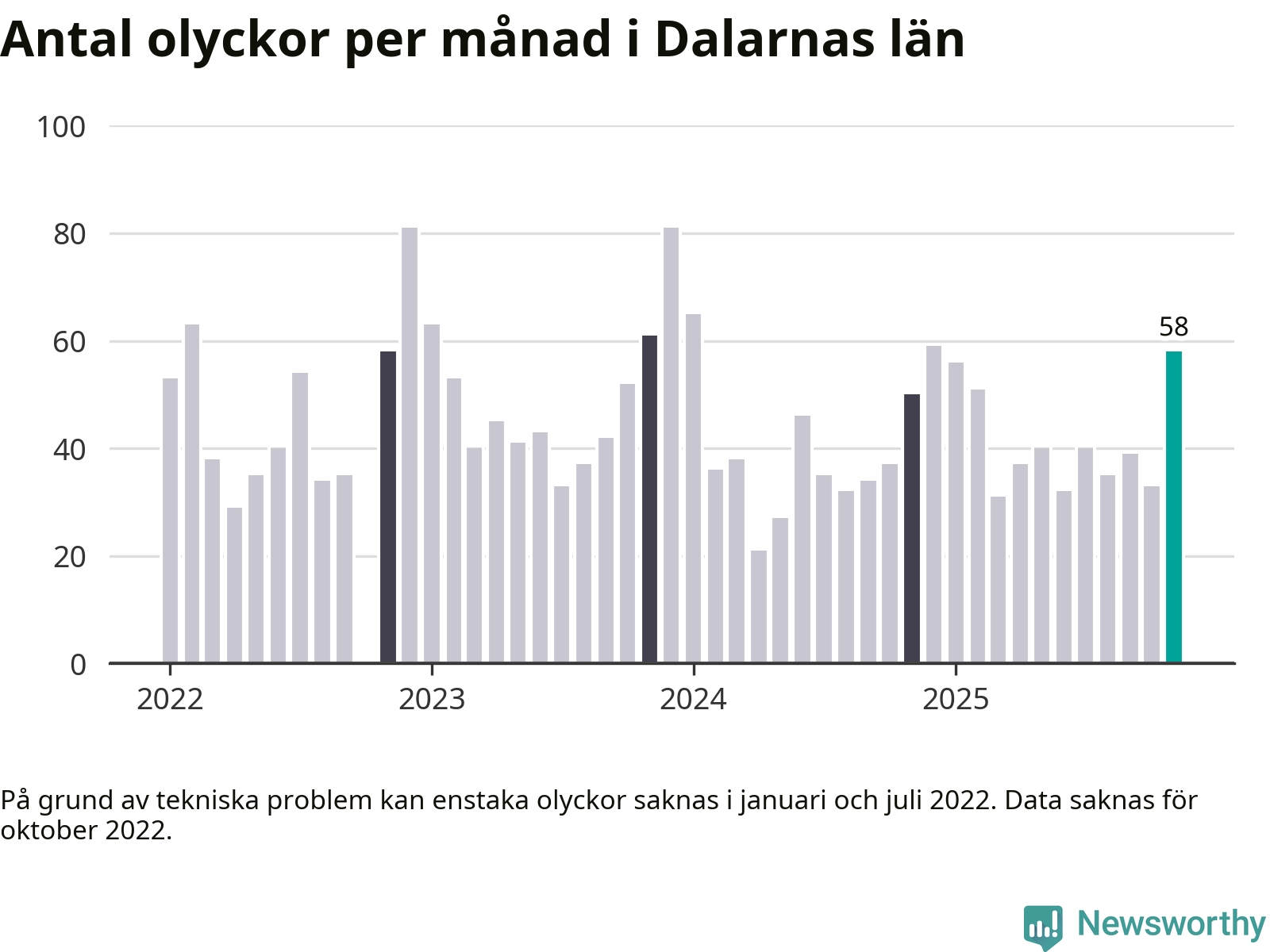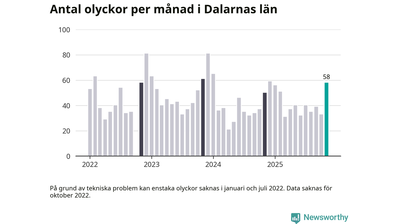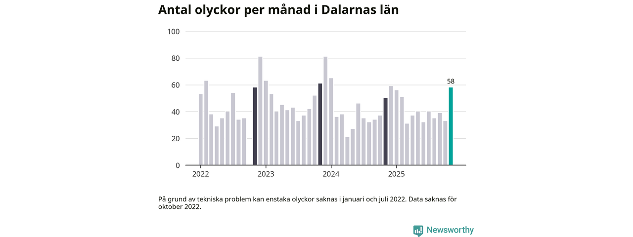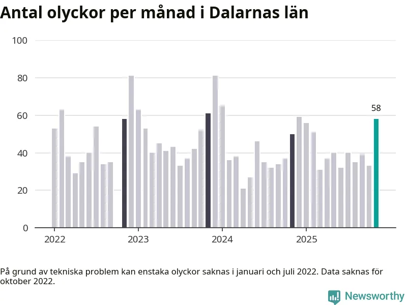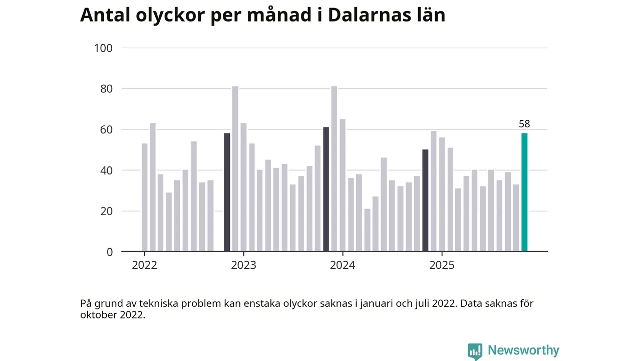 I Dalarnas län var trafikolyckorna fler än under samma månad i fjol: 58 olyckor längs de stora vägarna i länet. Det visar data från Trafikverket som Newsworthy sammanställt.