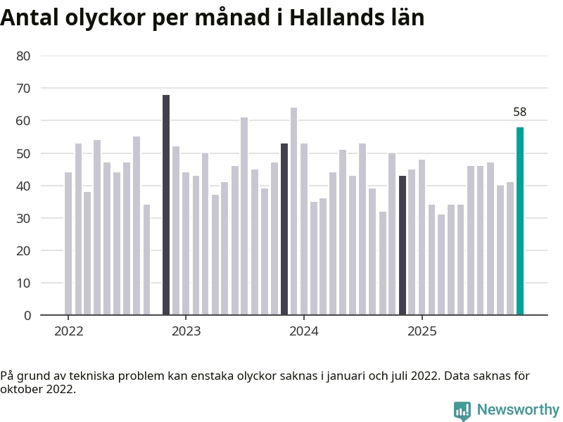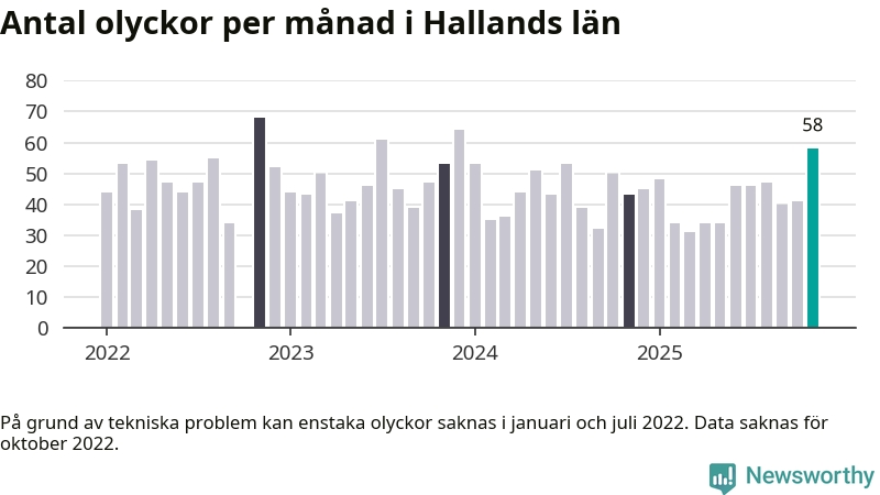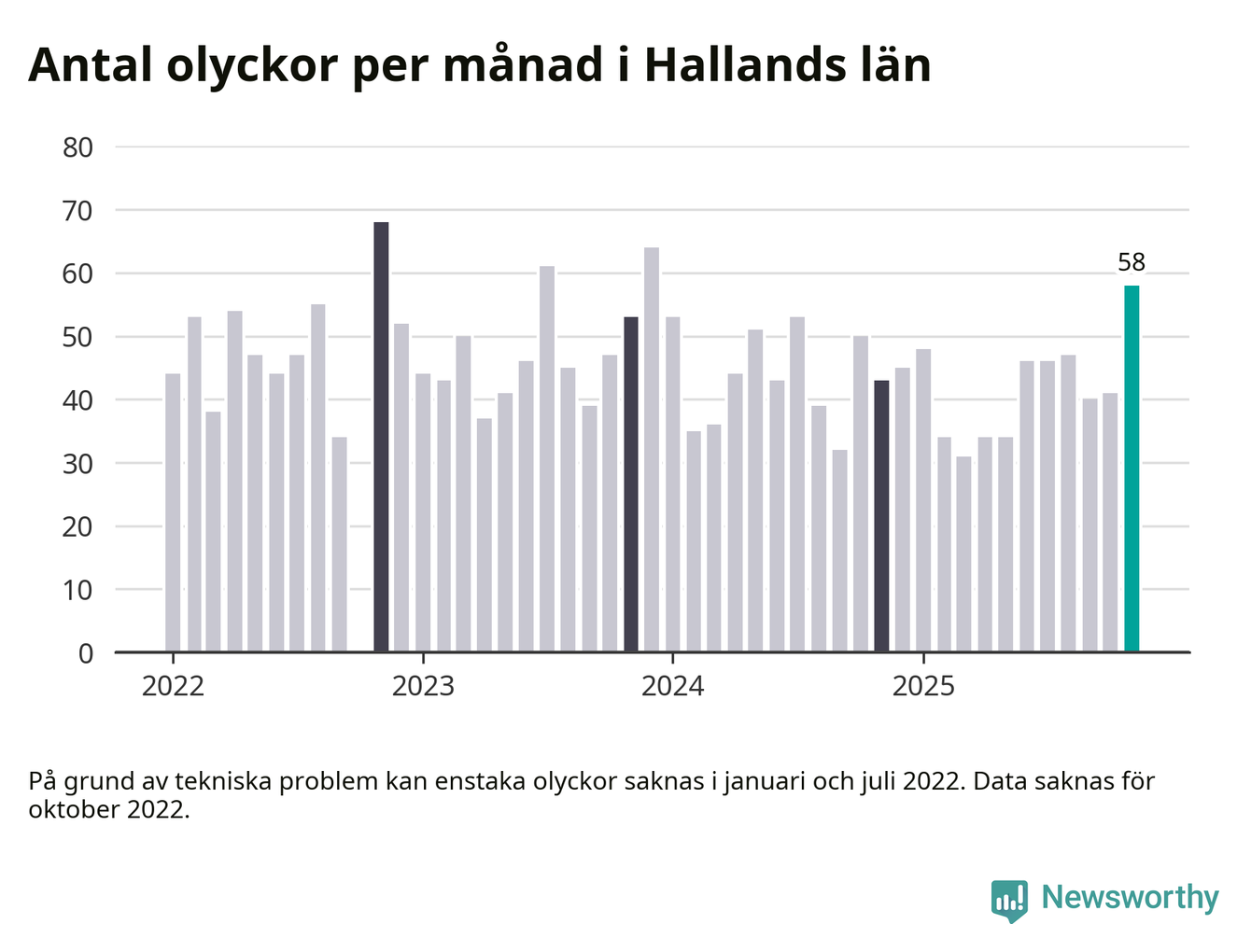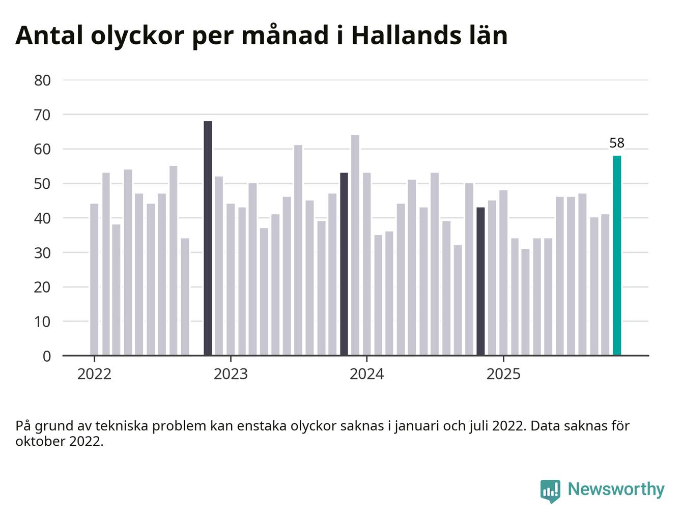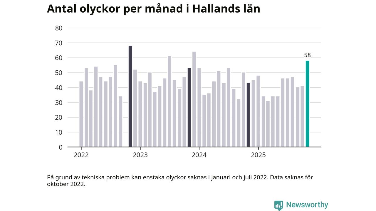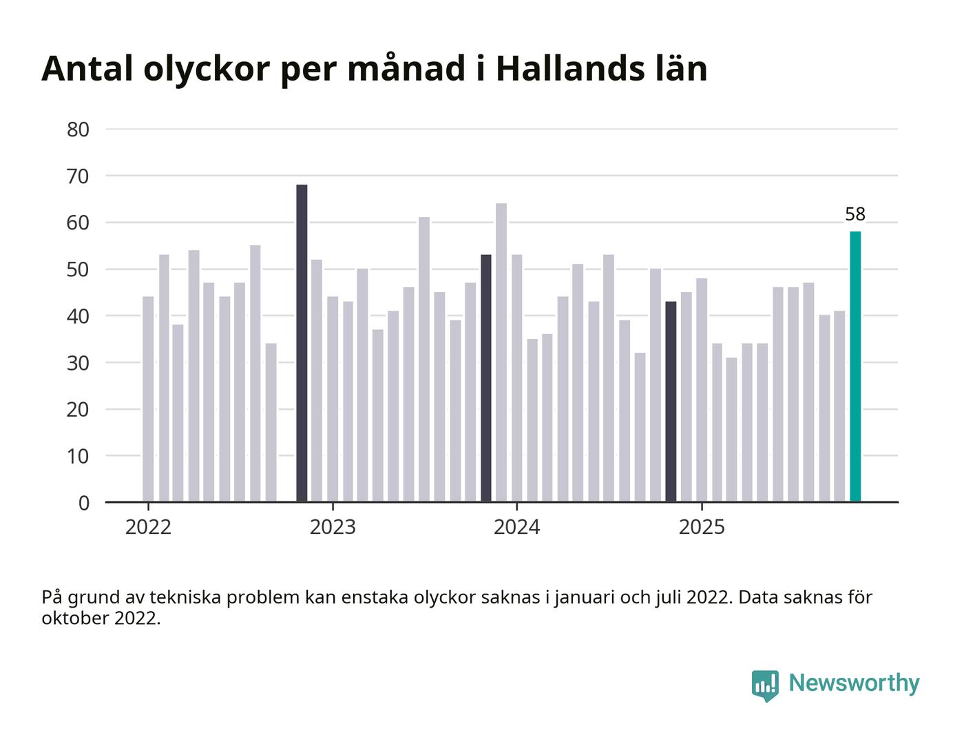 I Hallands län var trafikolyckorna fler än under samma månad i fjol: 58 olyckor längs de stora vägarna i länet. Det visar data från Trafikverket som Newsworthy sammanställt.