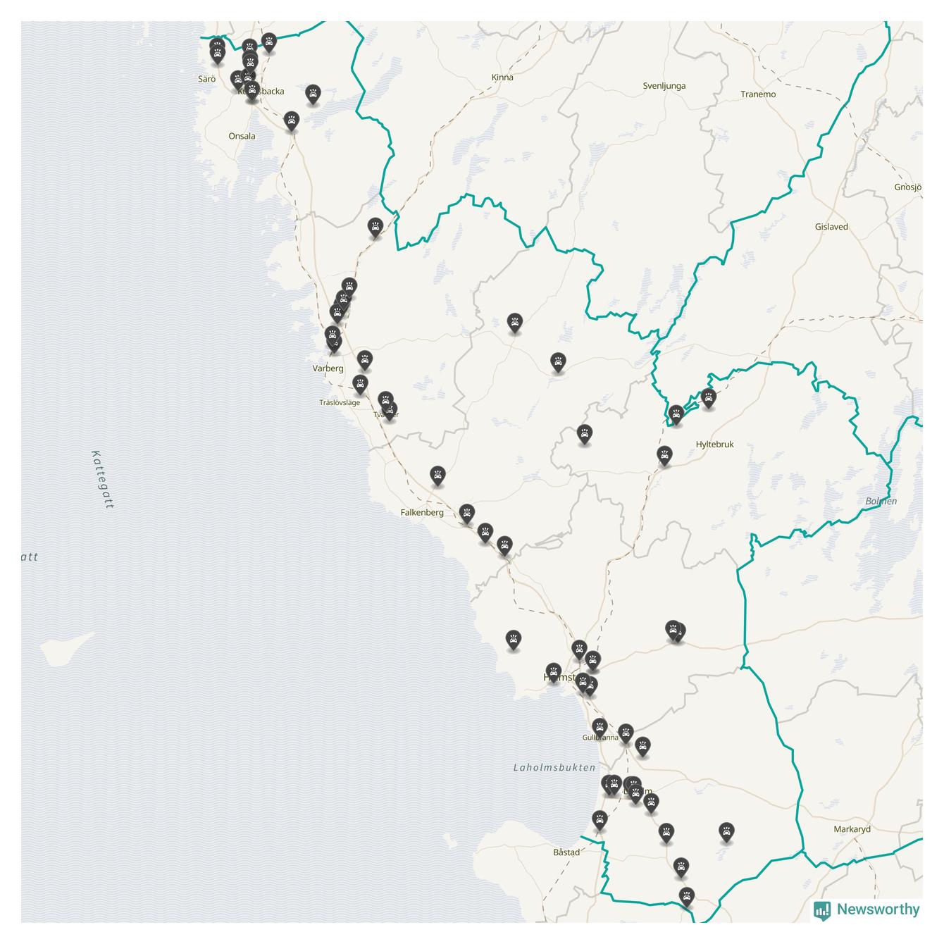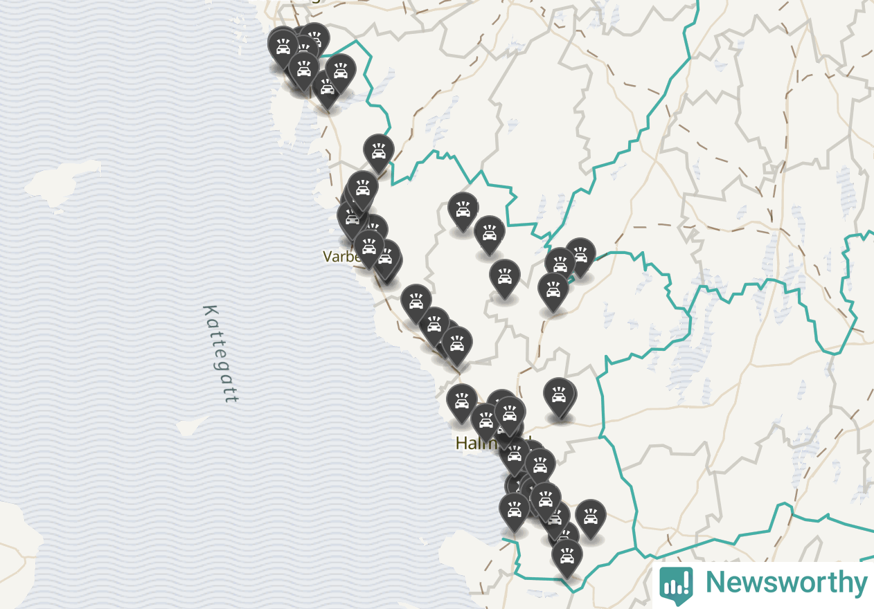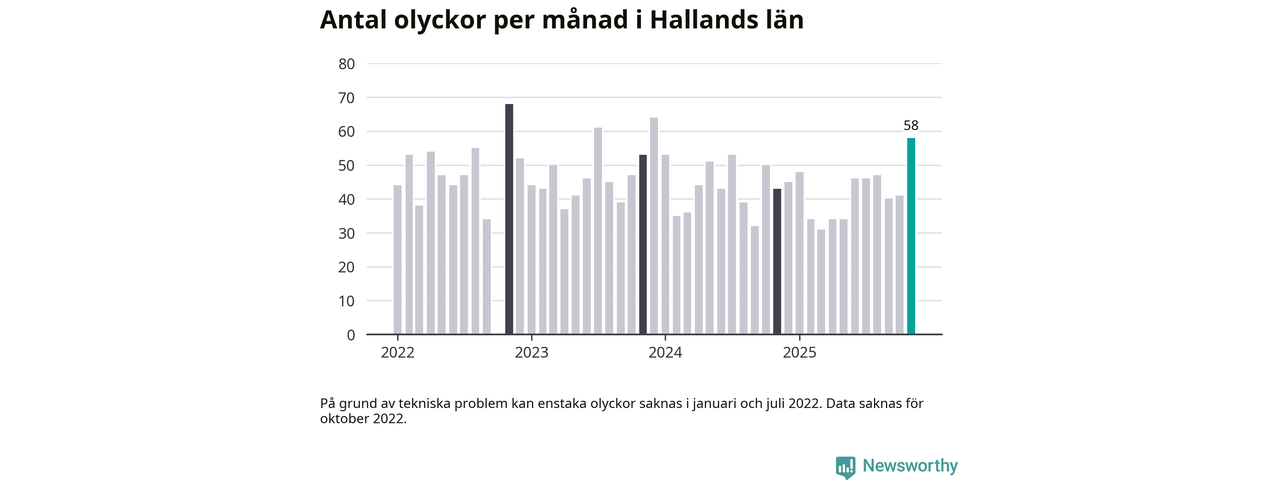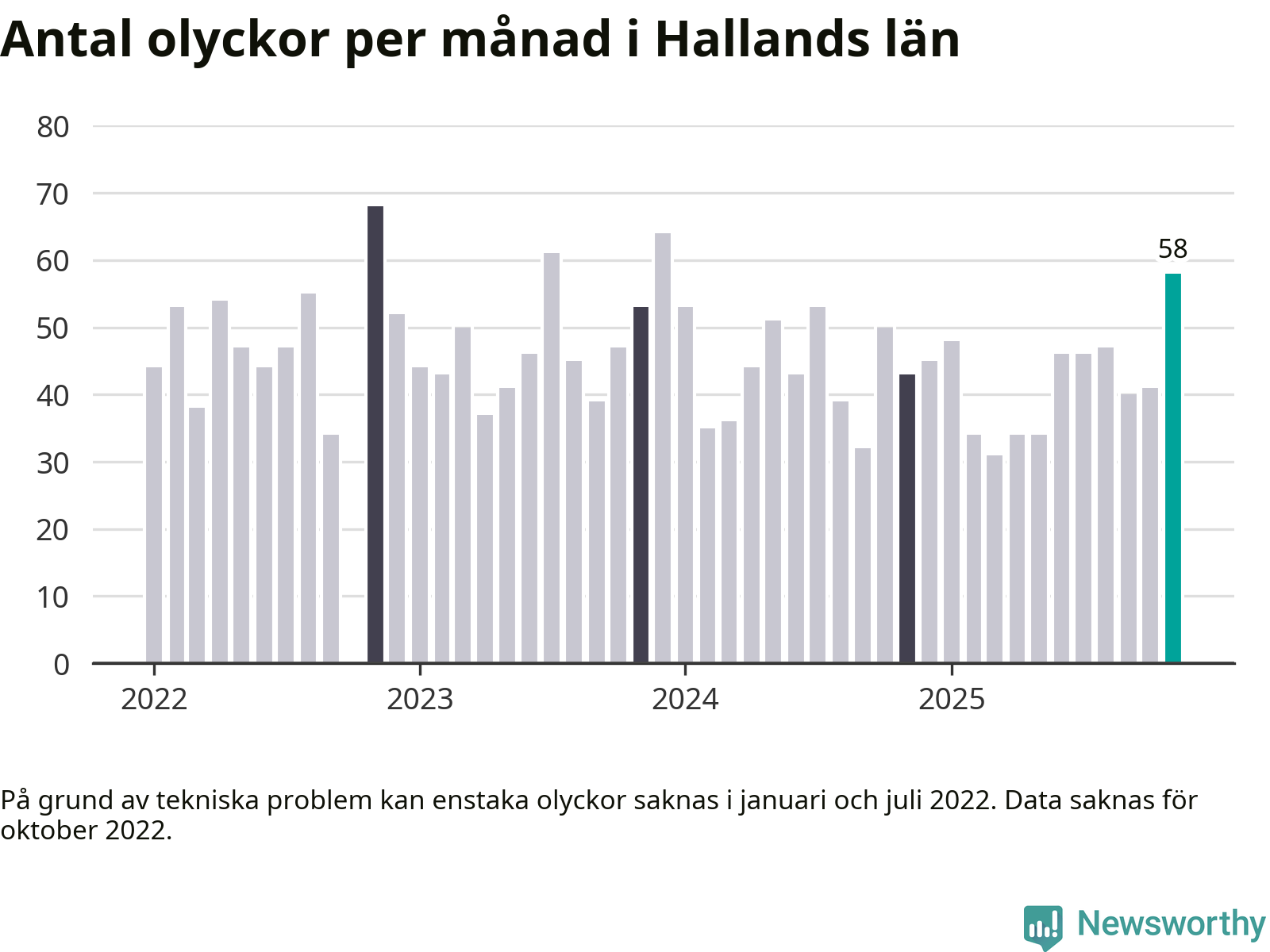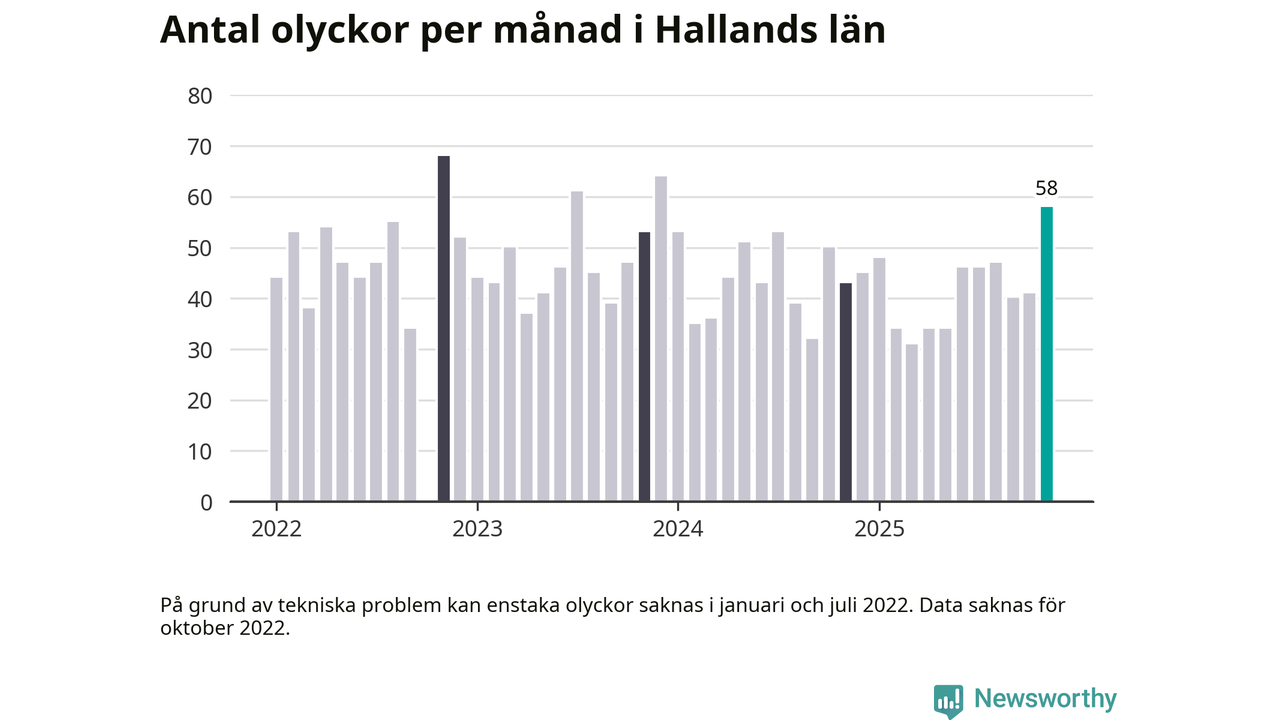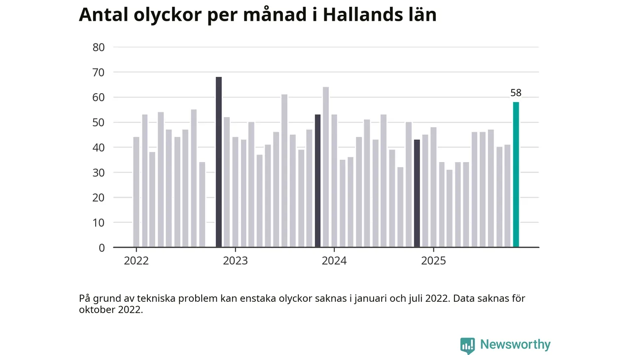 I Hallands län var trafikolyckorna fler än under samma månad i fjol: 58 olyckor längs de stora vägarna i länet. Det visar data från Trafikverket som Newsworthy sammanställt.