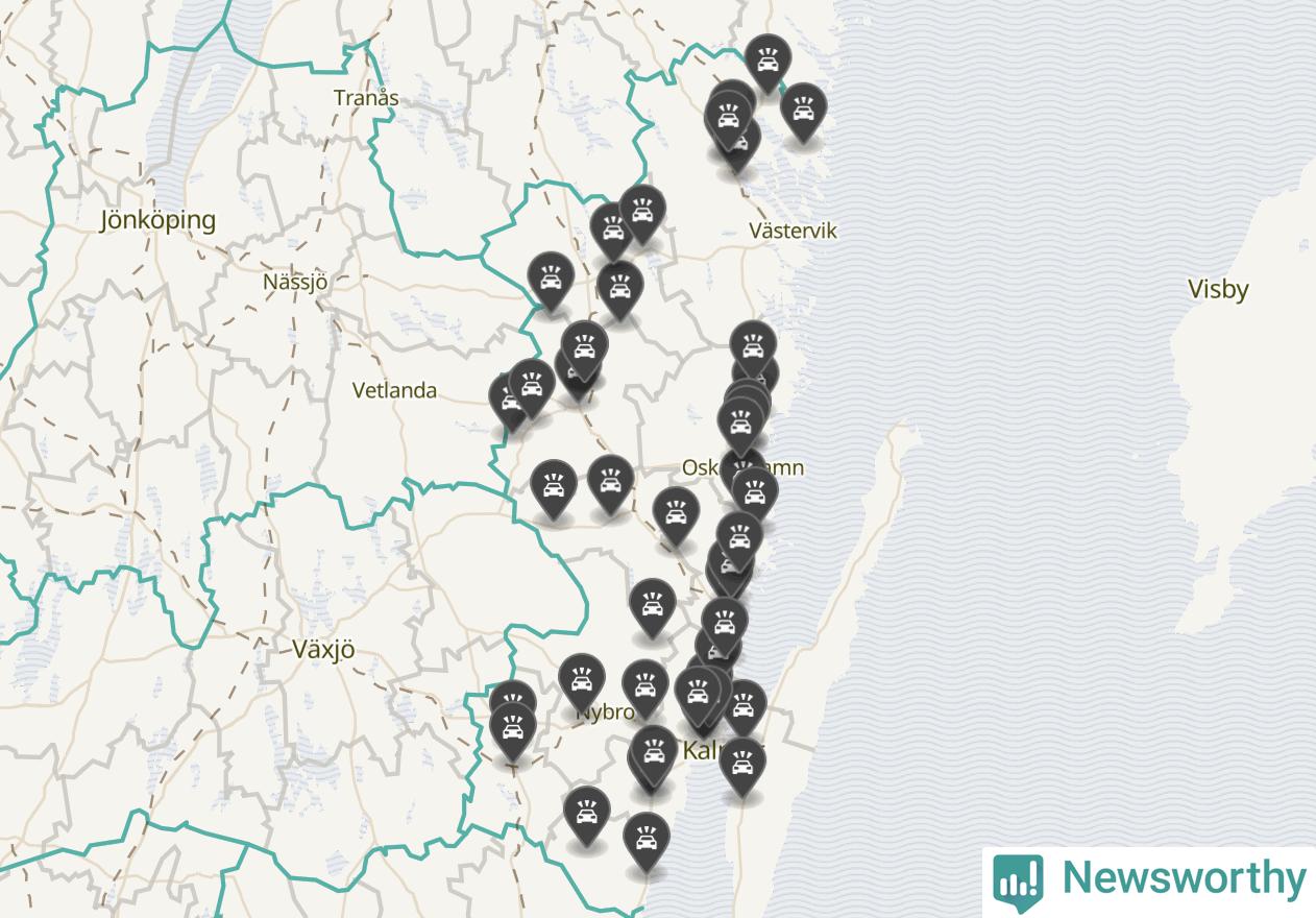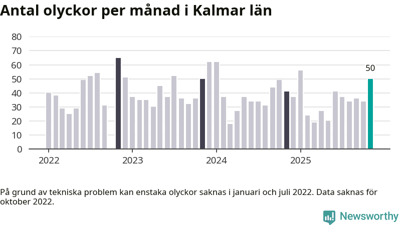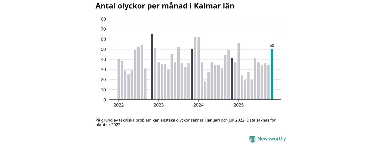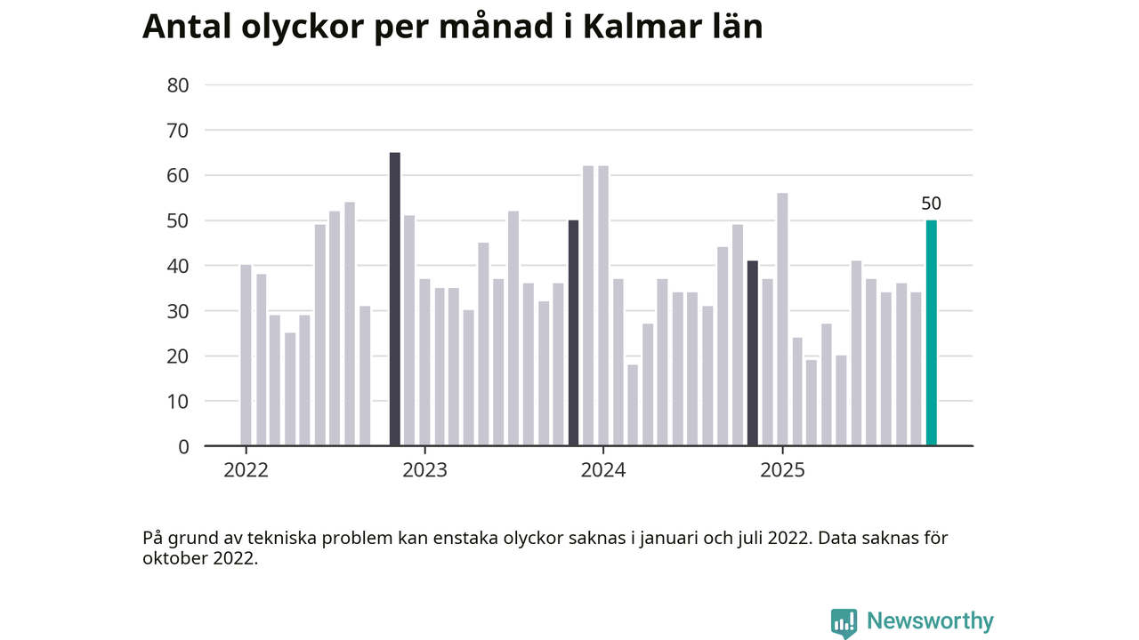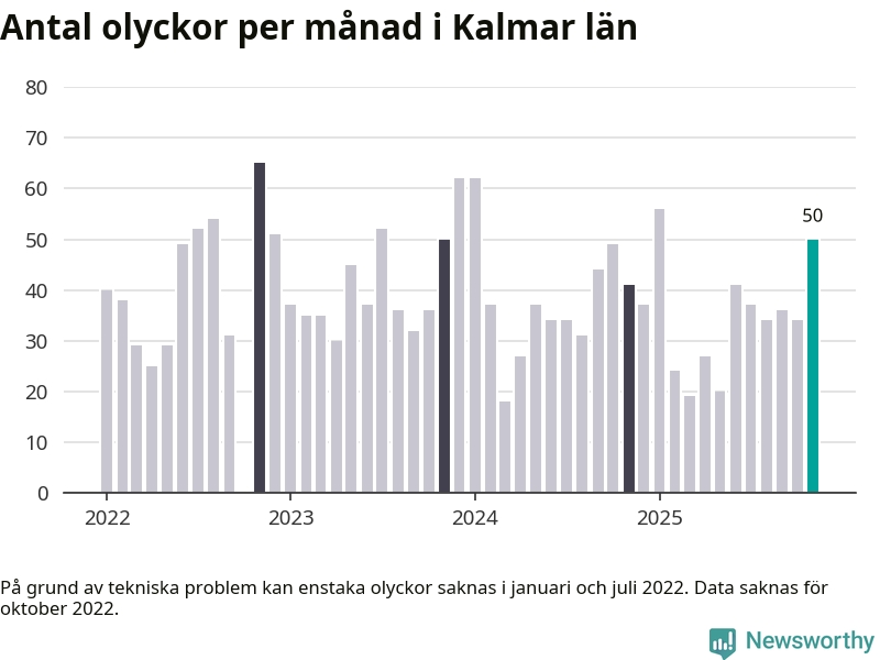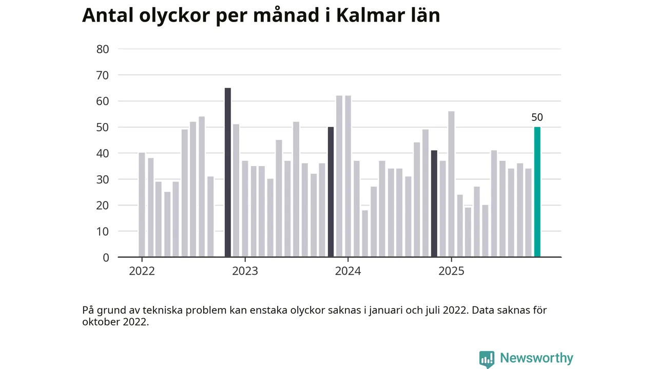 I Kalmar län var trafikolyckorna fler än under samma månad i fjol: 50 olyckor längs de stora vägarna i länet. Det visar data från Trafikverket som Newsworthy sammanställt.