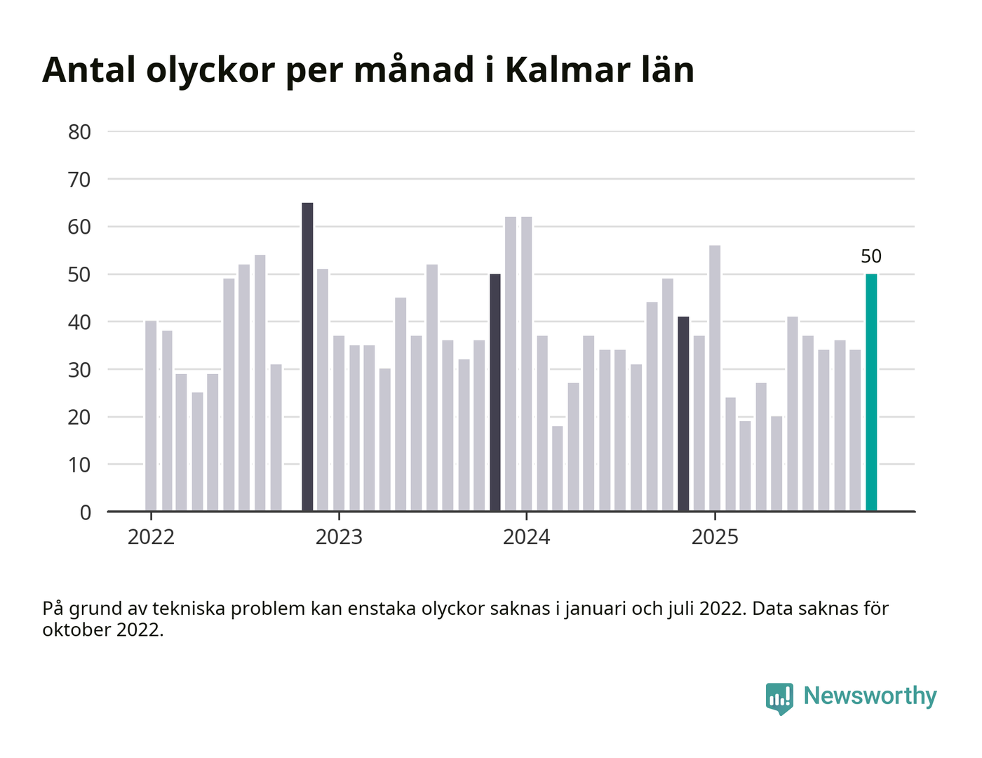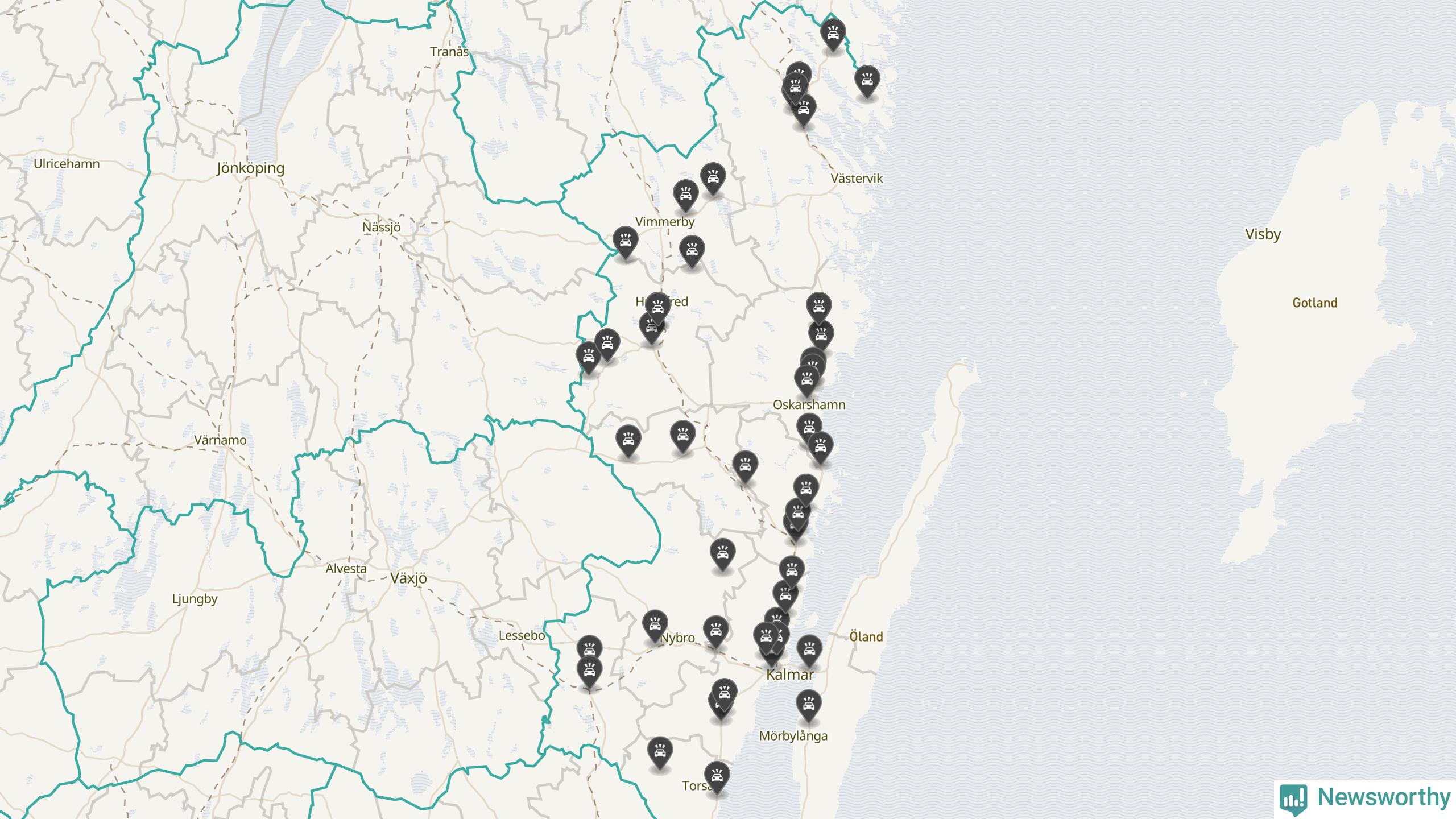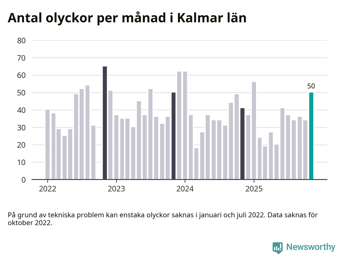 I Kalmar län var trafikolyckorna fler än under samma månad i fjol: 50 olyckor längs de stora vägarna i länet. Det visar data från Trafikverket som Newsworthy sammanställt.