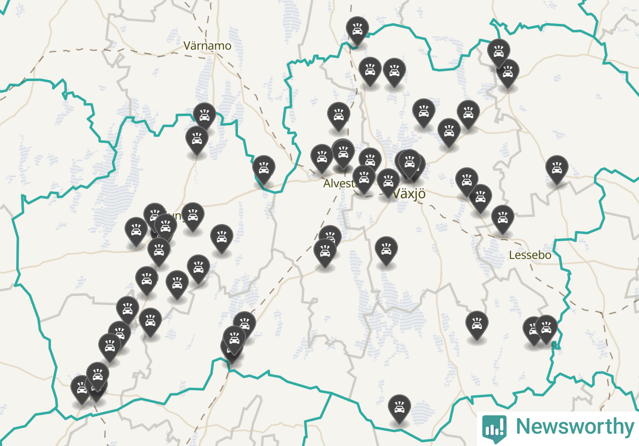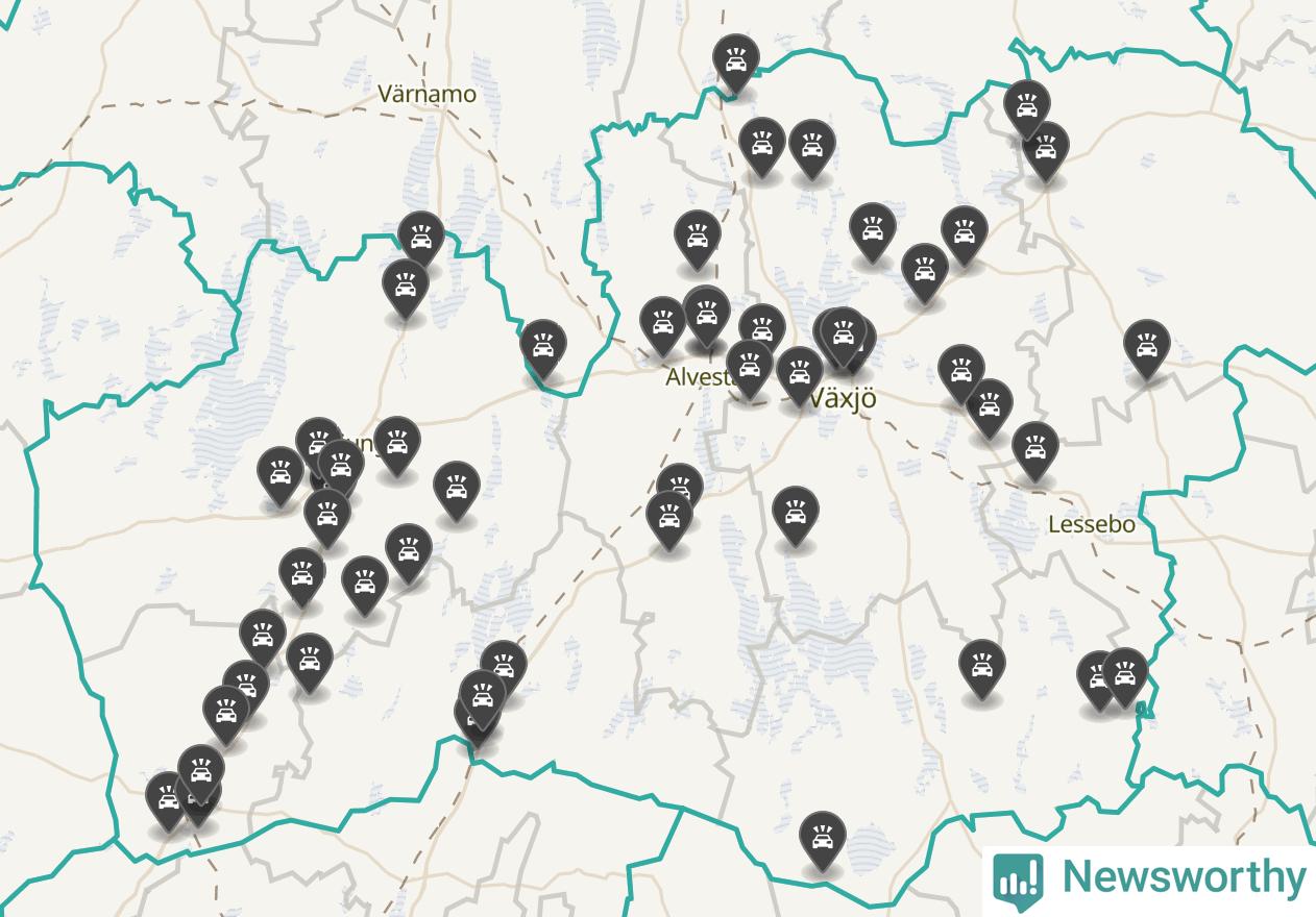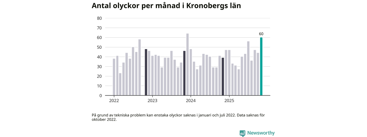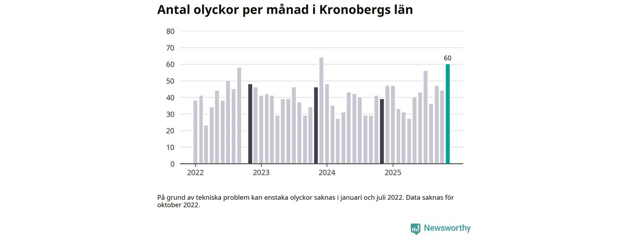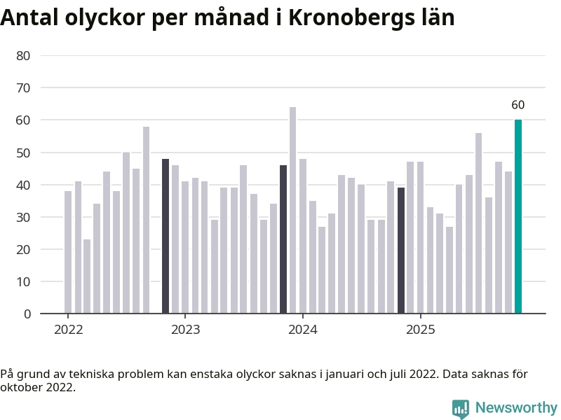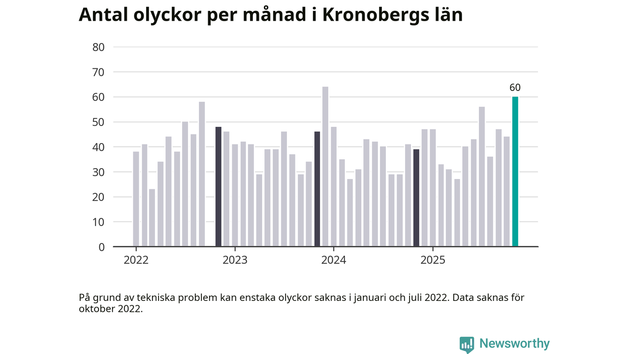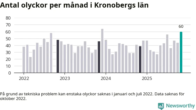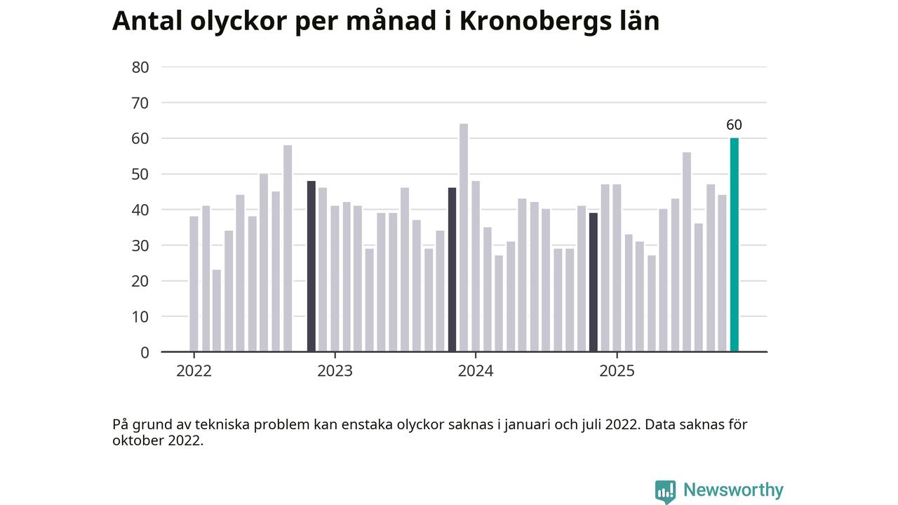 I Kronobergs län var trafikolyckorna fler än under samma månad i fjol: 60 olyckor längs de stora vägarna i länet. Det visar data från Trafikverket som Newsworthy sammanställt.
