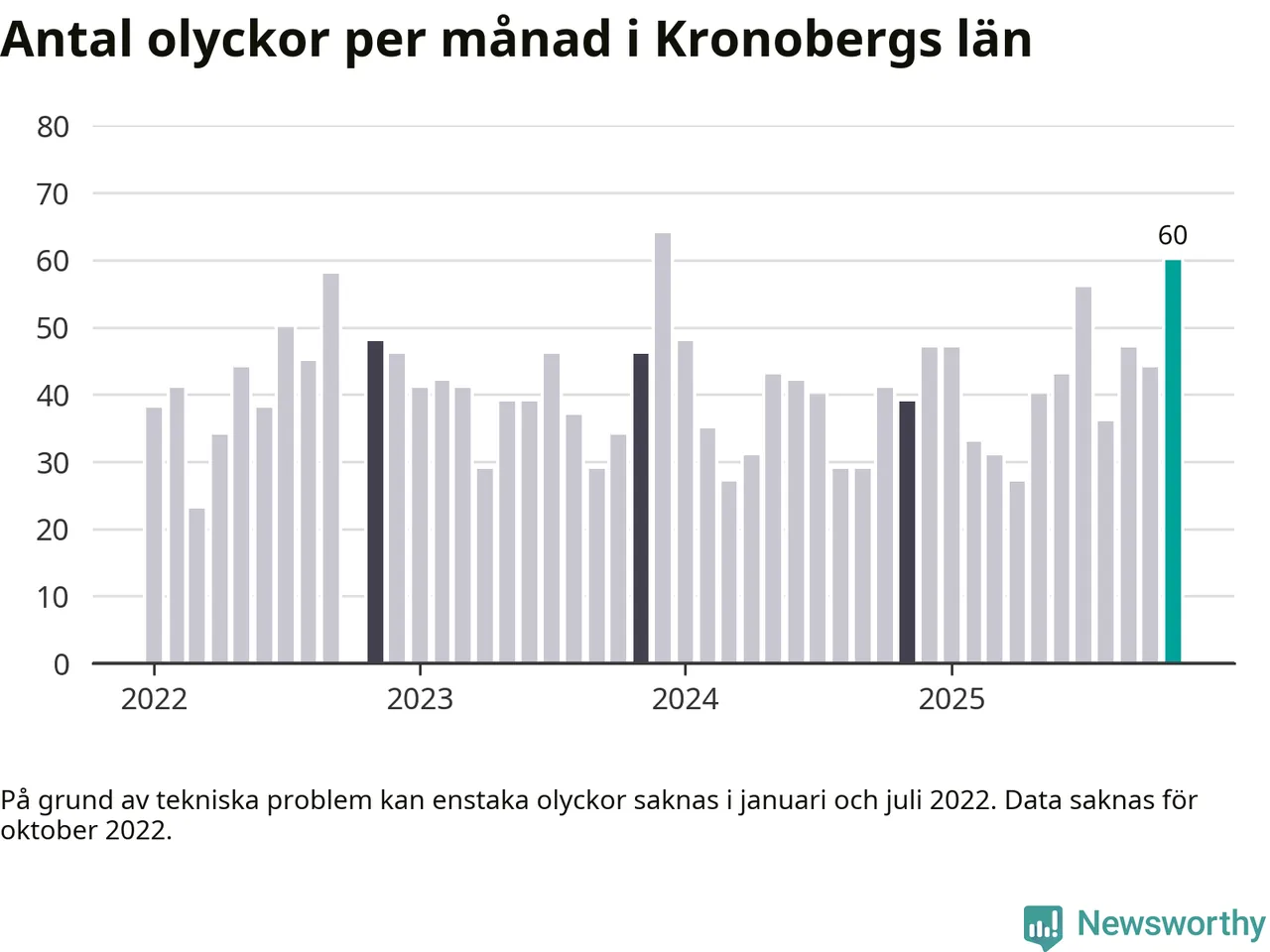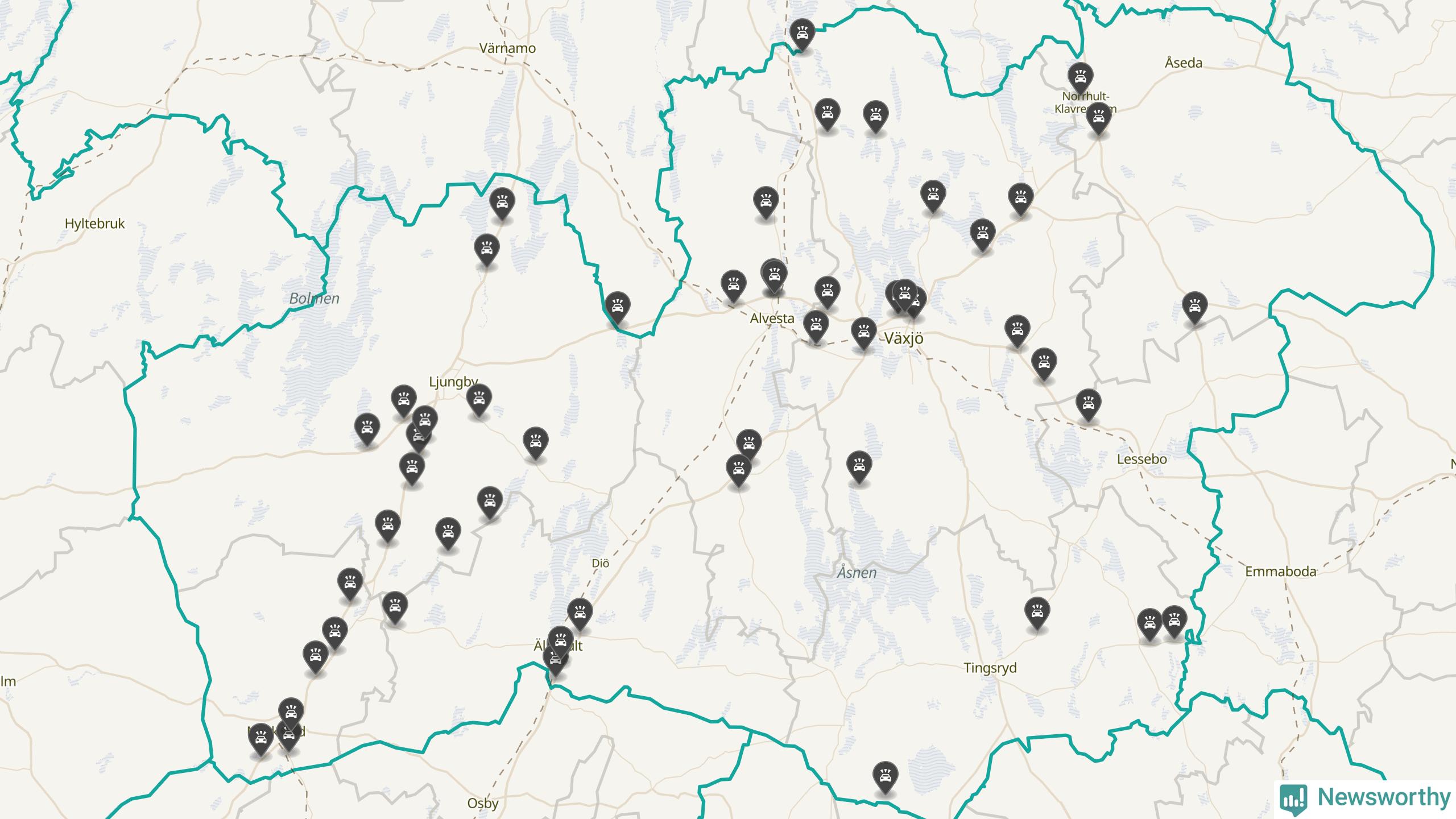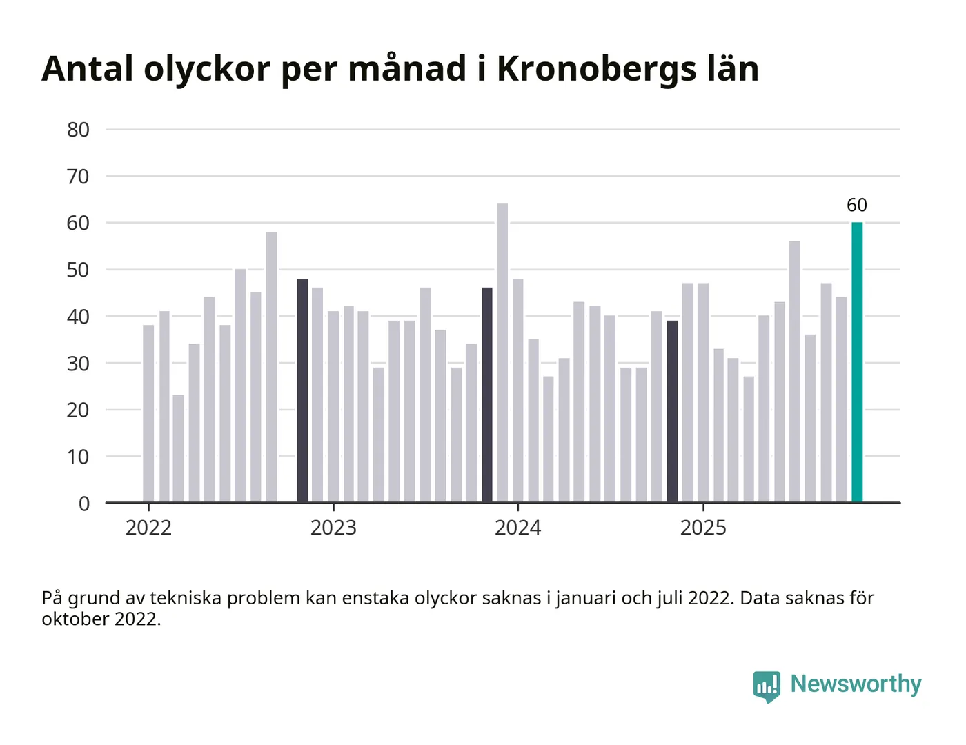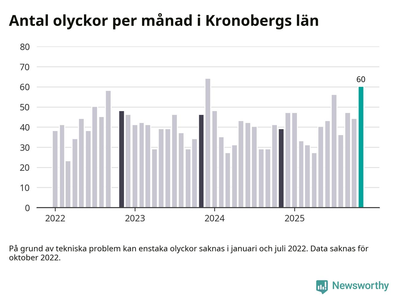 I Kronobergs län var trafikolyckorna fler än under samma månad i fjol: 60 olyckor längs de stora vägarna i länet. Det visar data från Trafikverket som Newsworthy sammanställt.