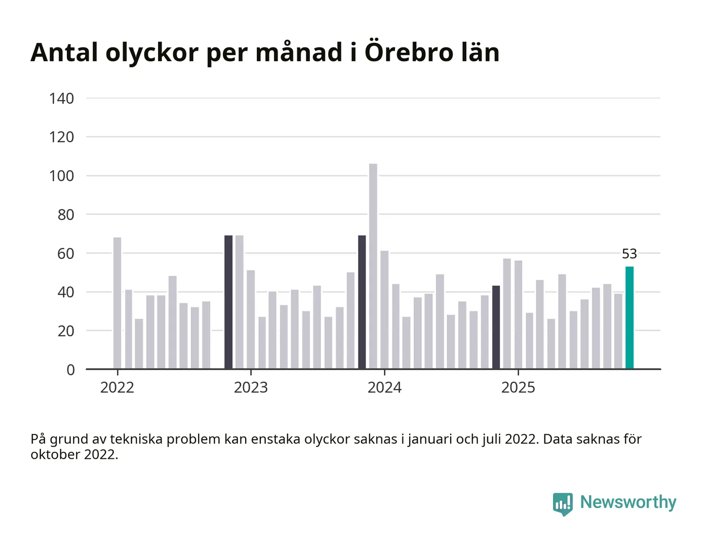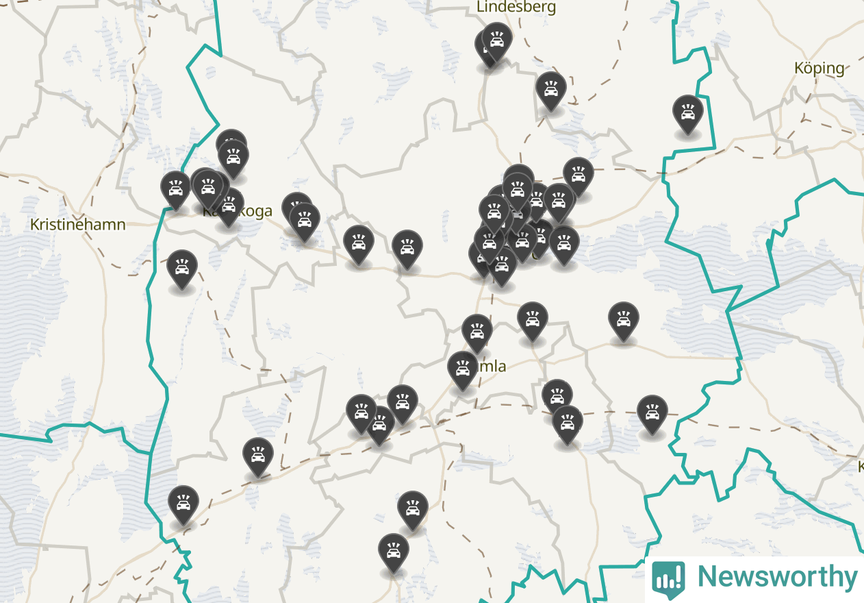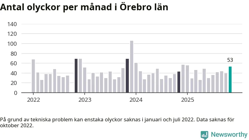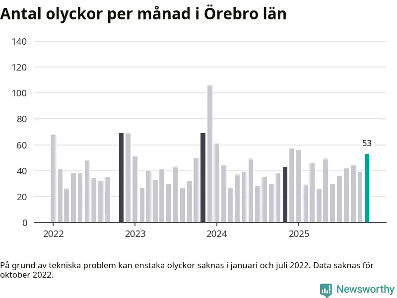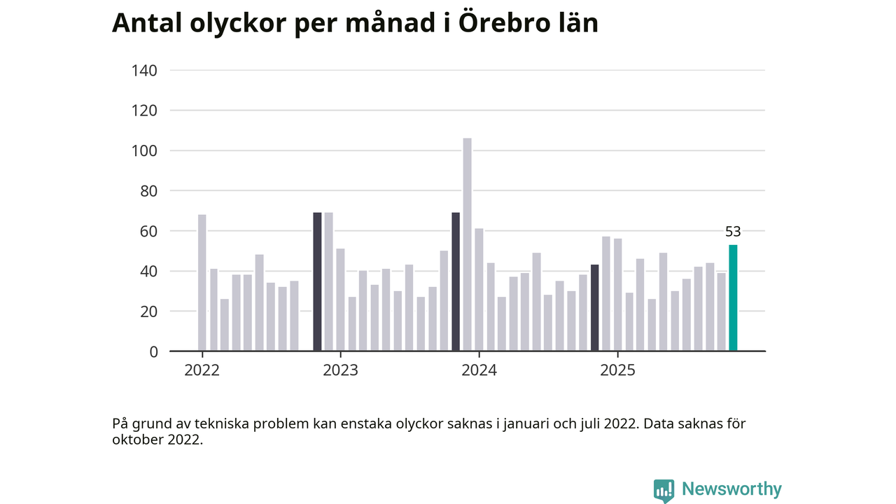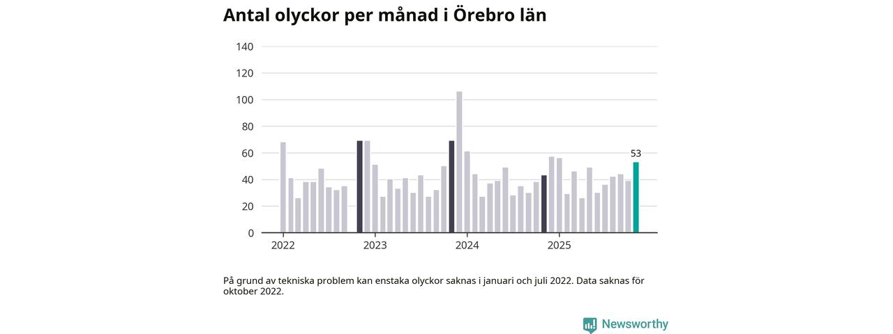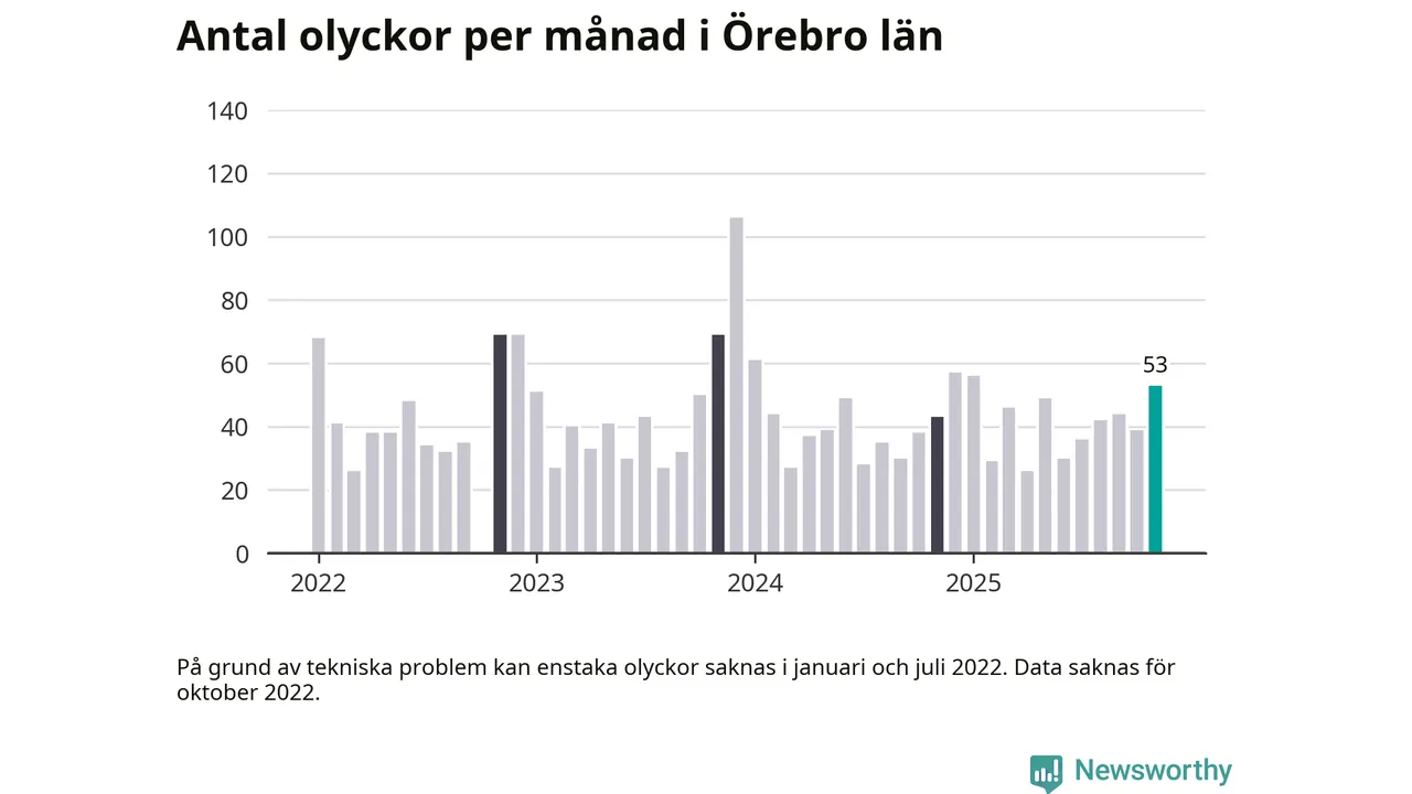 I Örebro län var trafikolyckorna fler än under samma månad i fjol: 53 olyckor längs de stora vägarna i länet. Det visar data från Trafikverket som Newsworthy sammanställt.