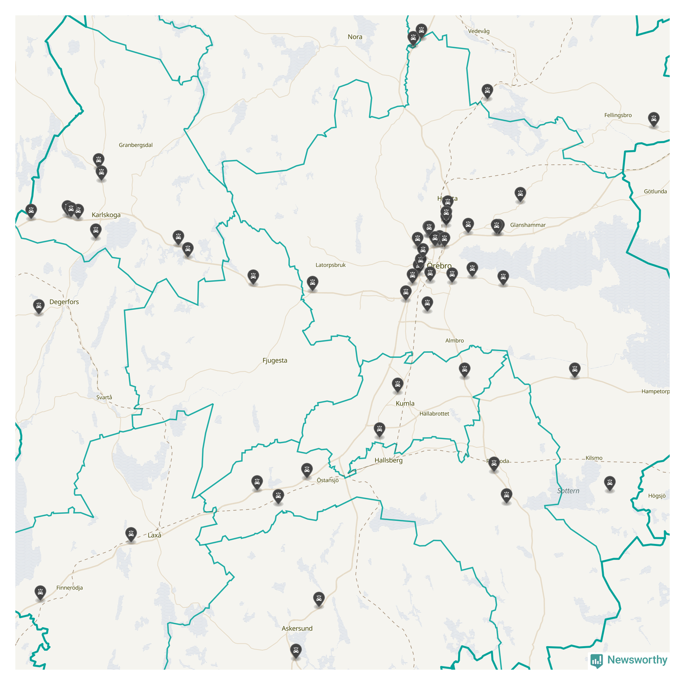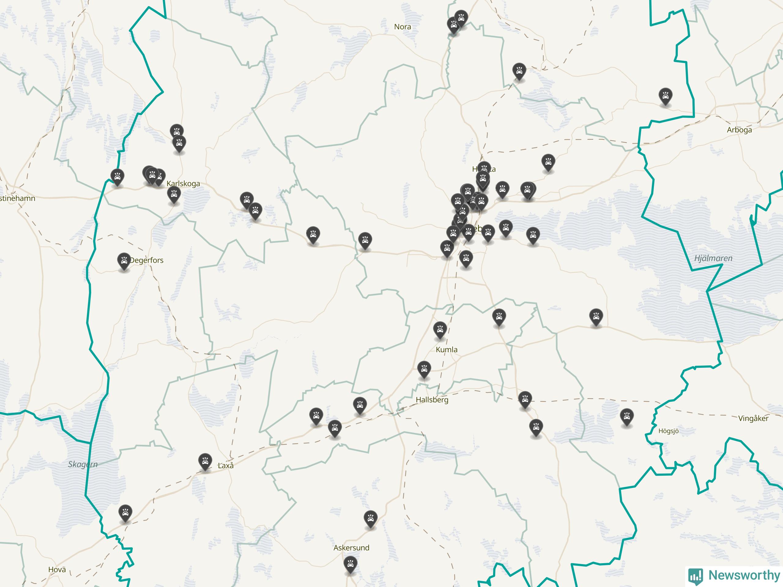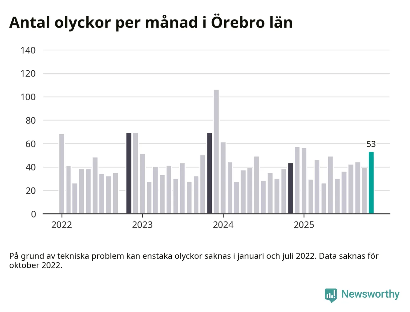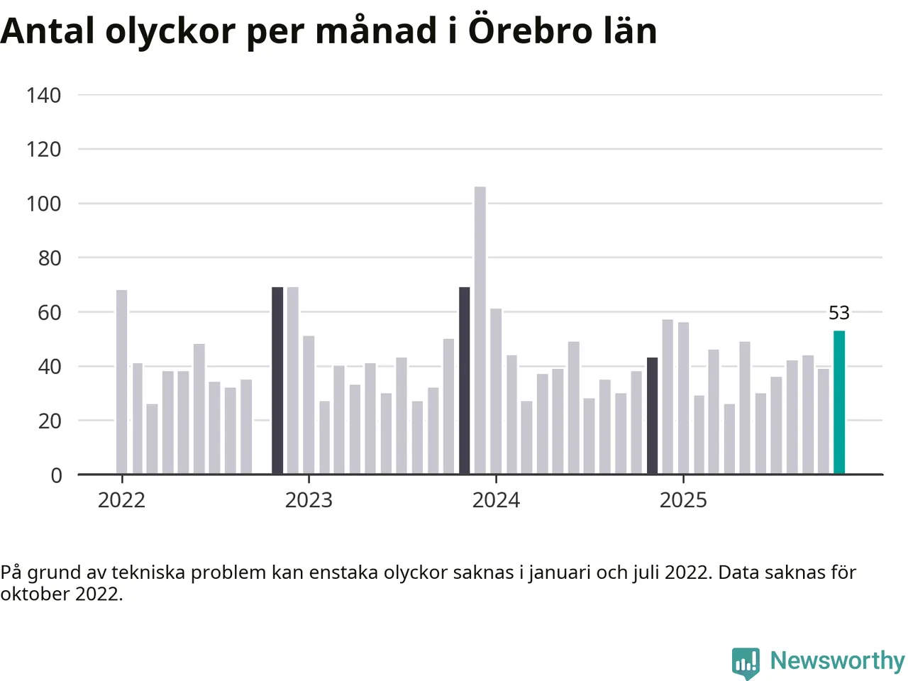 I Örebro län var trafikolyckorna fler än under samma månad i fjol: 53 olyckor längs de stora vägarna i länet. Det visar data från Trafikverket som Newsworthy sammanställt.