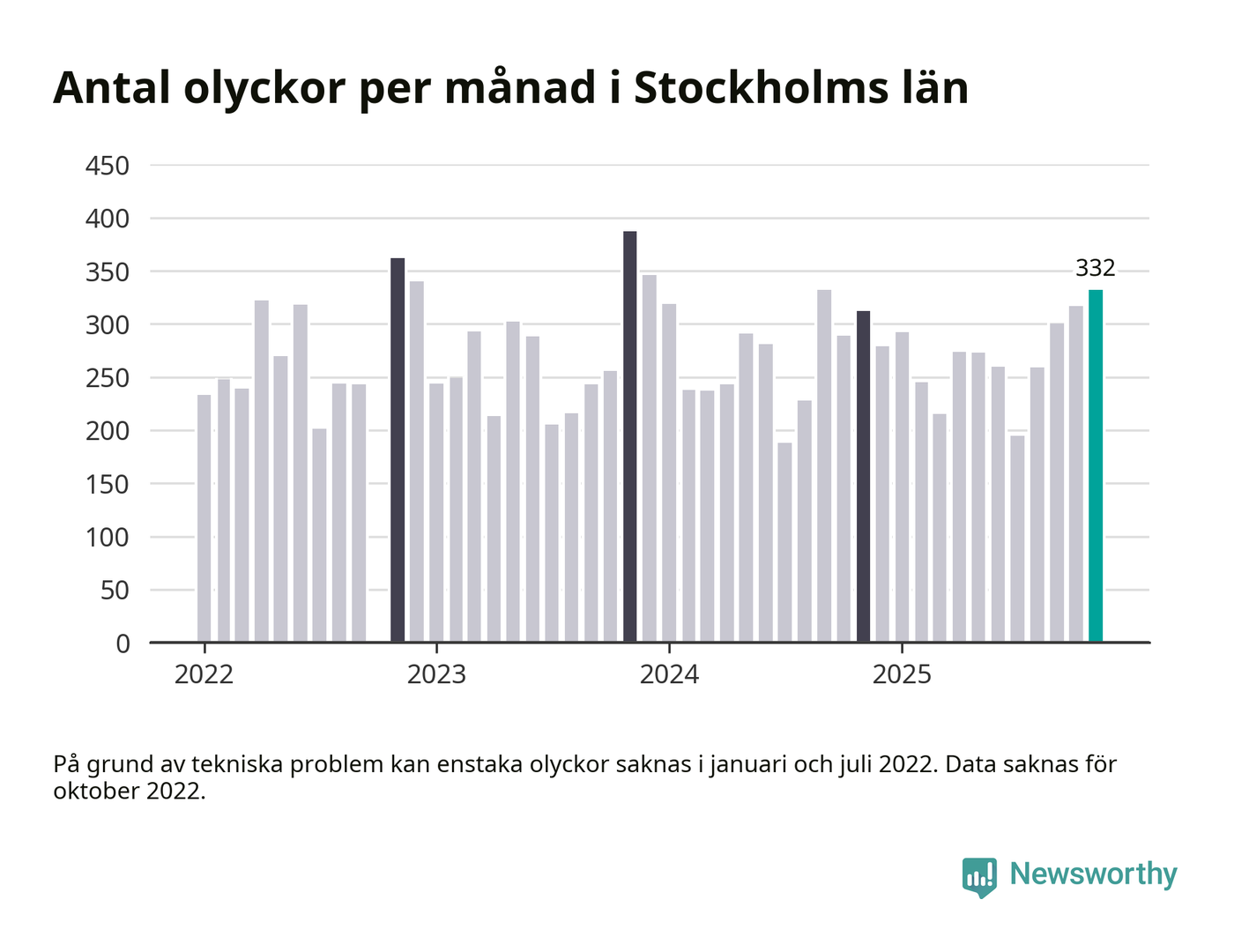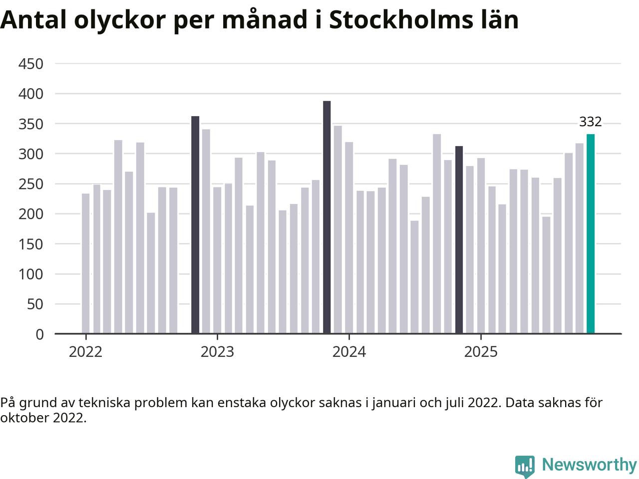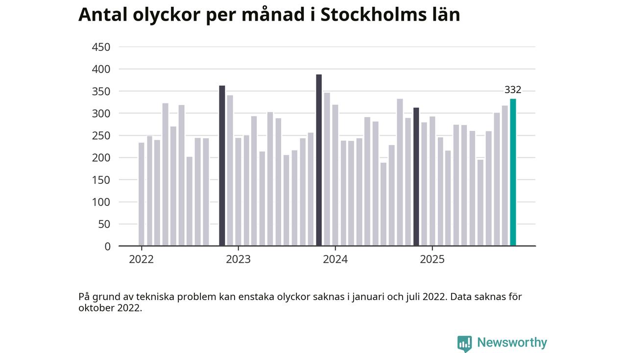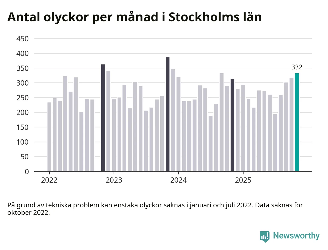 I Stockholms län rapporterades 332 längs de stora vägarna i länet under november, visar data från Trafikverket som Newsworthy sammanställt.