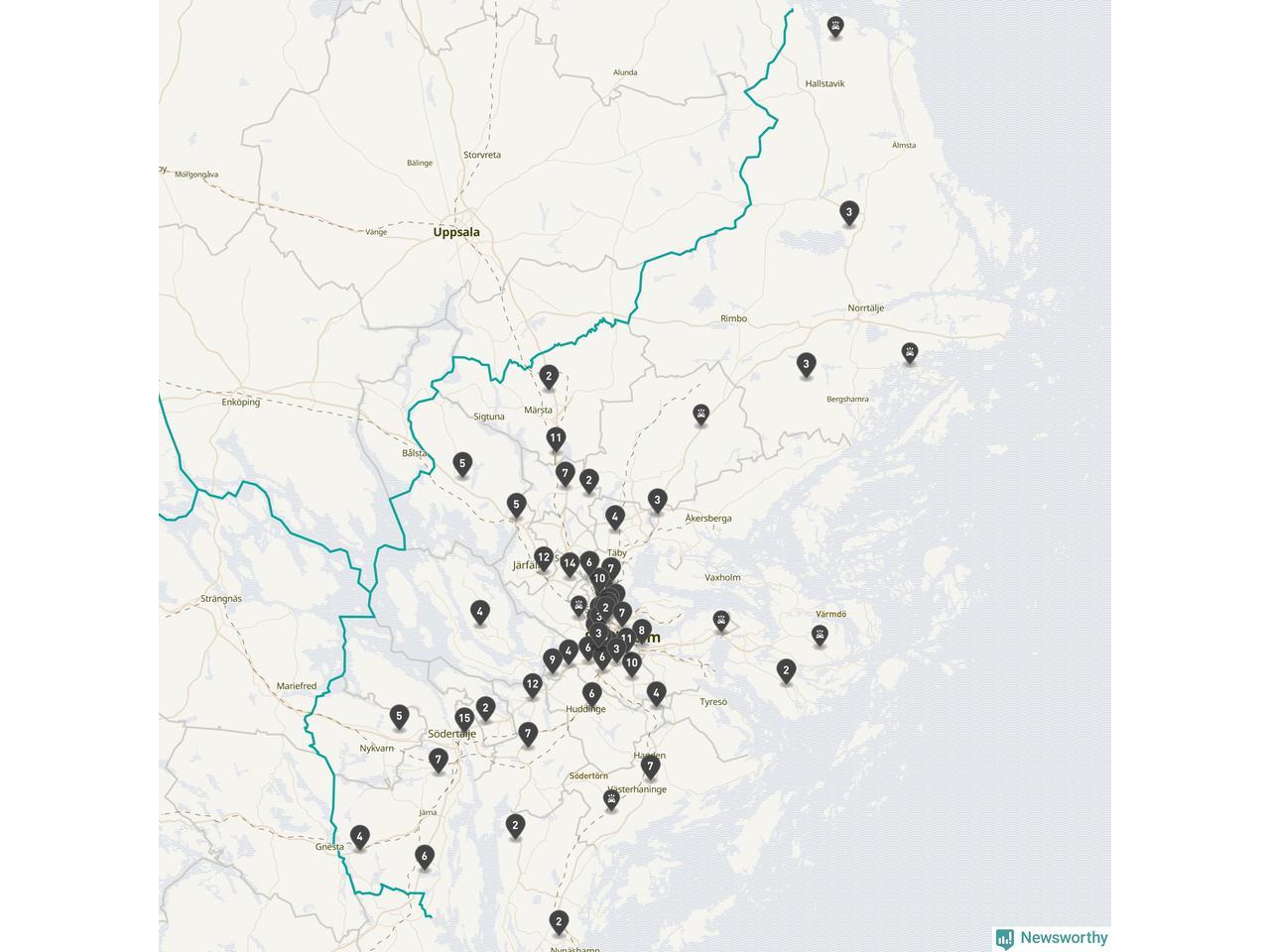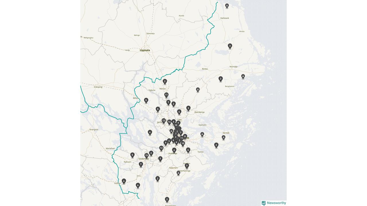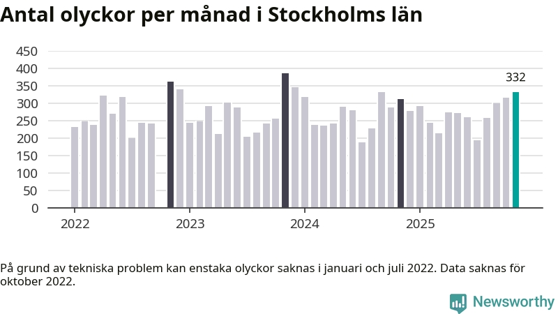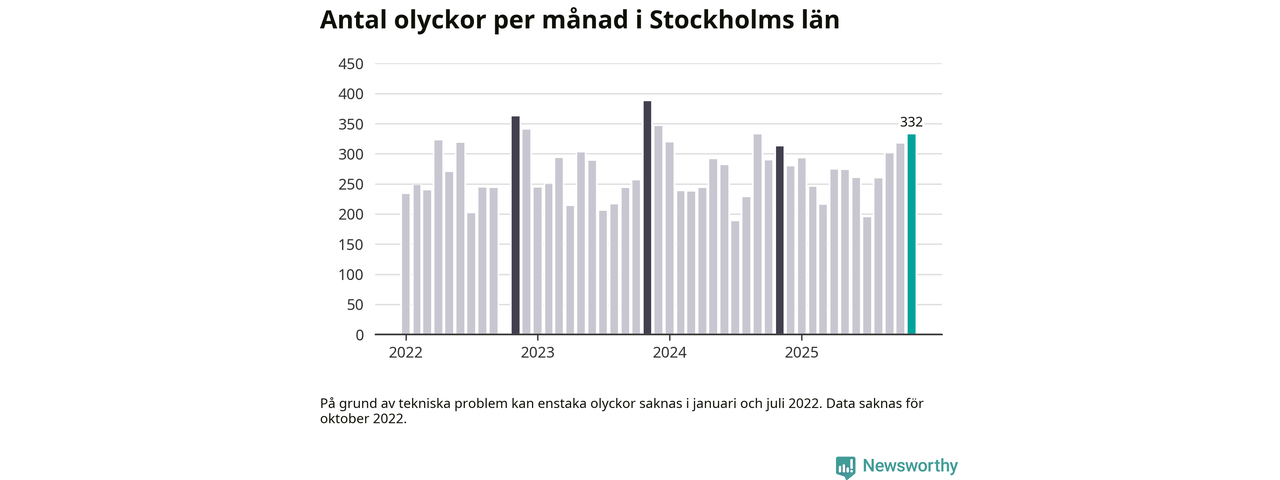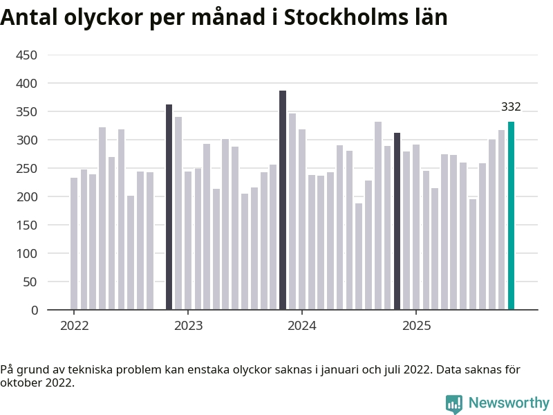 I Stockholms län rapporterades 332 längs de stora vägarna i länet under november, visar data från Trafikverket som Newsworthy sammanställt.