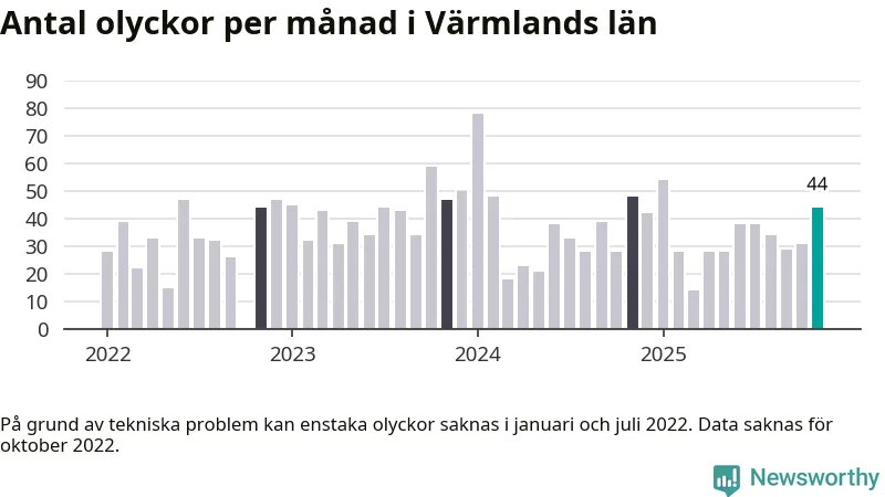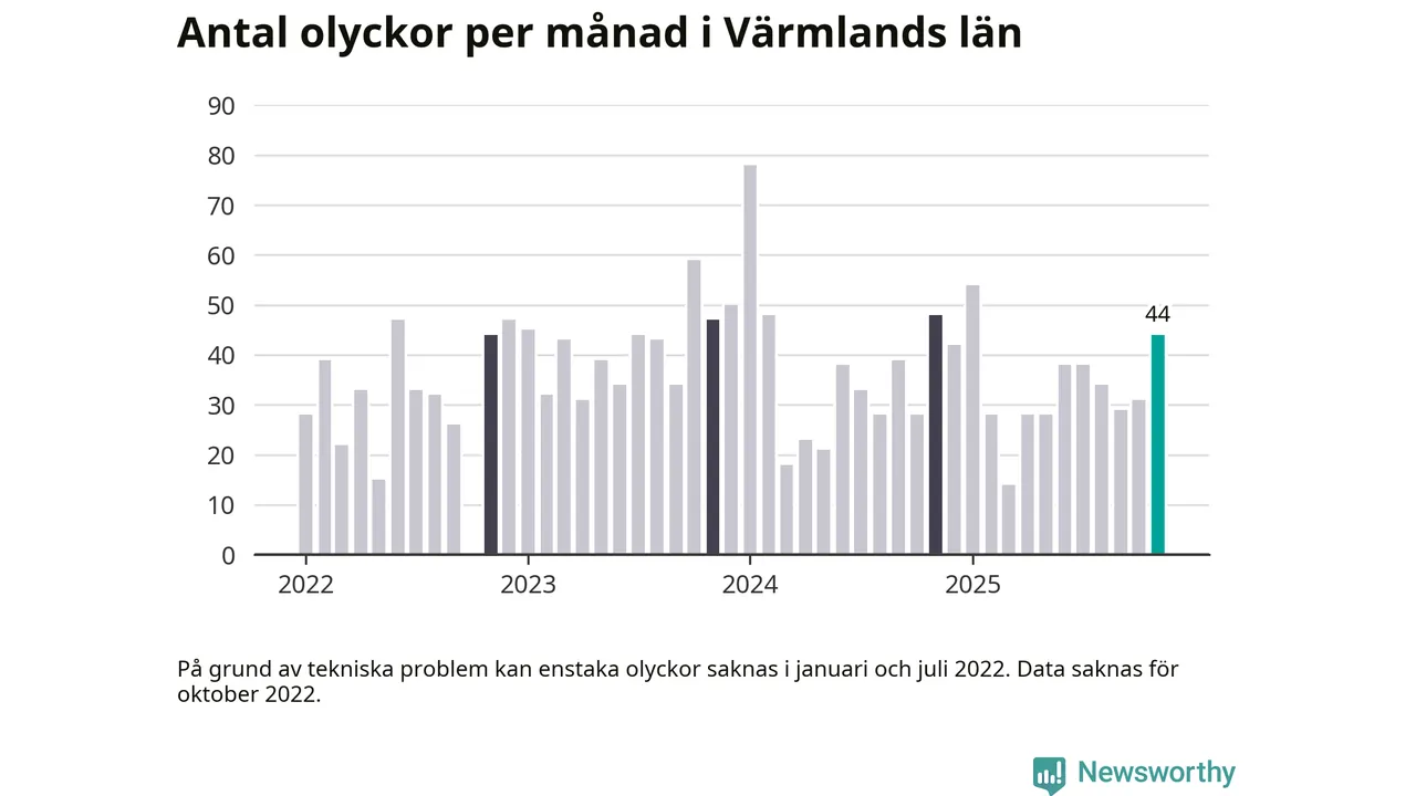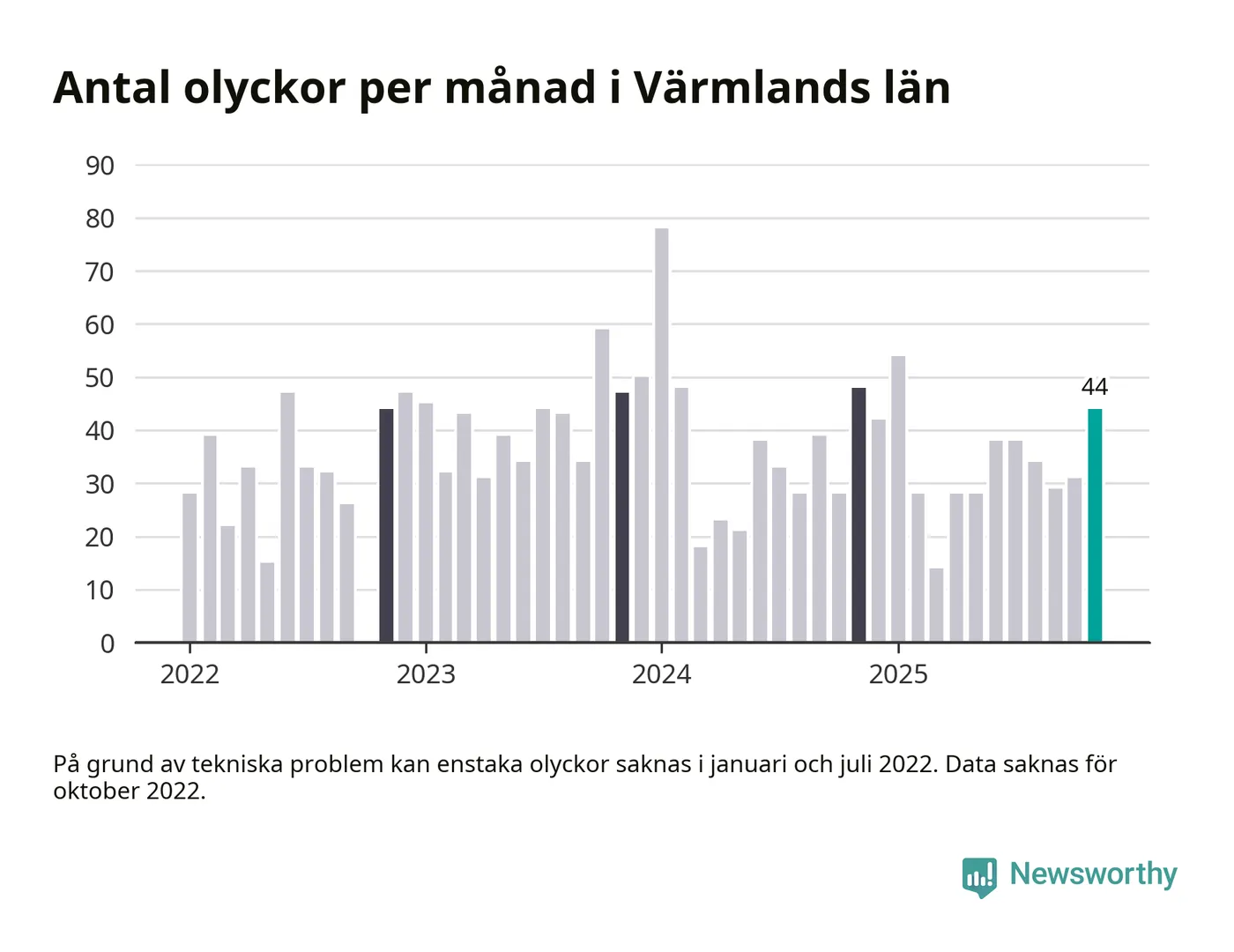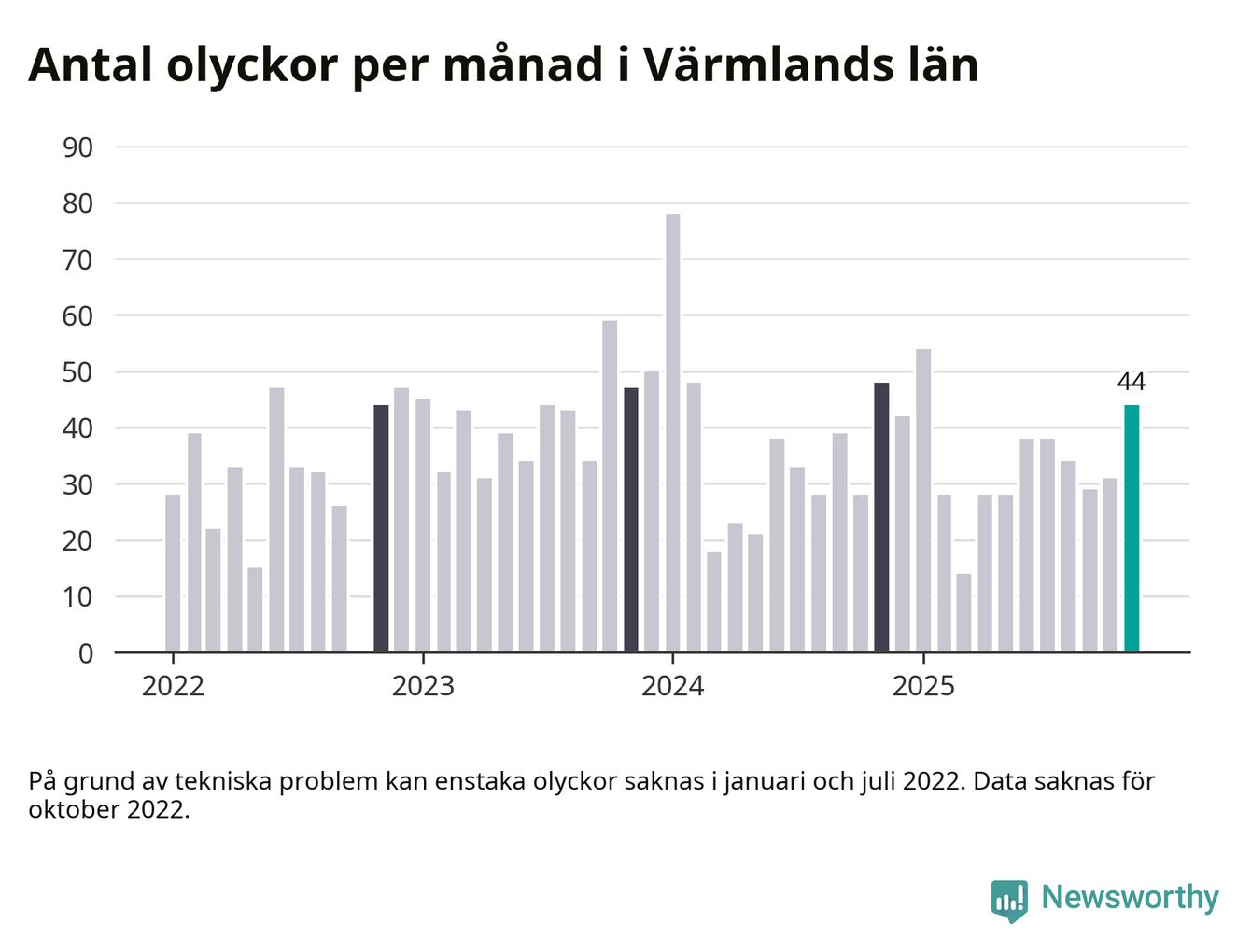 De senaste årens mest olycksdrabbade månad var januari i fjol, med 78 olyckor. I genomsnitt rapporteras omkring 33 olyckor per månad i länet, sedan början av 2022.
