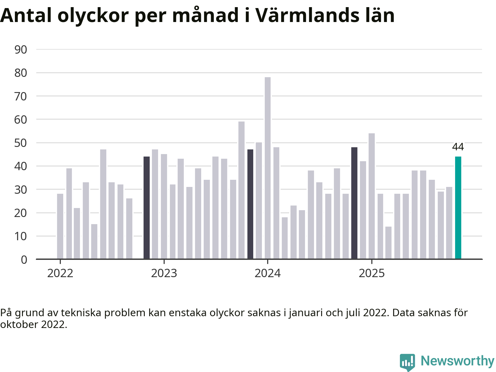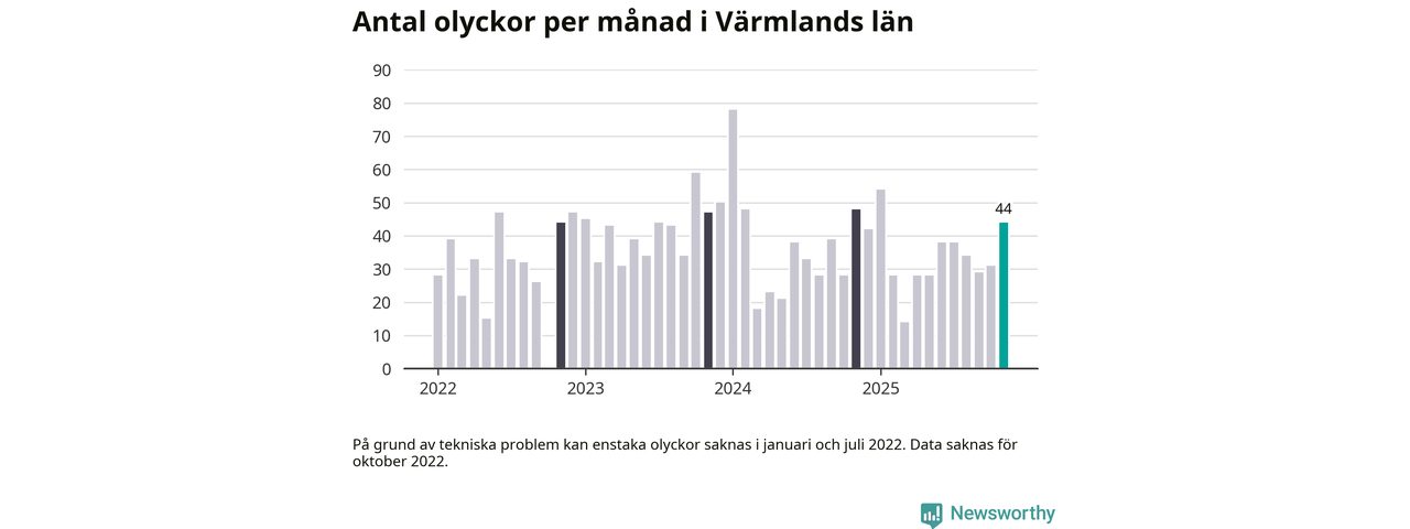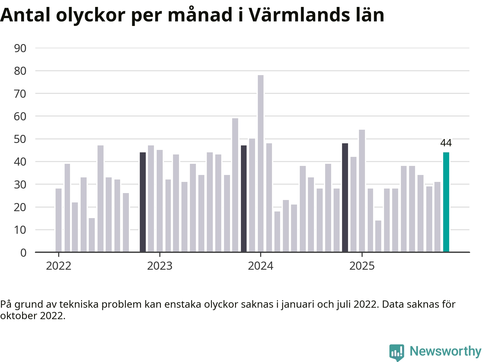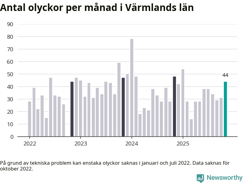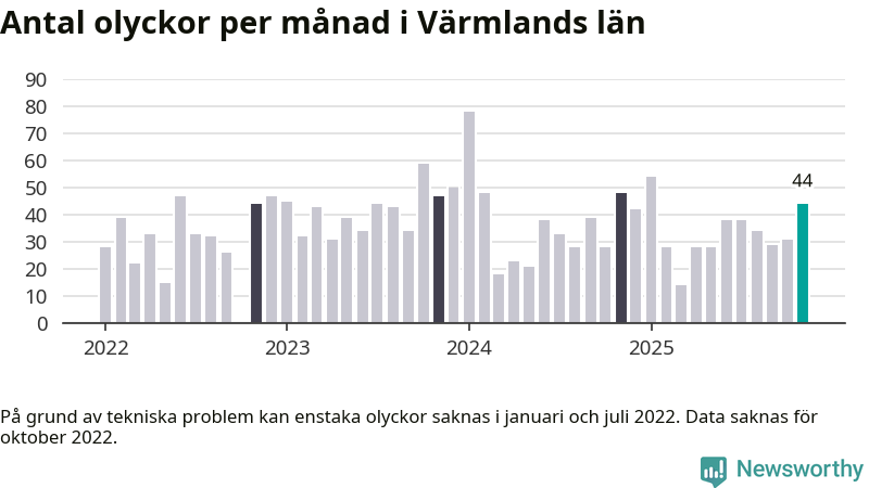 De senaste årens mest olycksdrabbade månad var januari i fjol, med 78 olyckor. I genomsnitt rapporteras omkring 33 olyckor per månad i länet, sedan början av 2022.