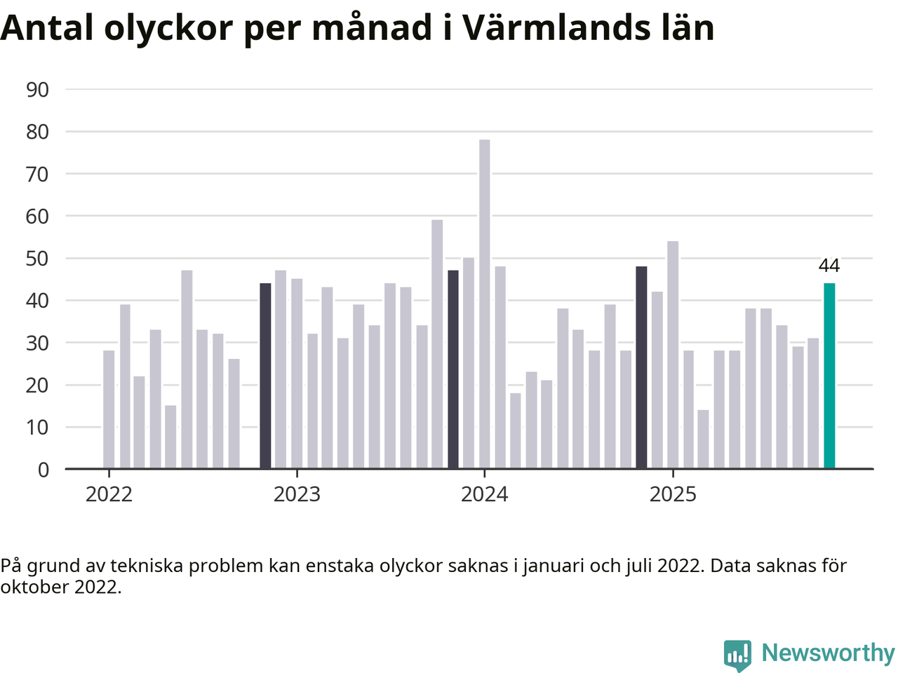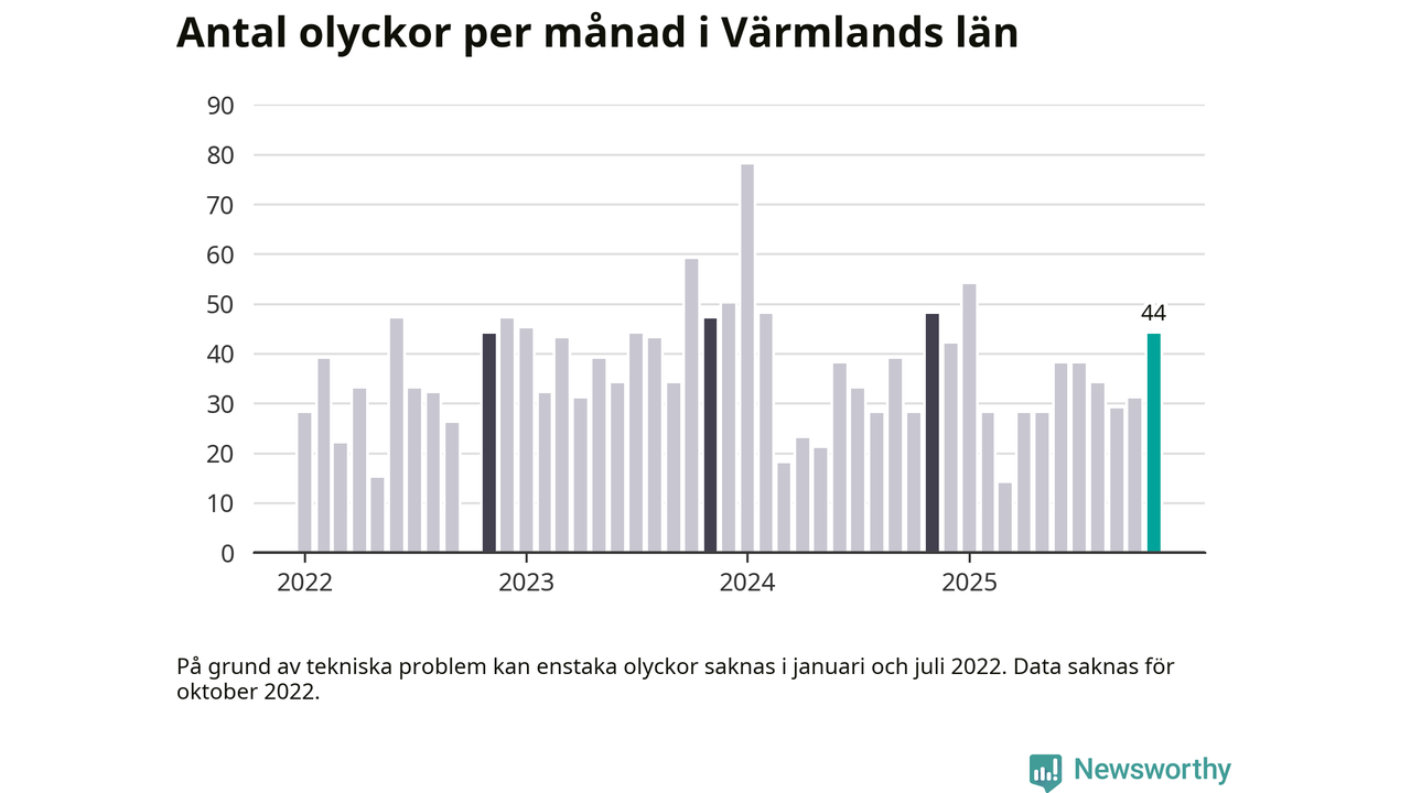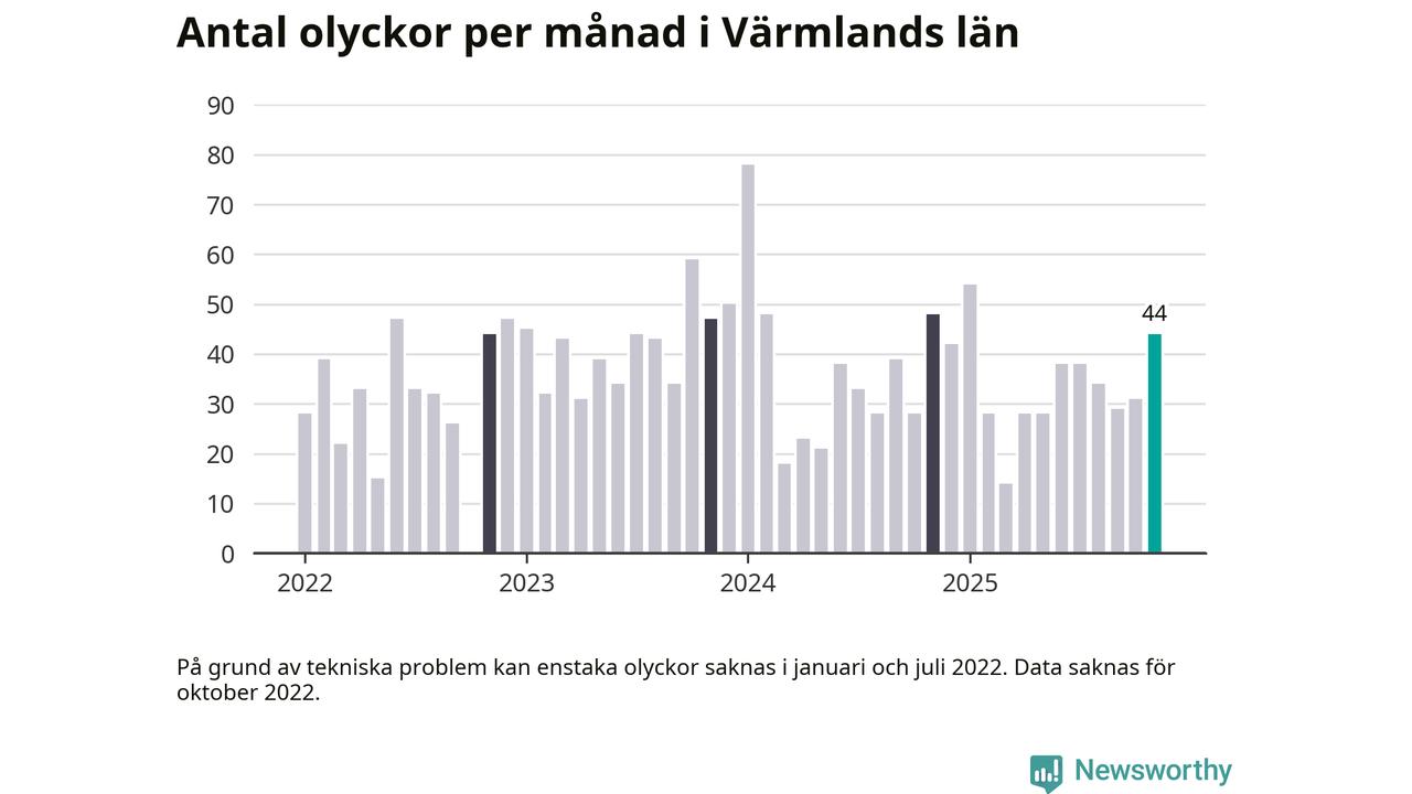 Under november 2025 rapporterades 44 trafikolyckor längs eller i anslutning till de stora, statliga vägarna i Värmland. Det är färre än samma månad i fjol. Nerbrutet per kommun rapporterades flest olyckor, fyra stycken, längs E18 genom Karlstads kommun. Det är samma mönster som under tidigare månader de senaste åren.