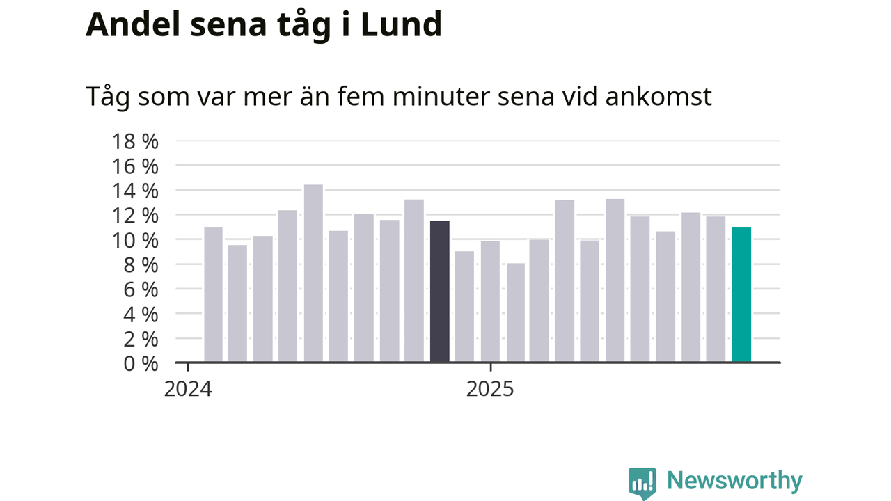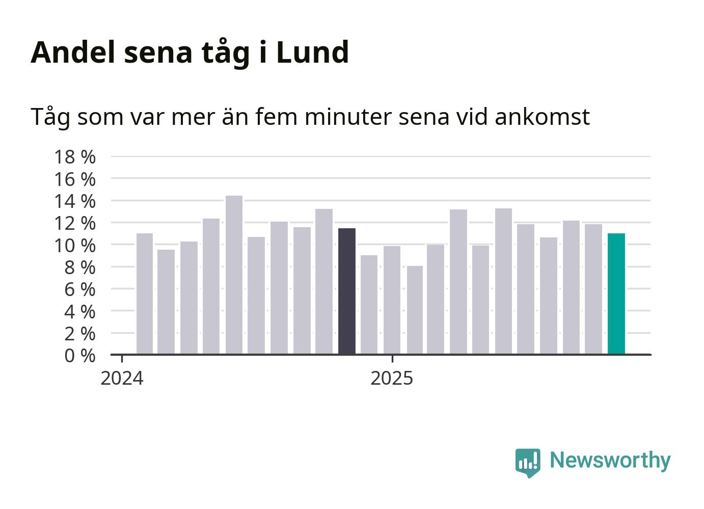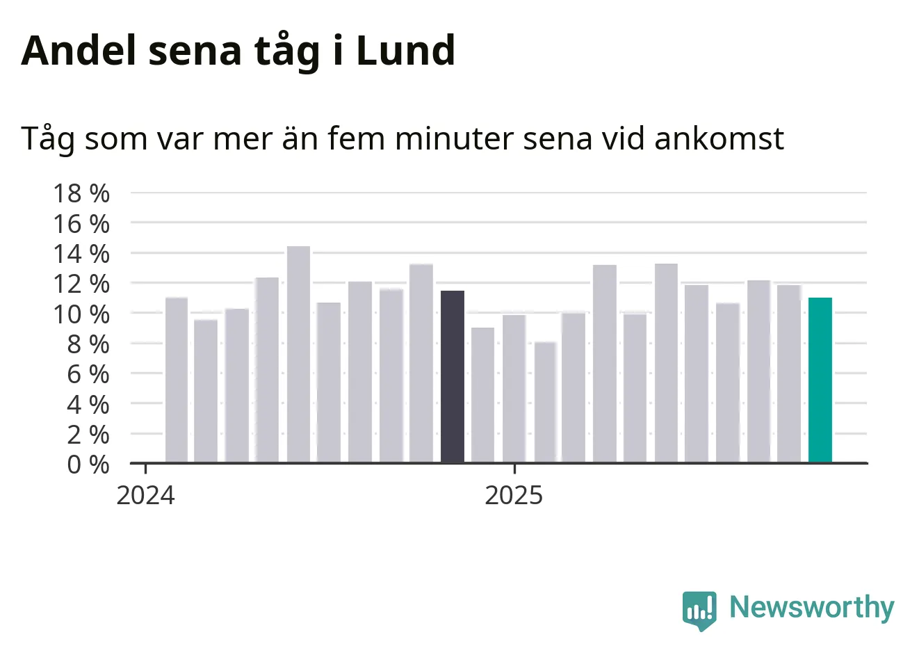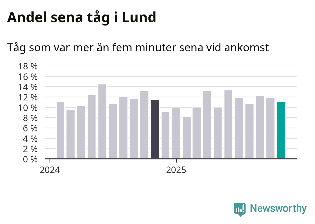 Elva procent kan jämföras med tolv procent månaden innan, och elva procent i november 2024. Siffrorna bygger på realtidsinformation om tågavgångar och ankomster från Trafikverket, som Newsworthy löpande samlar in.