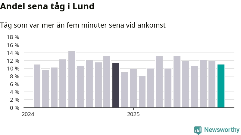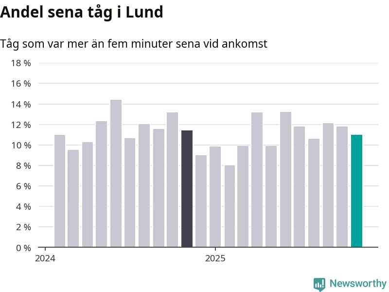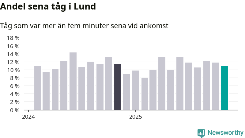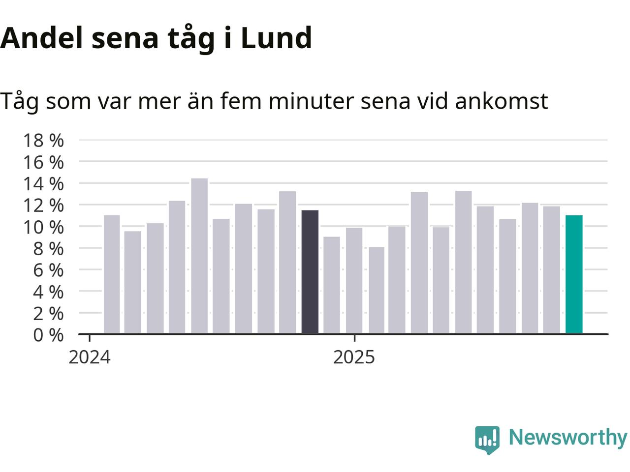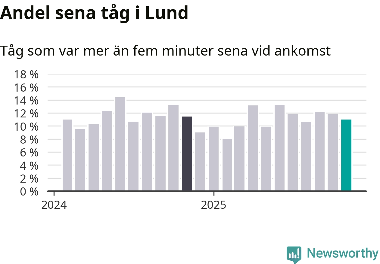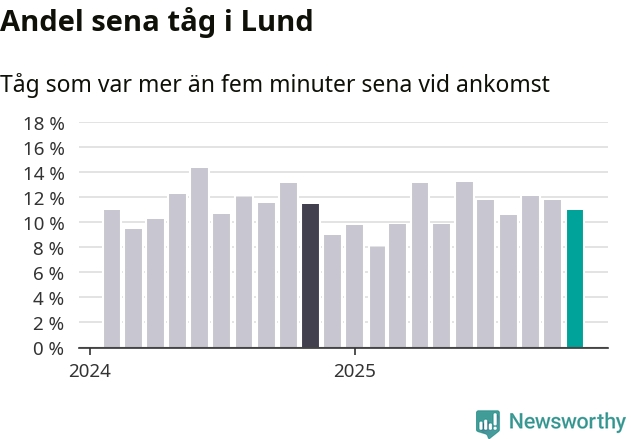 Elva procent kan jämföras med tolv procent månaden innan, och elva procent i november 2024. Siffrorna bygger på realtidsinformation om tågavgångar och ankomster från Trafikverket, som Newsworthy löpande samlar in.