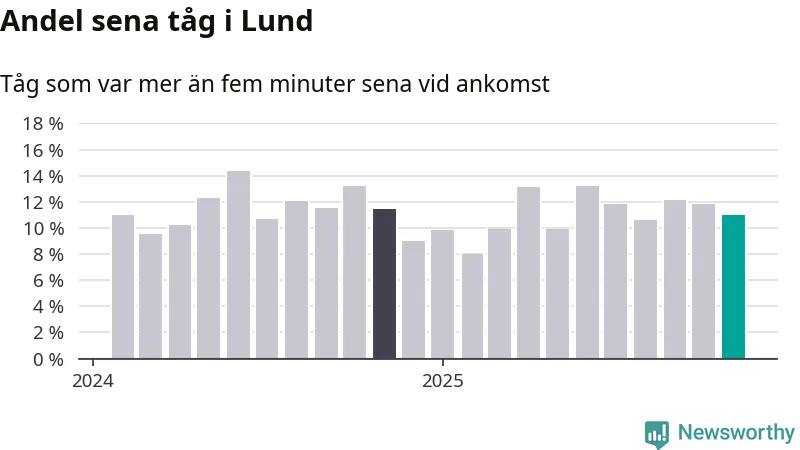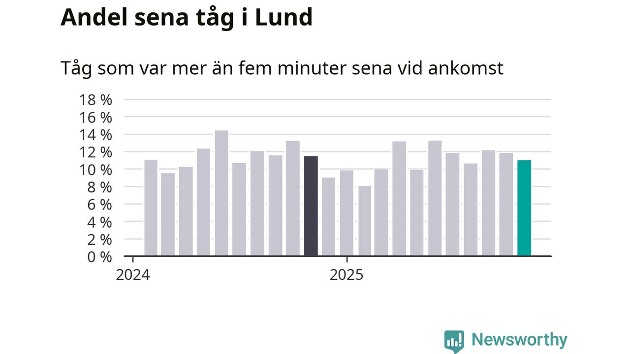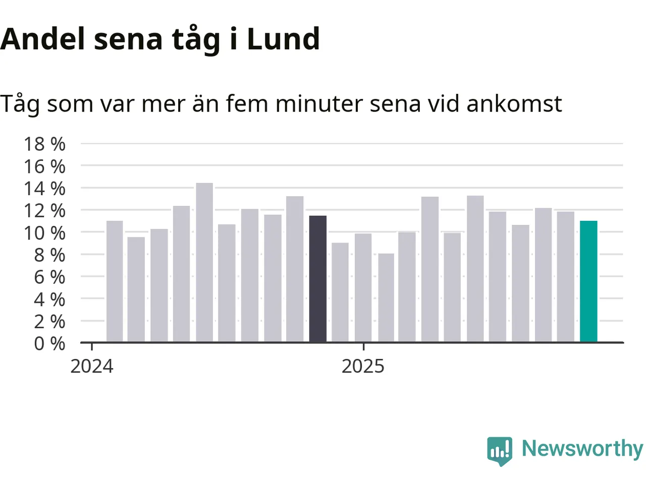 Av omkring 12 600 tåg som passerade någon av stationerna i Lunds kommun i november var 1 387 mer än fem minuter sena. Det motsvarar 11 procent, en bit över den nationella målsättningen som säger att inte mer än fem procent av tågen ska vara sena.