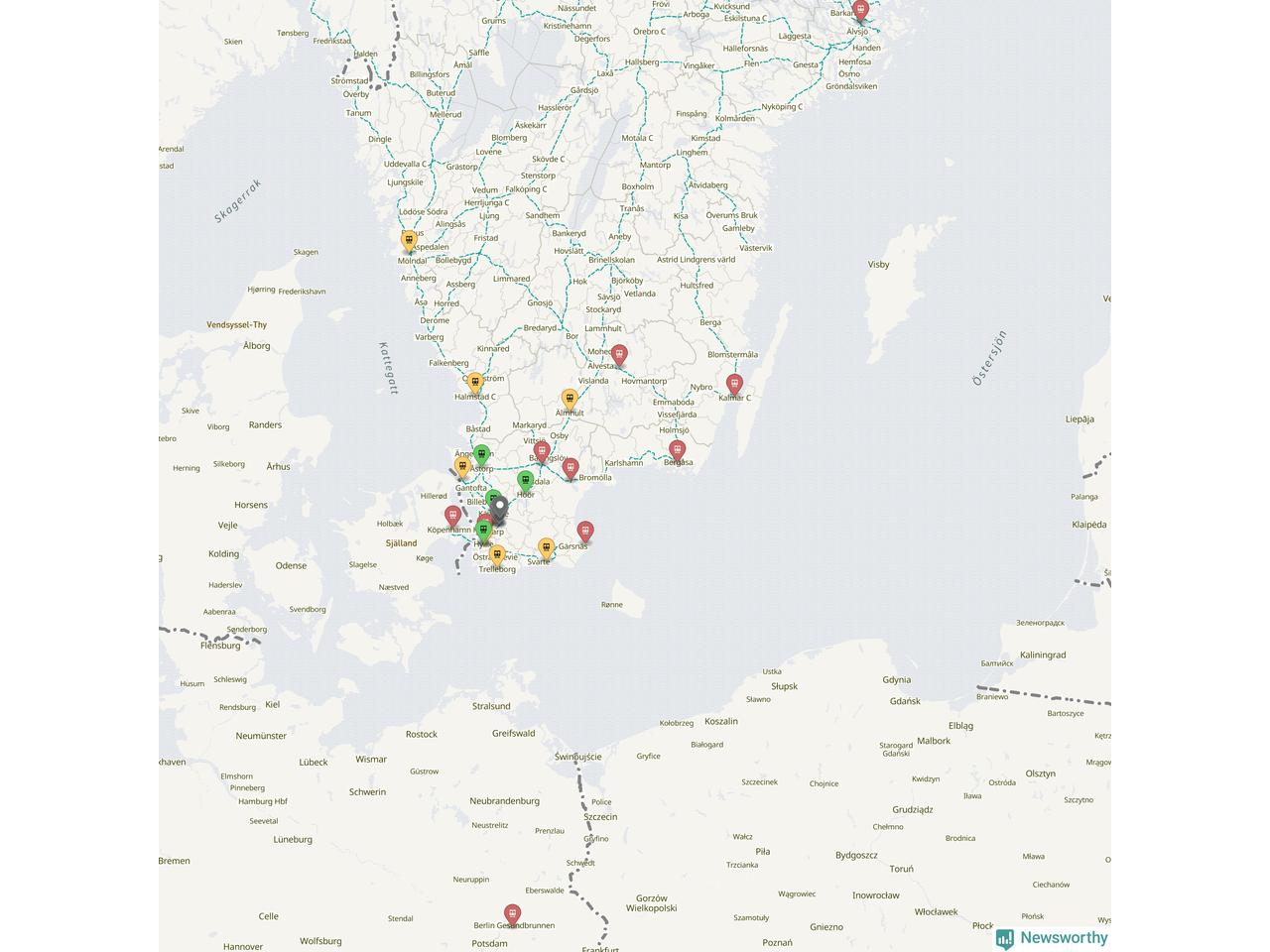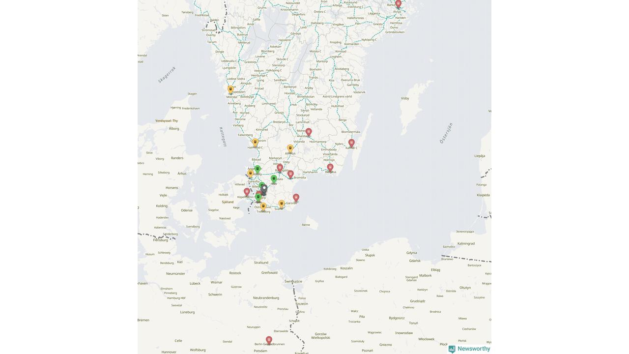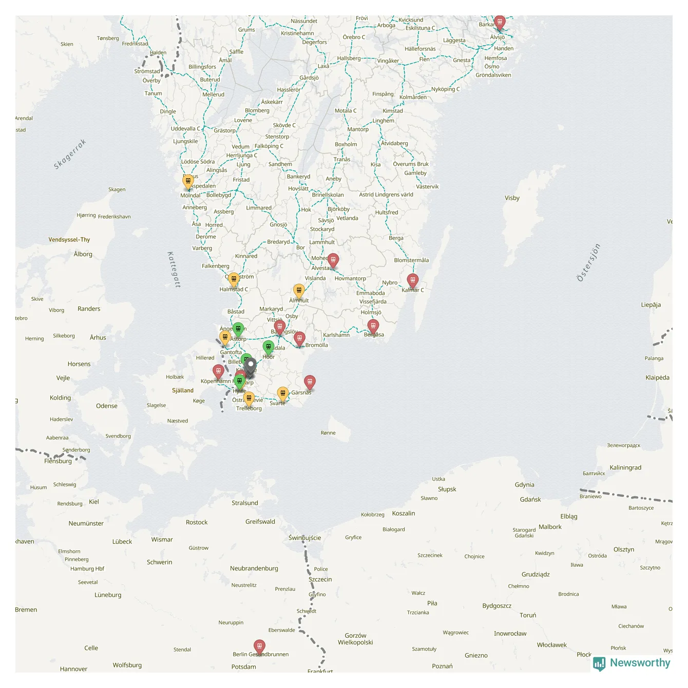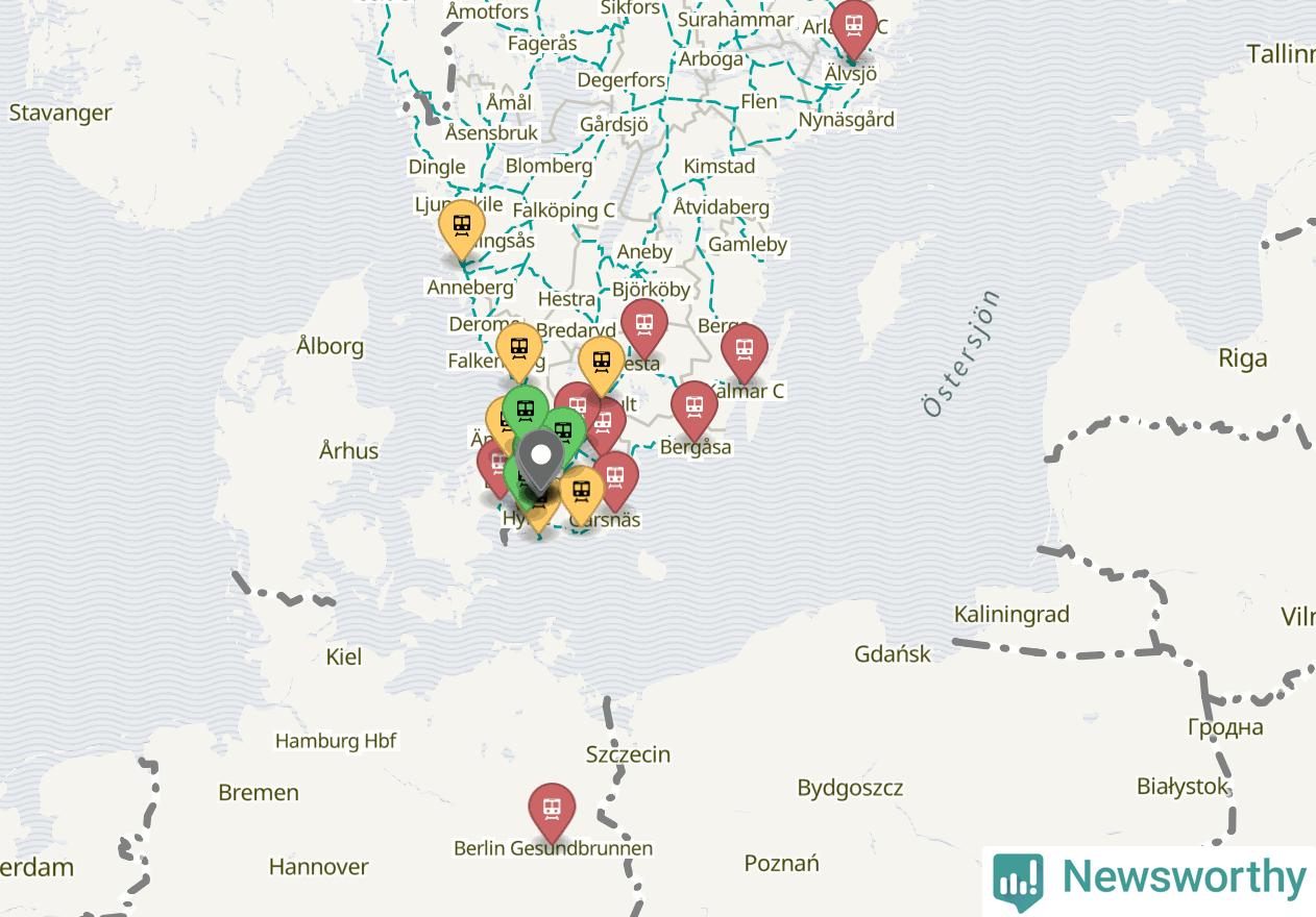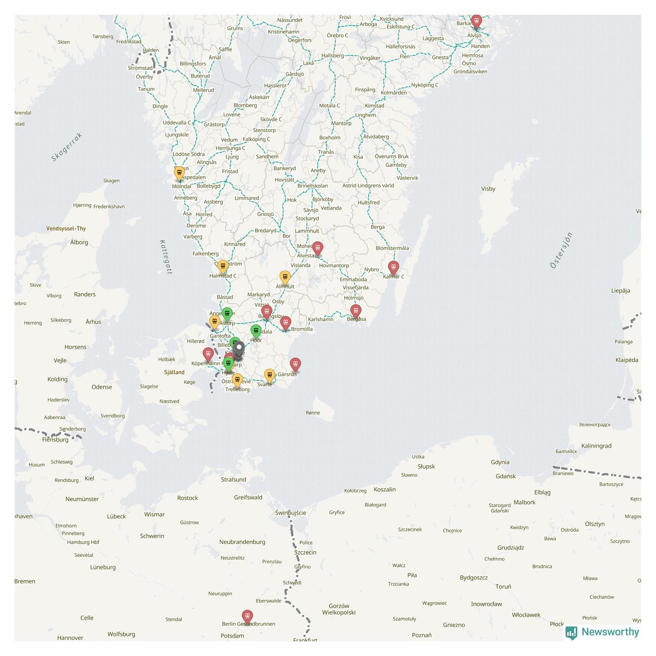 Kartdata från Mapbox, Newsworthy, OpenStreetMap och Trafikverket. Uppgifter om sträckor med passagerartrafik från jarnvag.net.