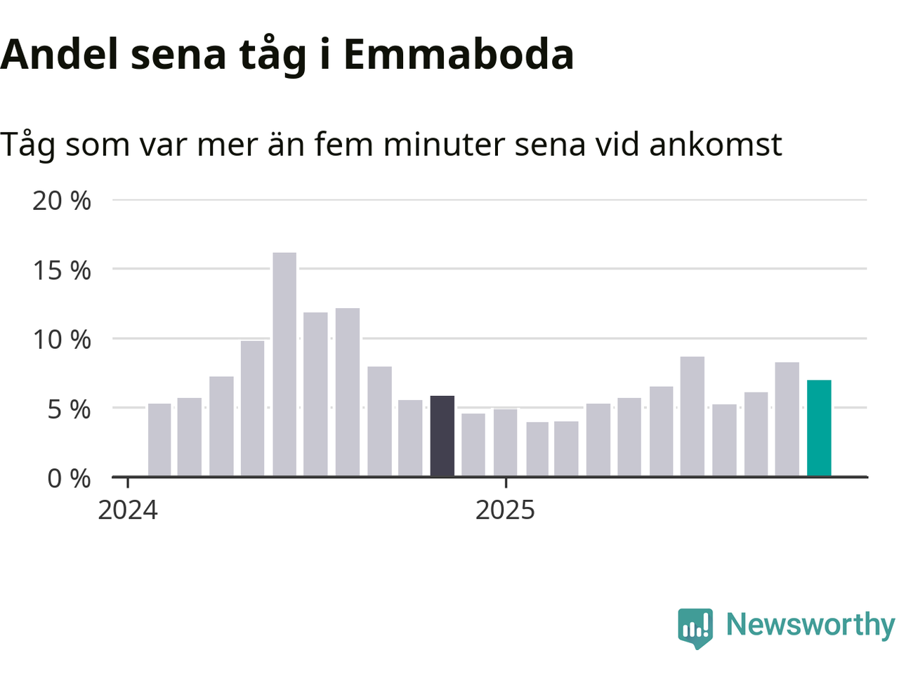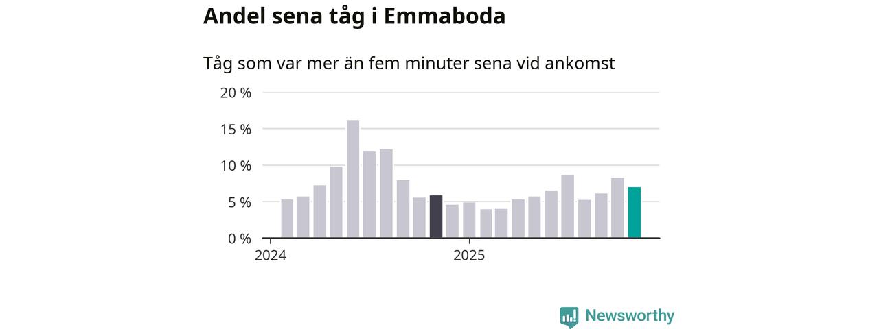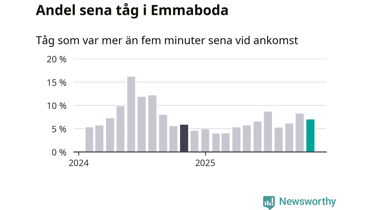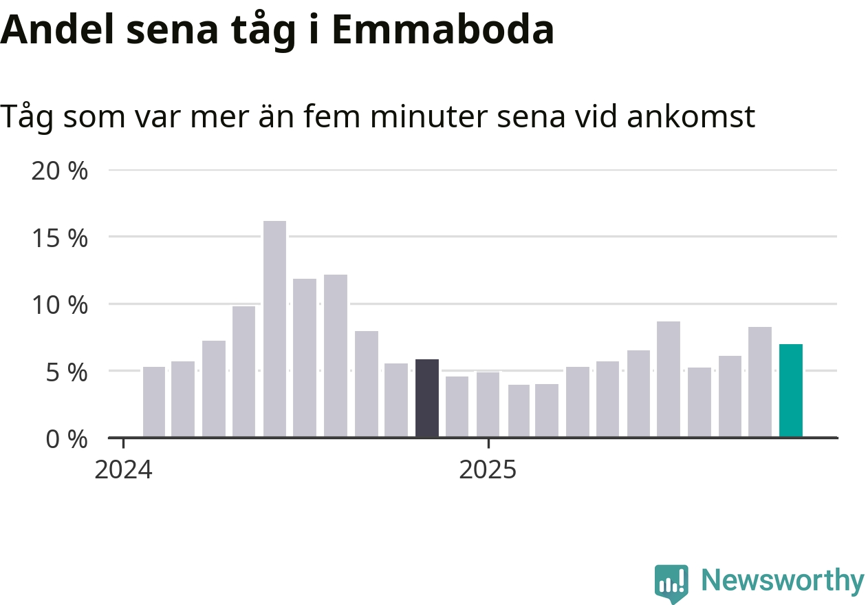 Sju procent kan jämföras med åtta procent månaden innan, och sex procent i november 2024. Siffrorna bygger på realtidsinformation om tågavgångar och ankomster från Trafikverket, som Newsworthy löpande samlar in.