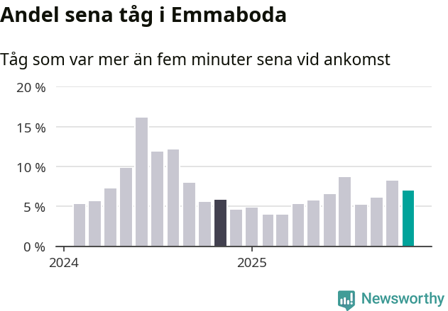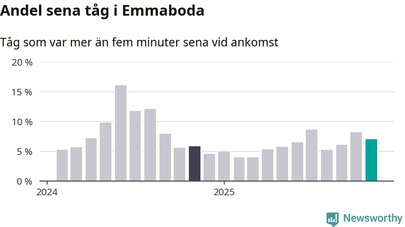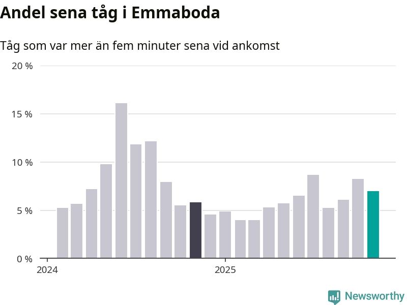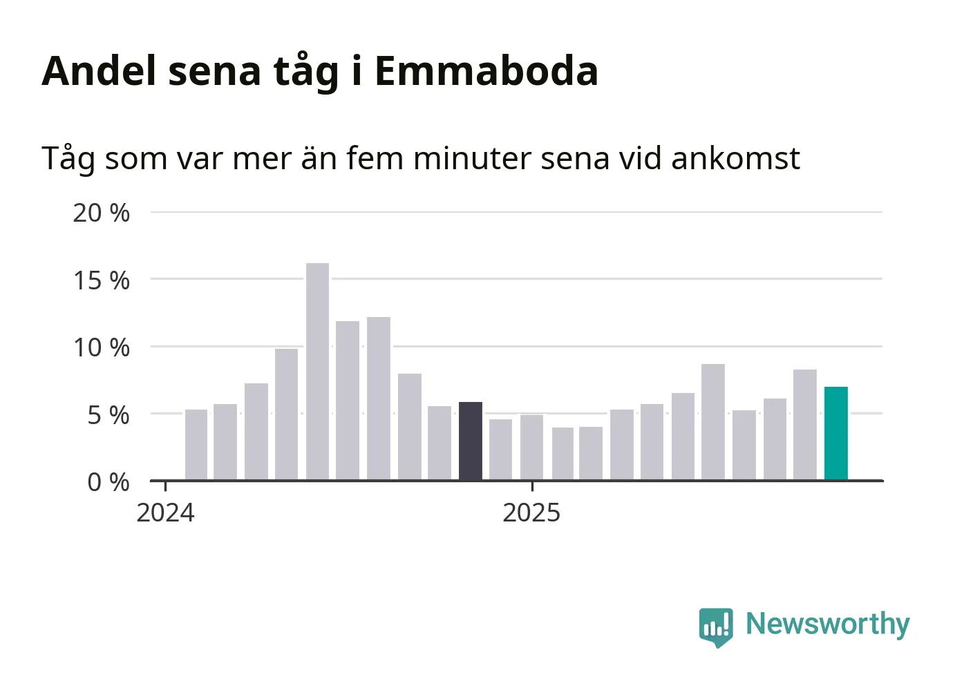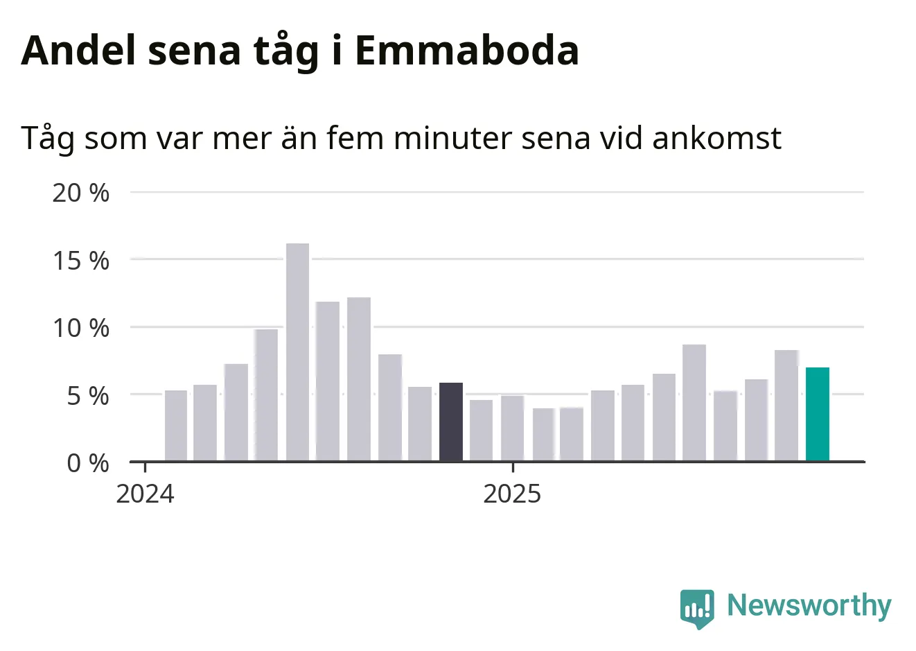 Sju procent kan jämföras med åtta procent månaden innan, och sex procent i november 2024. Siffrorna bygger på realtidsinformation om tågavgångar och ankomster från Trafikverket, som Newsworthy löpande samlar in.