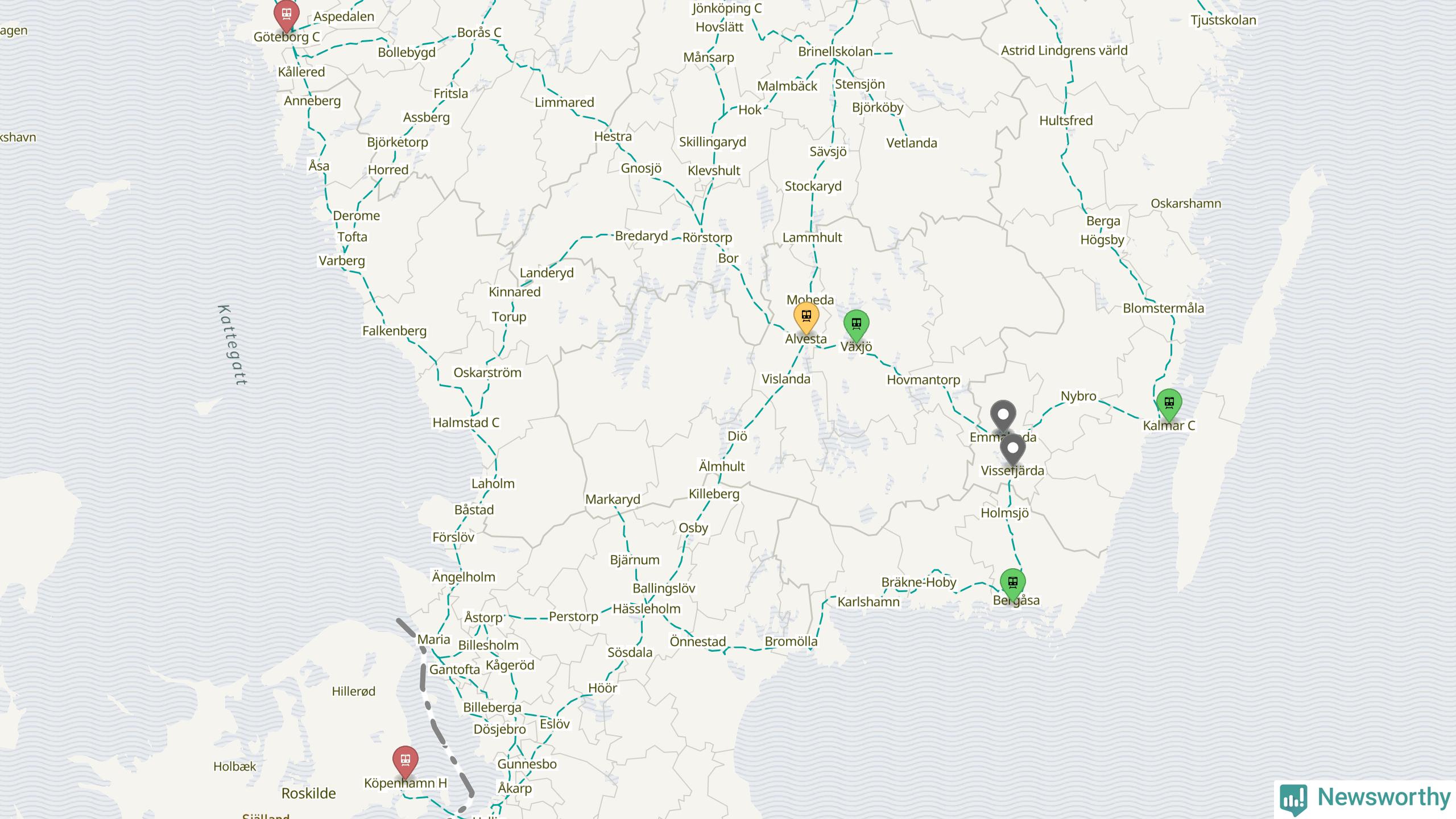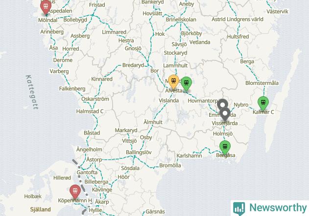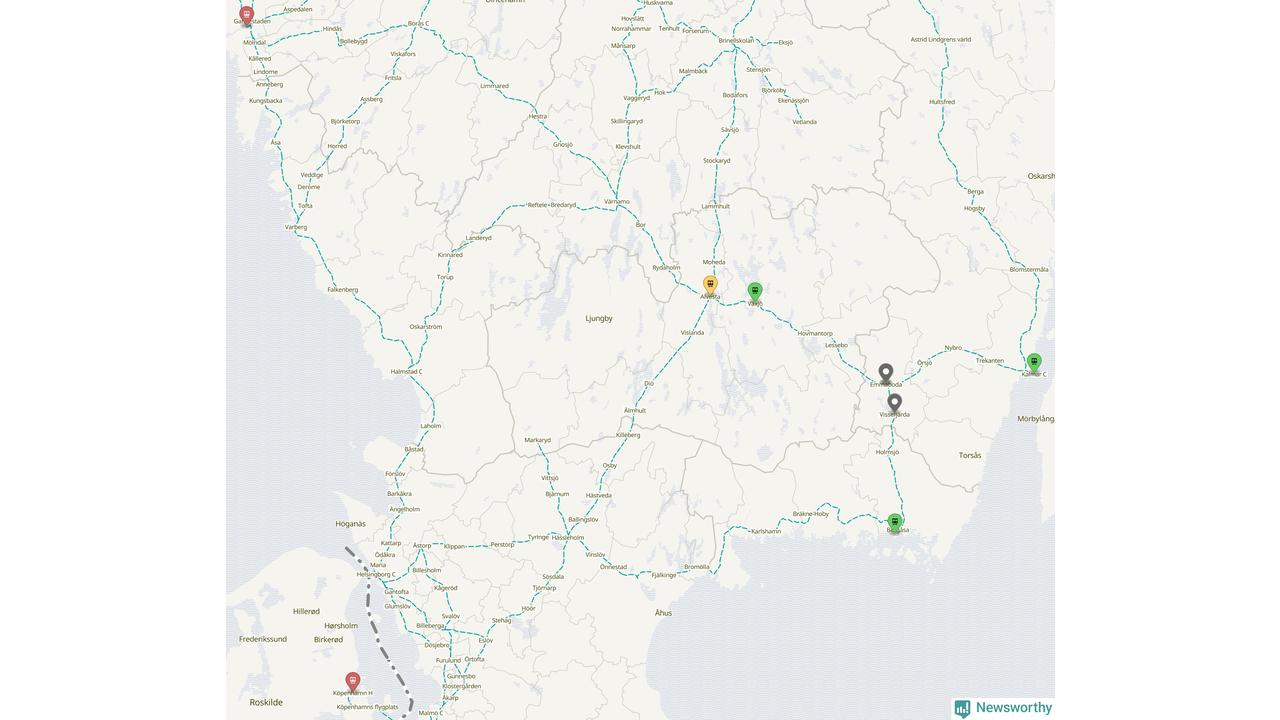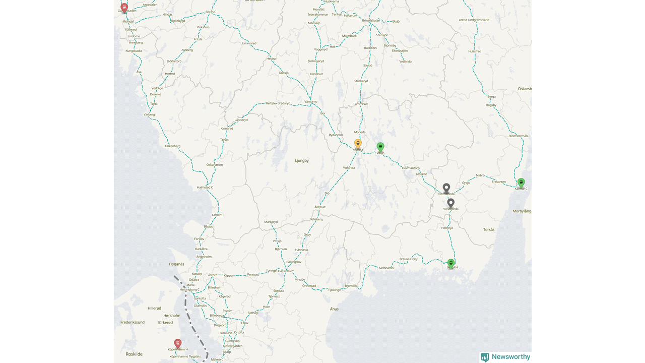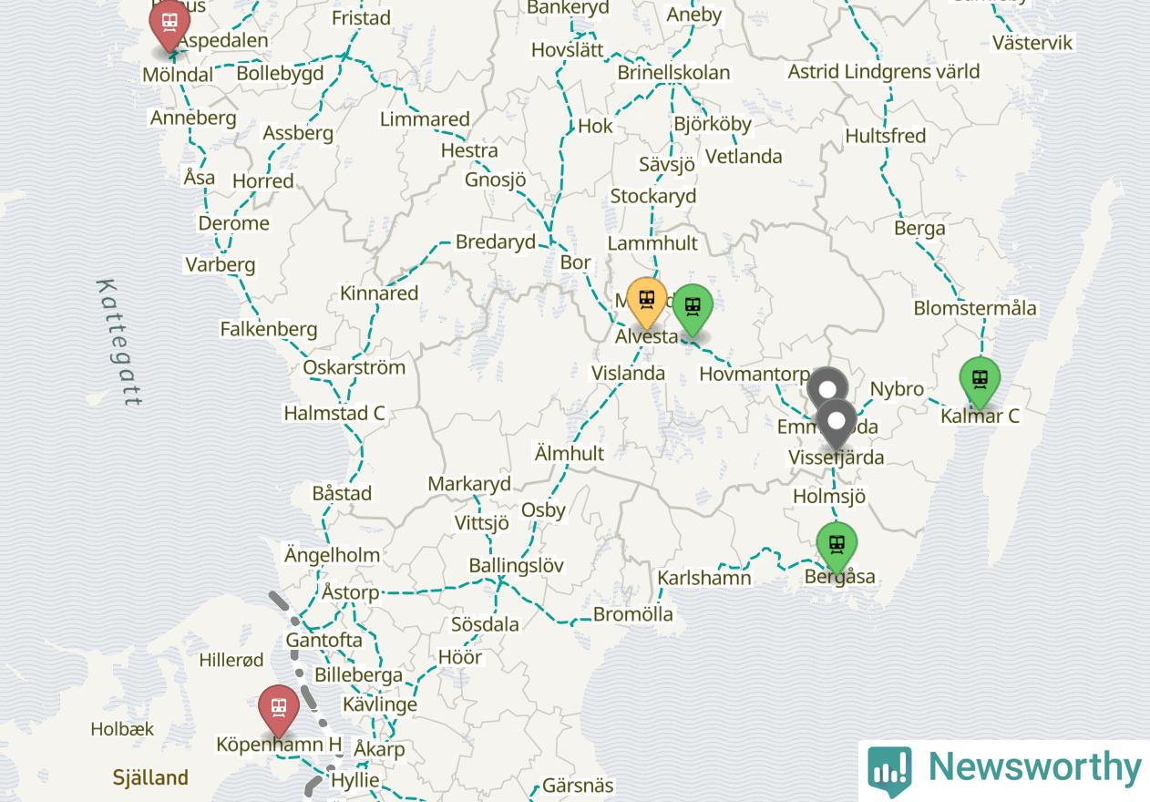 Kartdata från Mapbox, Newsworthy, OpenStreetMap och Trafikverket. Uppgifter om sträckor med passagerartrafik från jarnvag.net.
