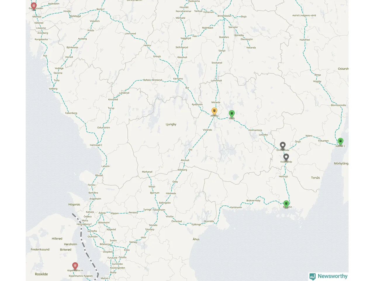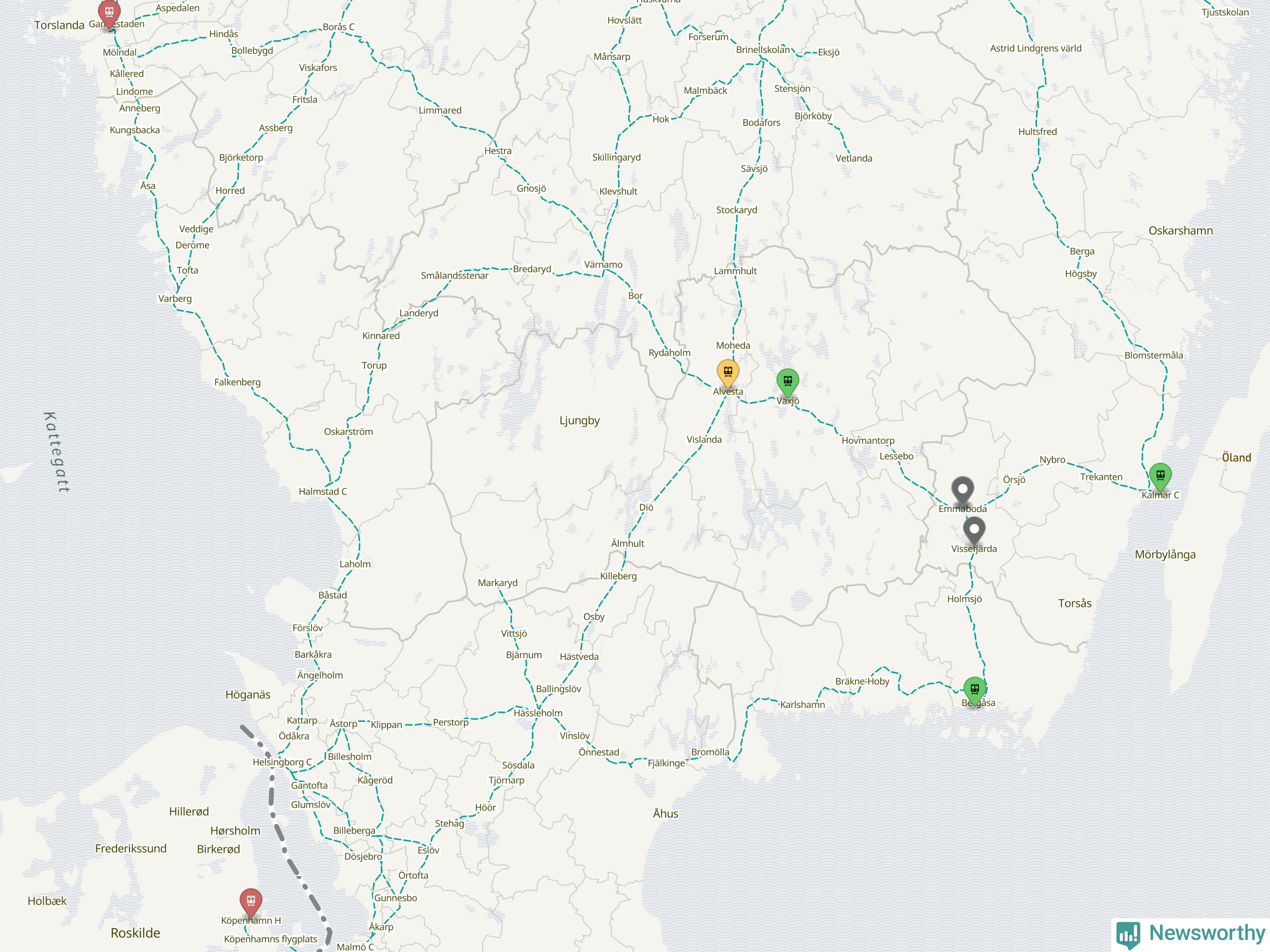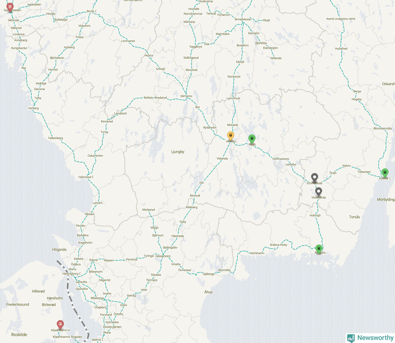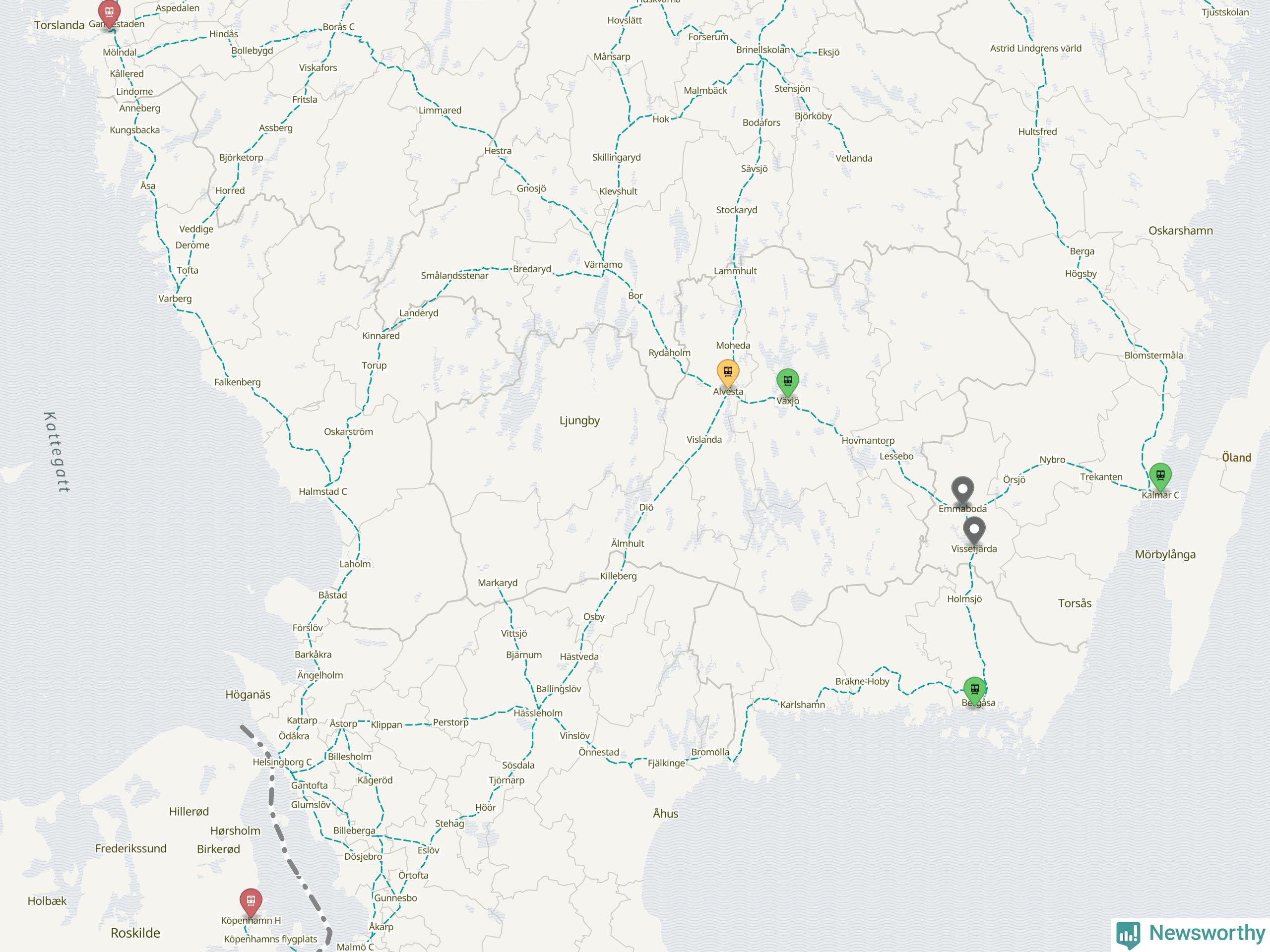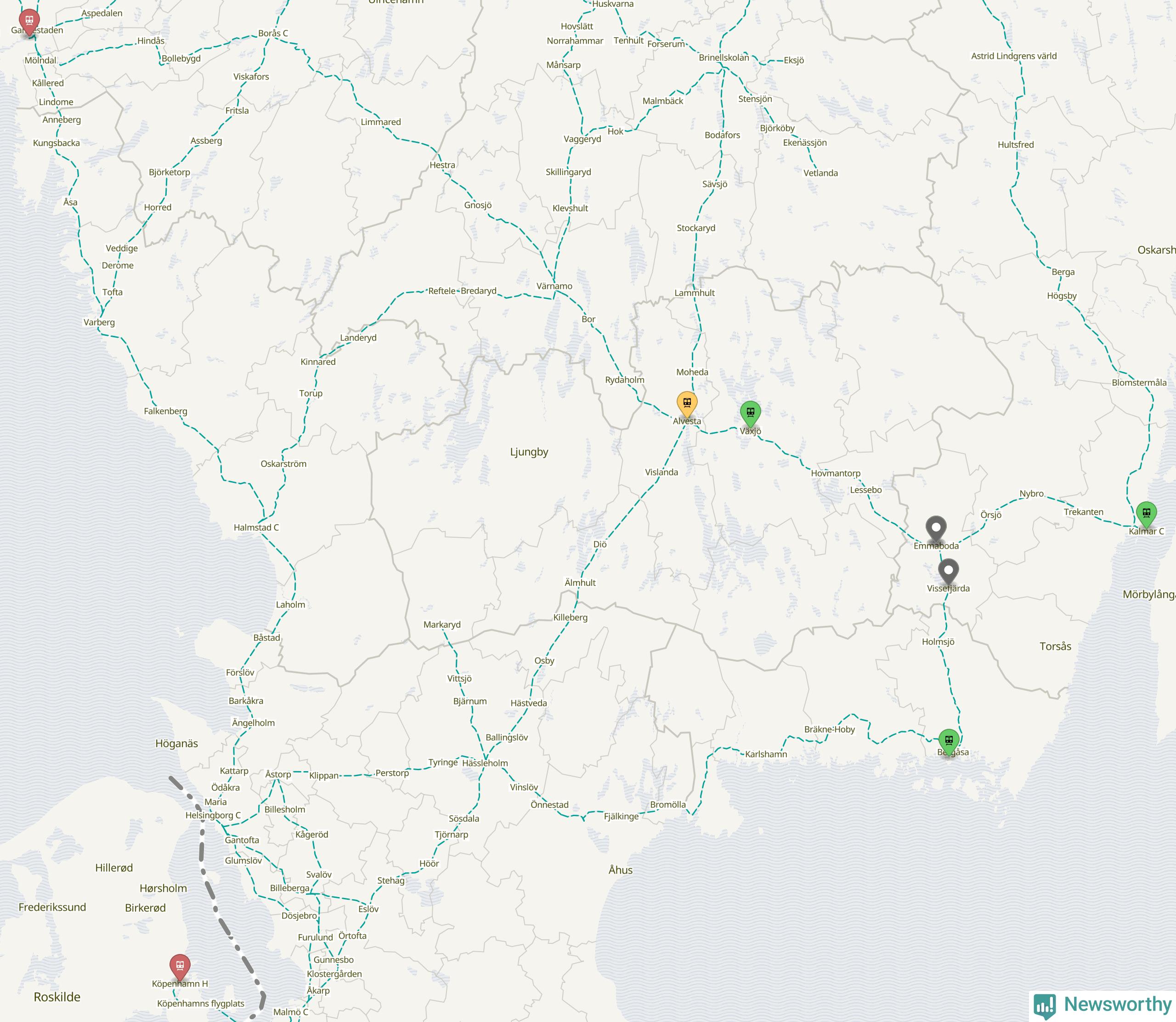 Kartdata från Mapbox, Newsworthy, OpenStreetMap och Trafikverket. Uppgifter om sträckor med passagerartrafik från jarnvag.net.