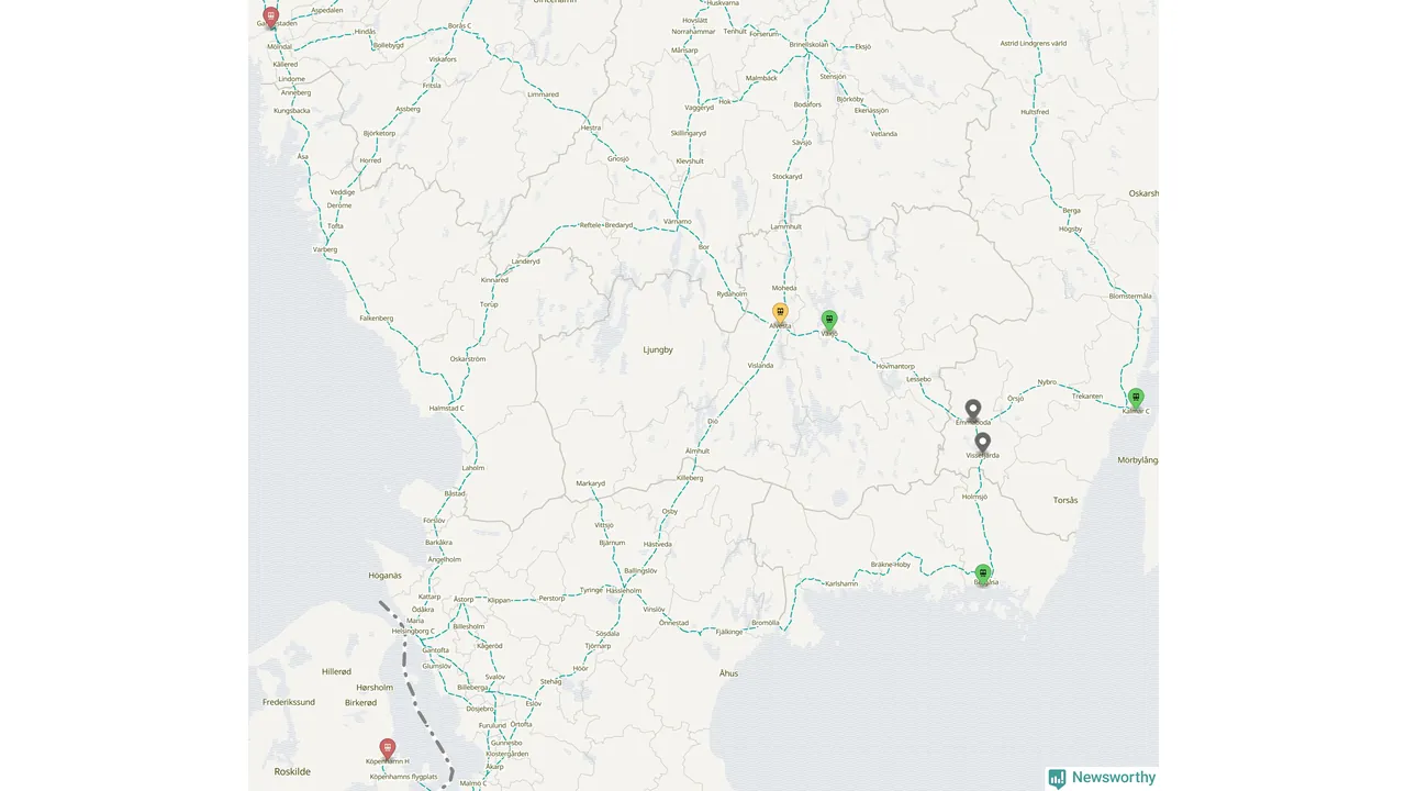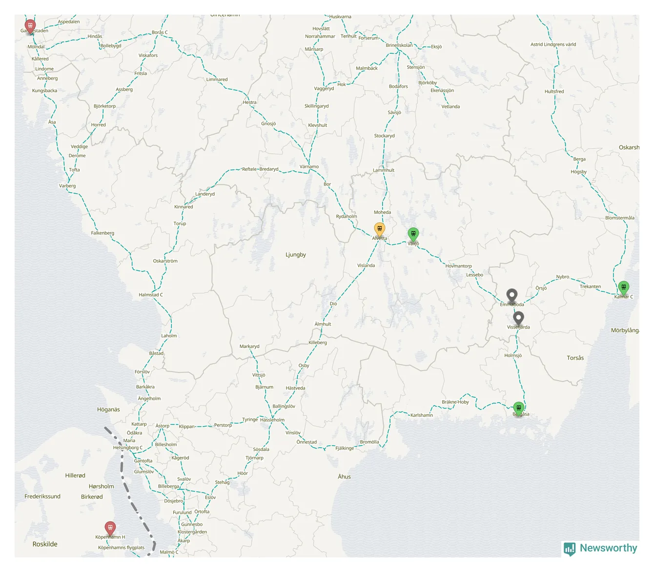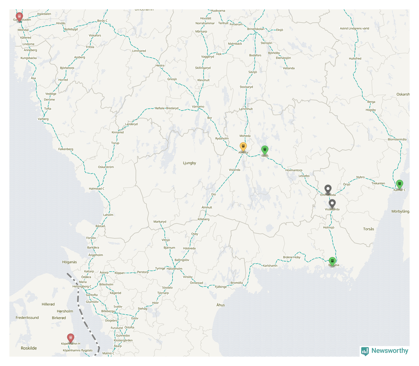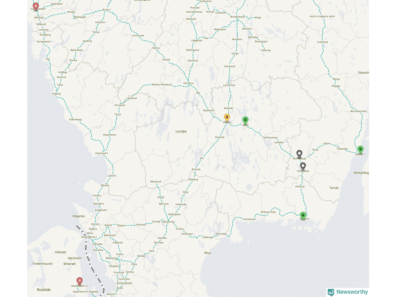 Kartdata från Mapbox, Newsworthy, OpenStreetMap och Trafikverket. Uppgifter om sträckor med passagerartrafik från jarnvag.net.