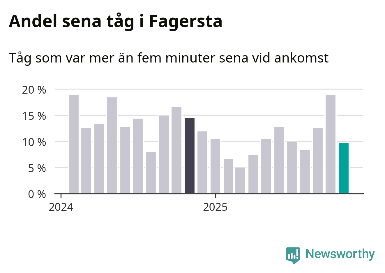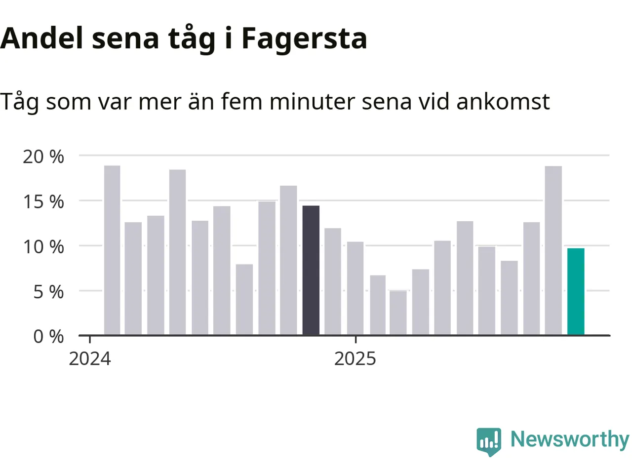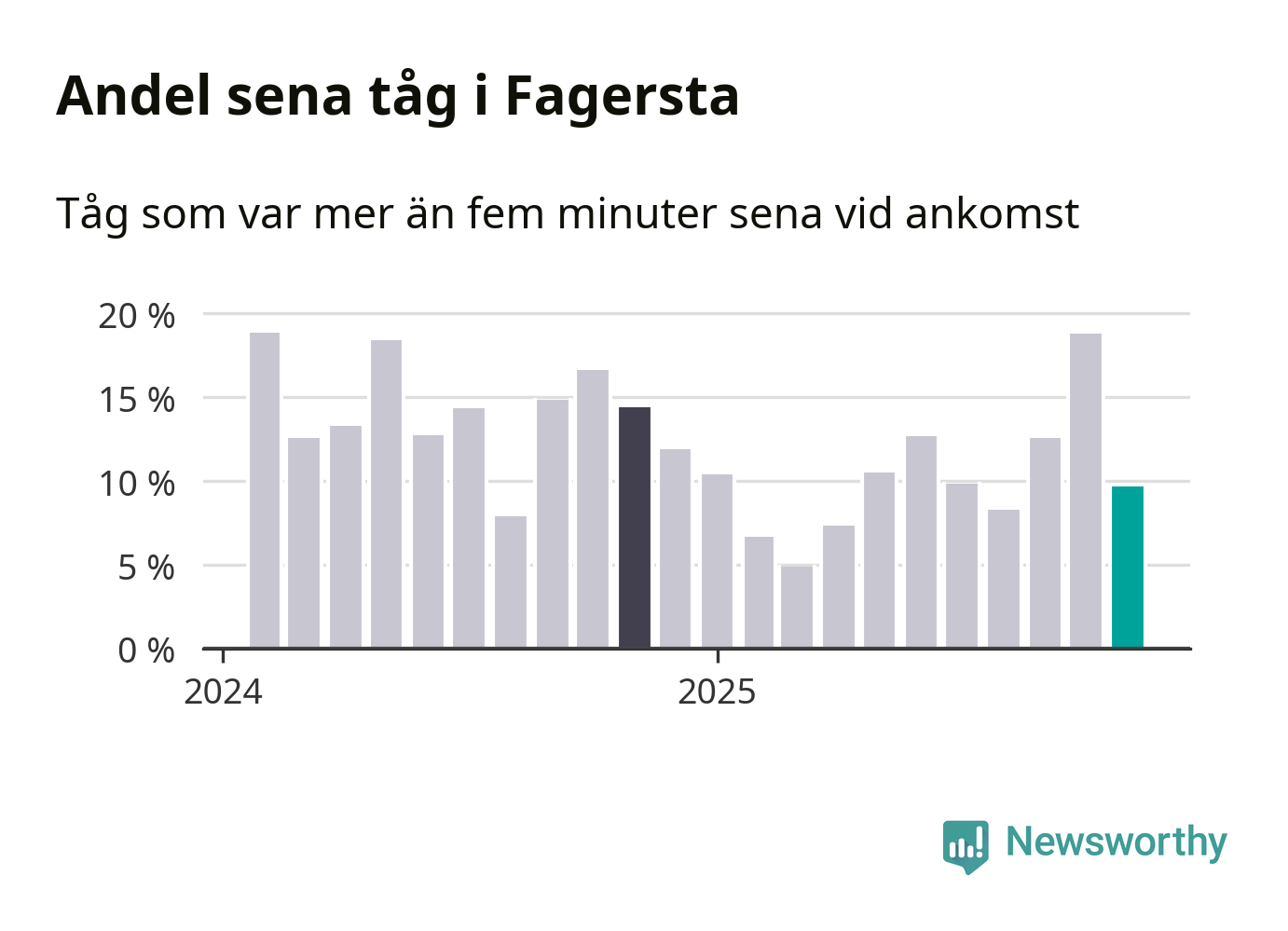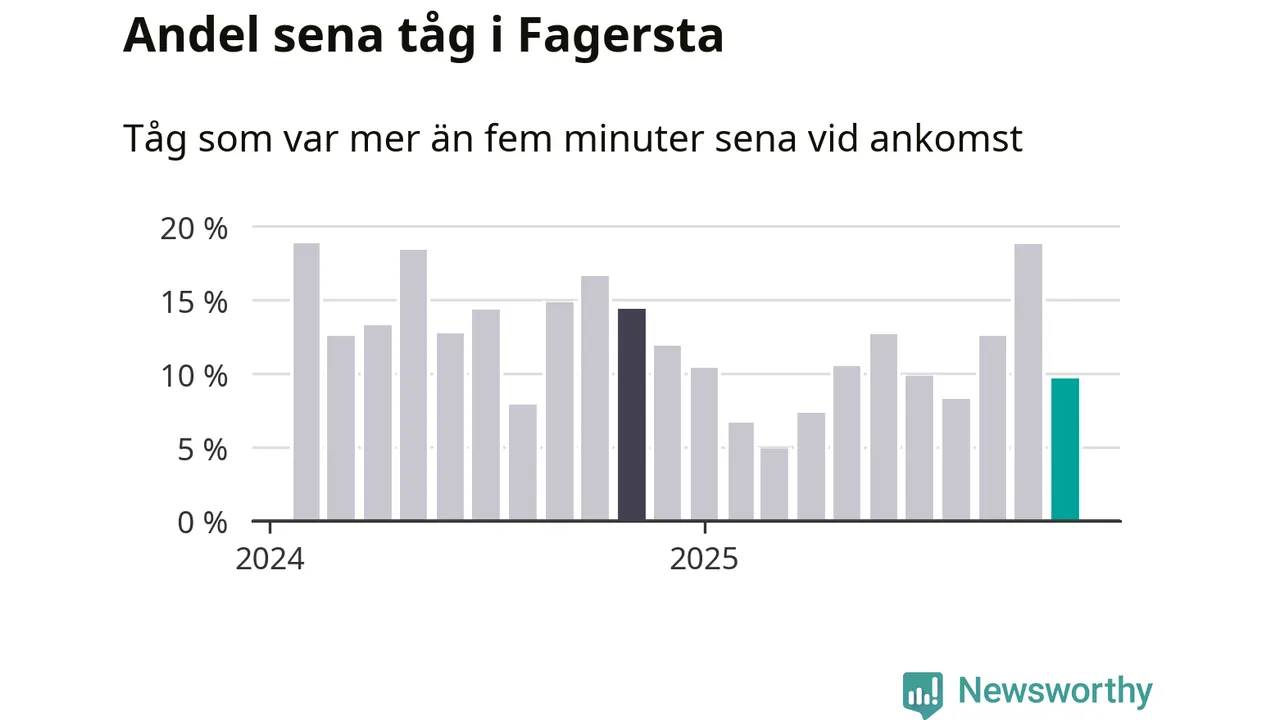Tio procent kan jämföras med 19 procent månaden innan, och 14 procent i november 2024. Siffrorna bygger på realtidsinformation om tågavgångar och ankomster från Trafikverket, som Newsworthy löpande samlar in.