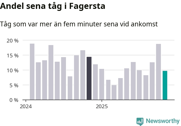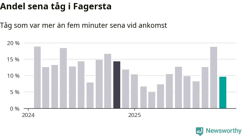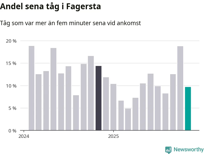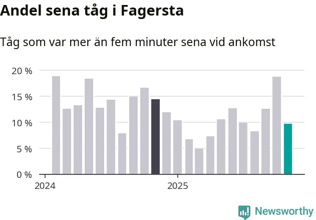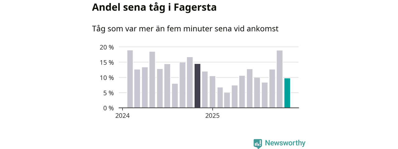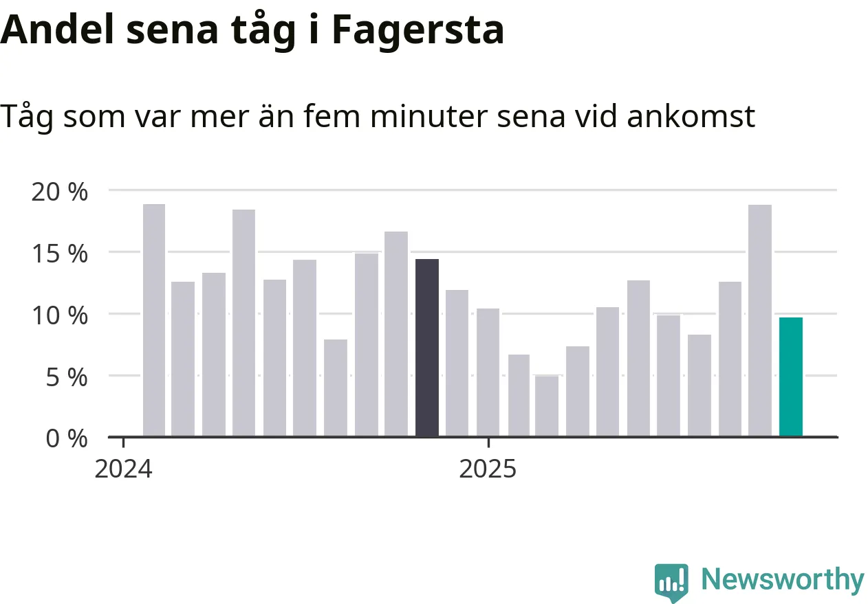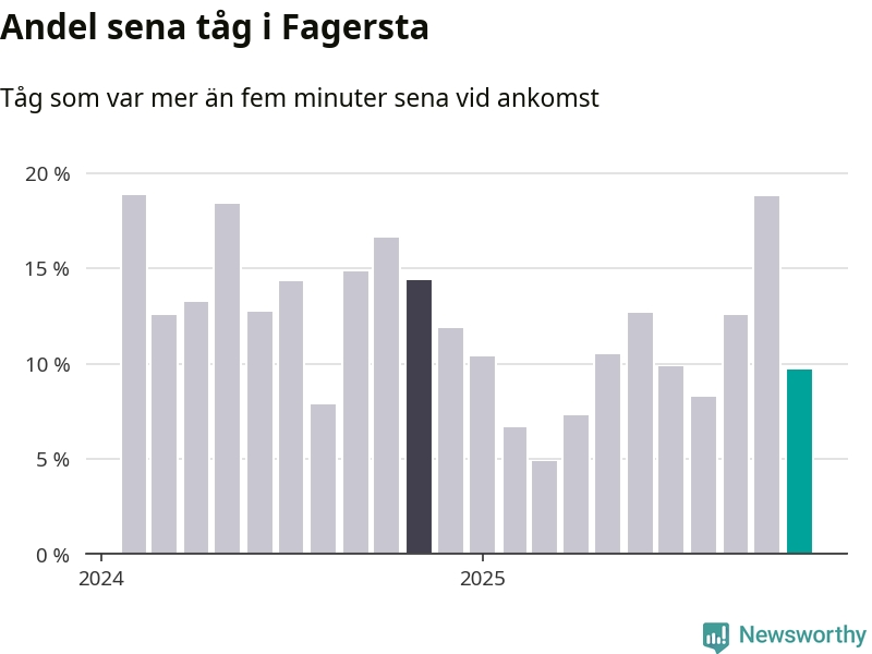 Tio procent kan jämföras med 19 procent månaden innan, och 14 procent i november 2024. Siffrorna bygger på realtidsinformation om tågavgångar och ankomster från Trafikverket, som Newsworthy löpande samlar in.