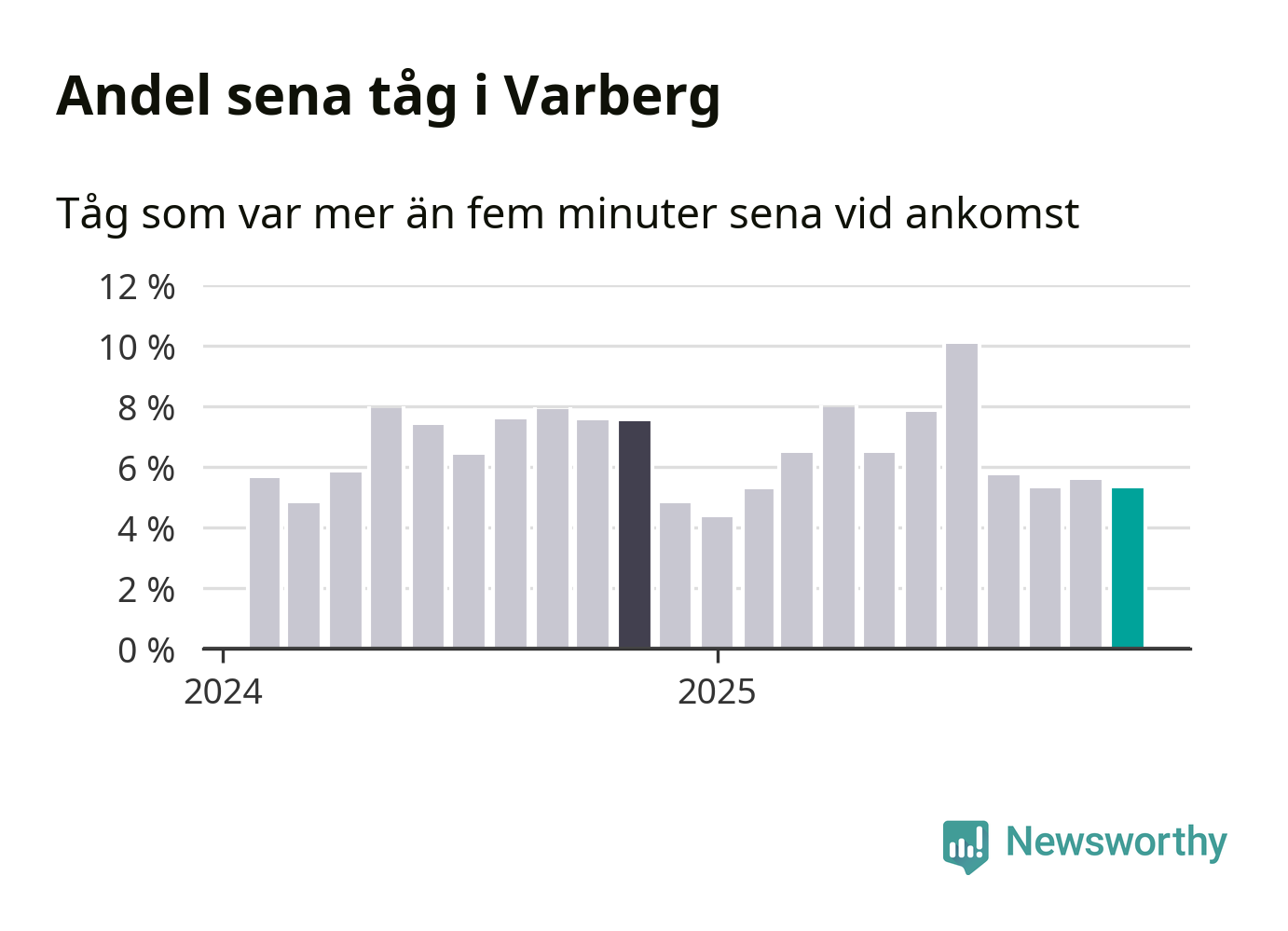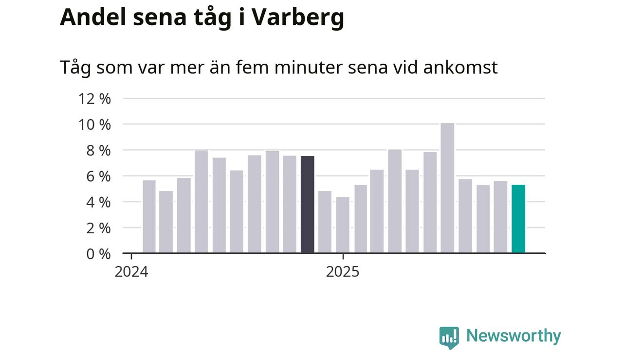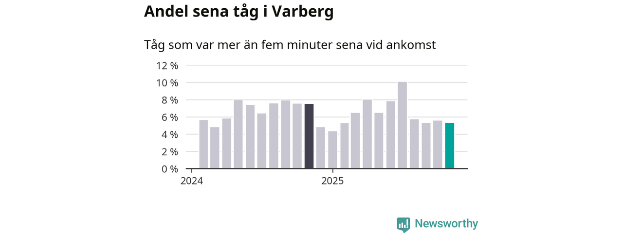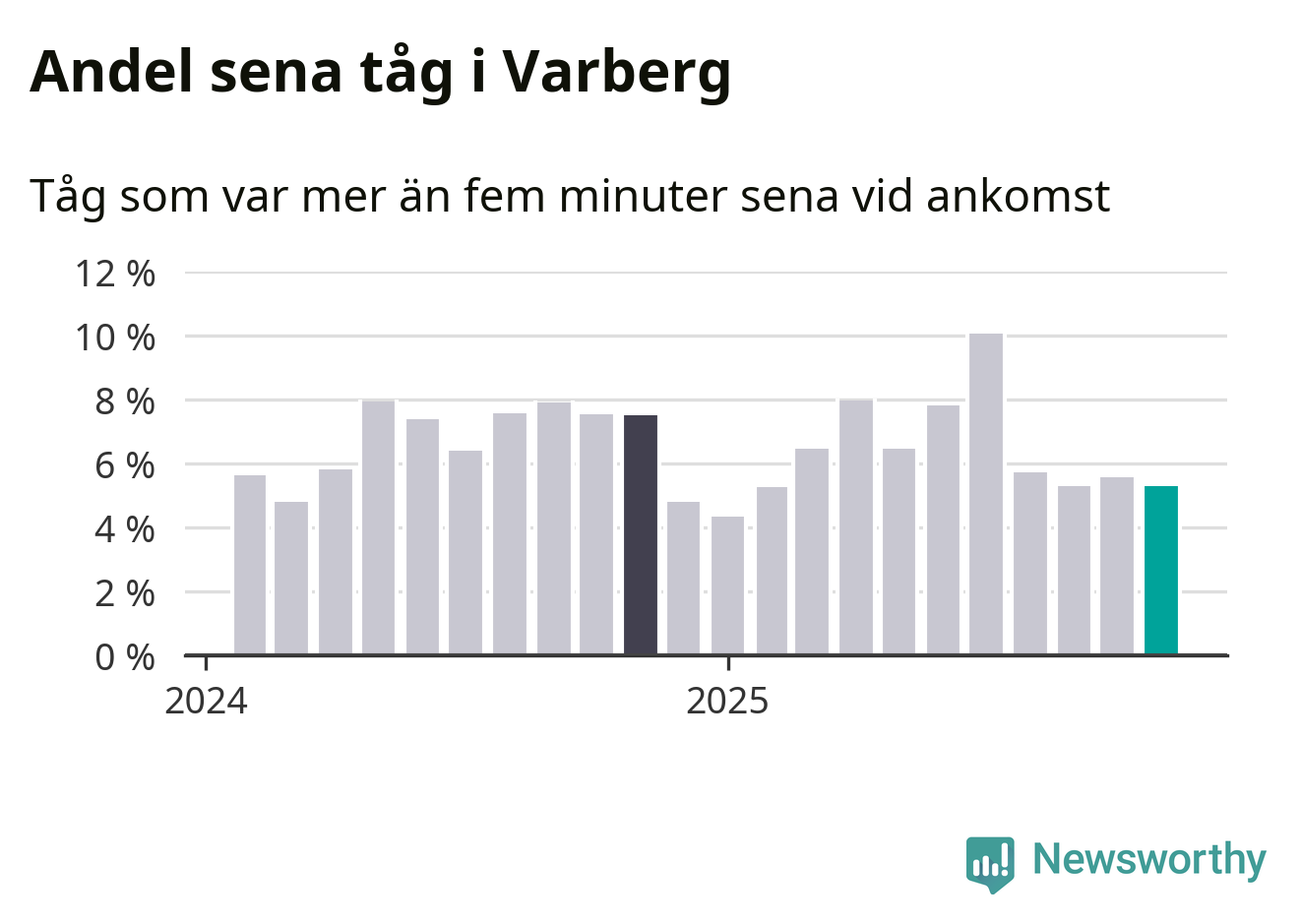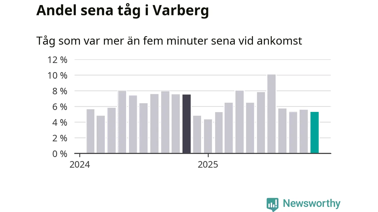 Fem procent kan jämföras med sex procent månaden innan, och sju procent i november 2024. Siffrorna bygger på realtidsinformation om tågavgångar och ankomster från Trafikverket, som Newsworthy löpande samlar in.
