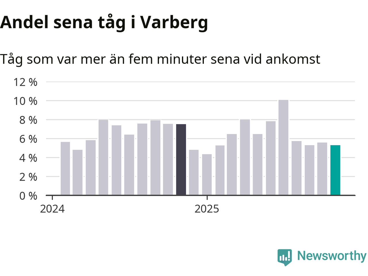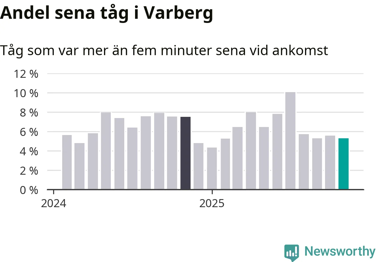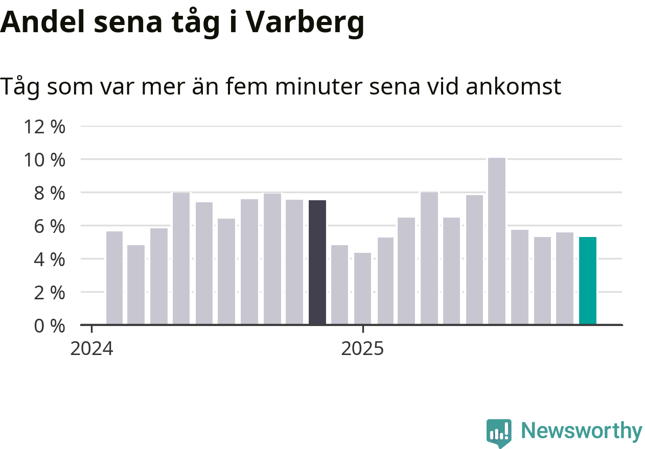 Fem procent kan jämföras med sex procent månaden innan, och sju procent i november 2024. Siffrorna bygger på realtidsinformation om tågavgångar och ankomster från Trafikverket, som Newsworthy löpande samlar in.