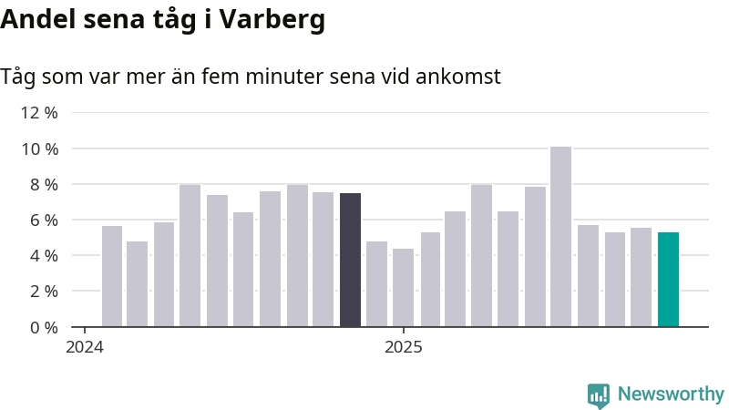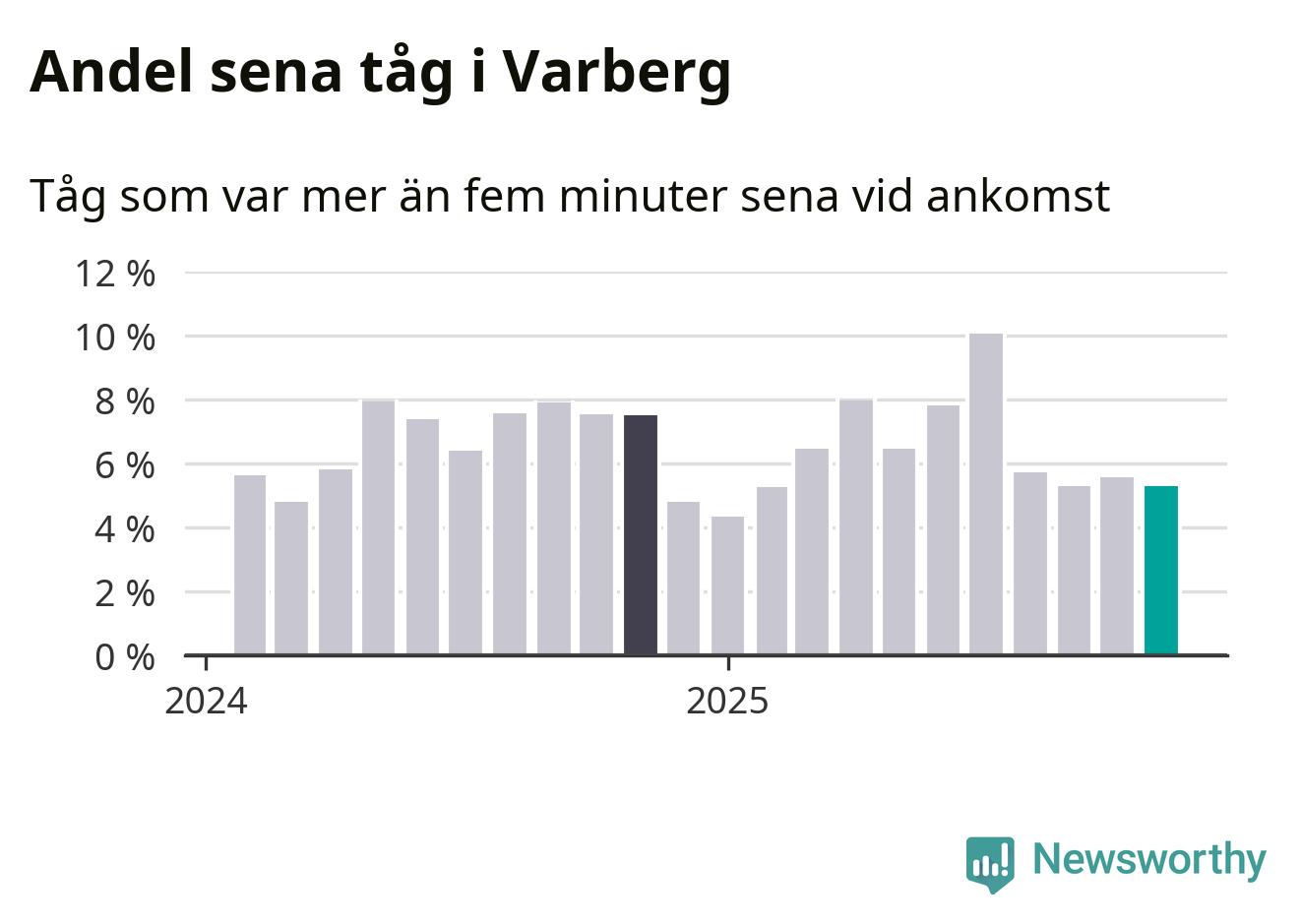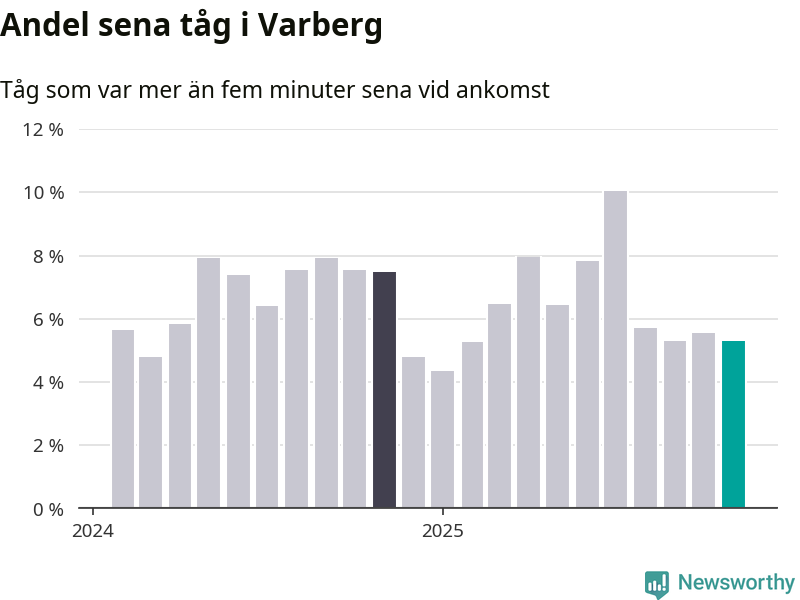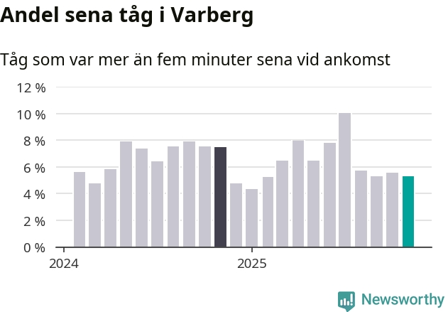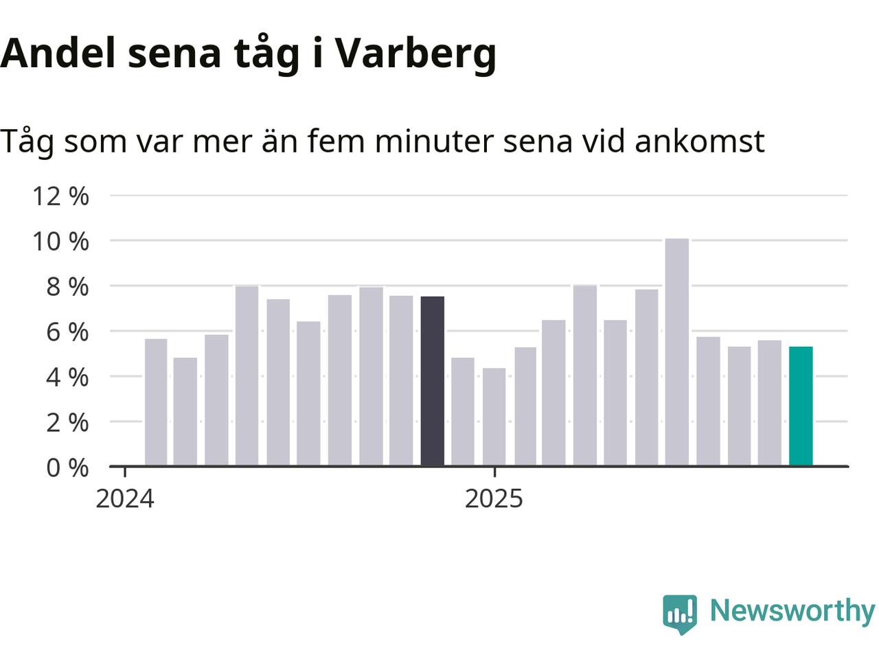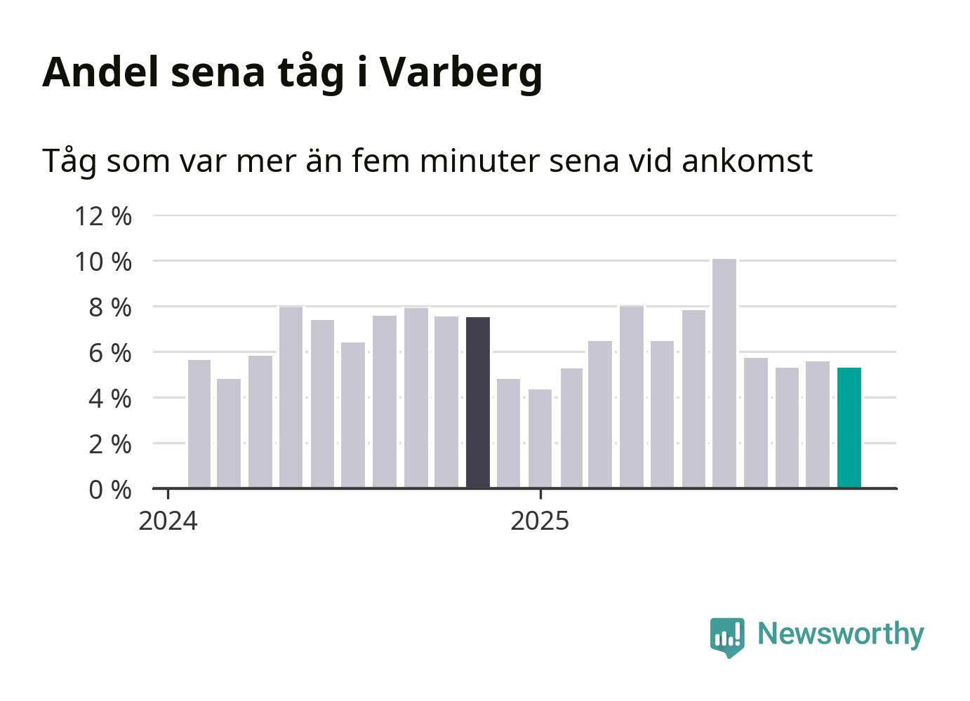 Fem procent kan jämföras med sex procent månaden innan, och sju procent i november 2024. Siffrorna bygger på realtidsinformation om tågavgångar och ankomster från Trafikverket, som Newsworthy löpande samlar in.