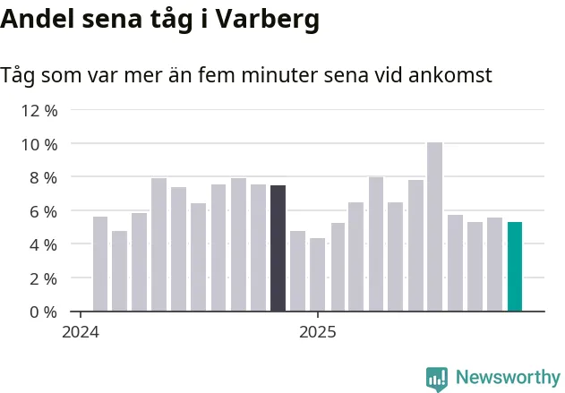 Av drygt 2 000 tåg som passerade Varberg eller Veddige i november var 108 mer än fem minuter sena. Det motsvarar 5 procent.