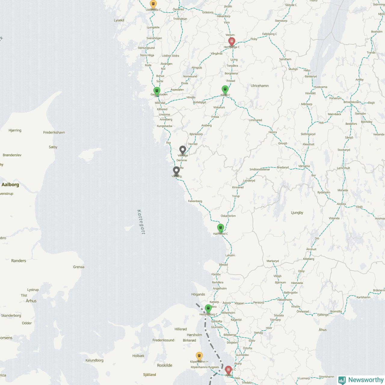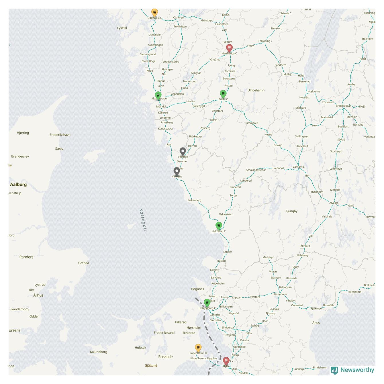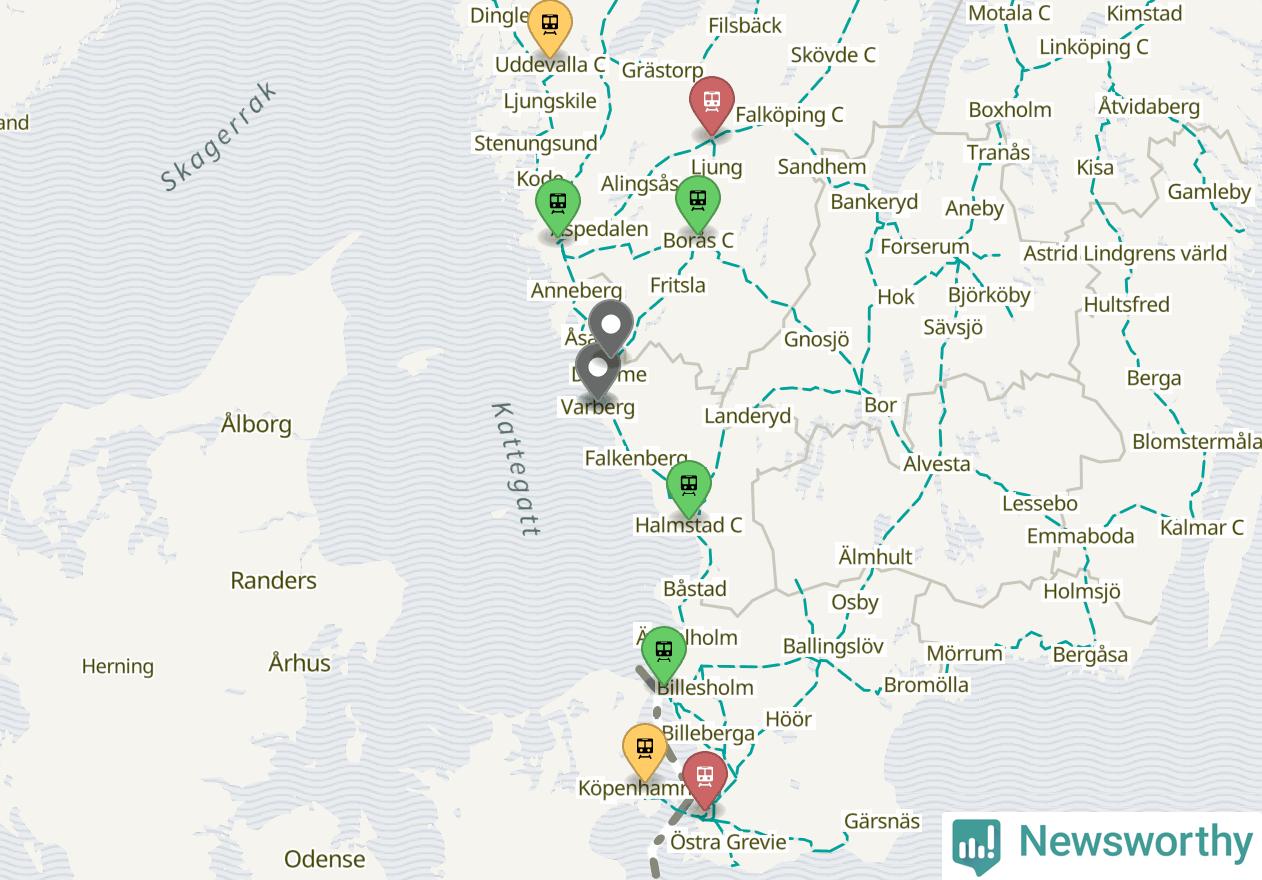 Kartdata från Mapbox, Newsworthy, OpenStreetMap och Trafikverket. Uppgifter om sträckor med passagerartrafik från jarnvag.net.