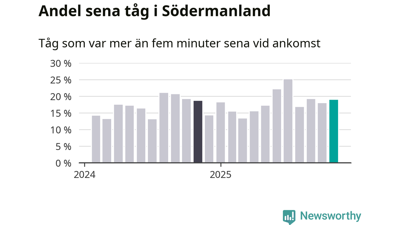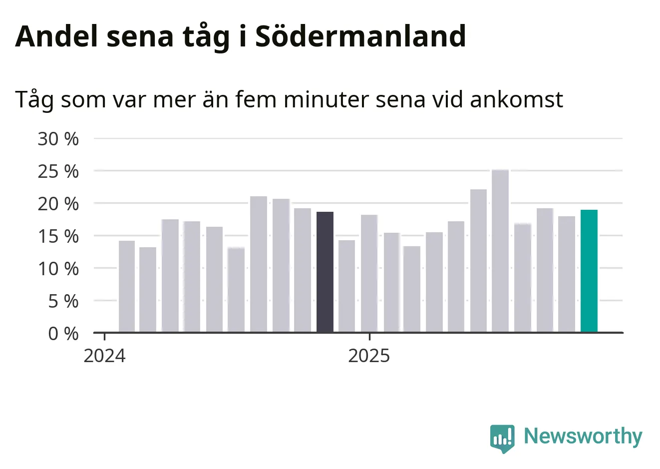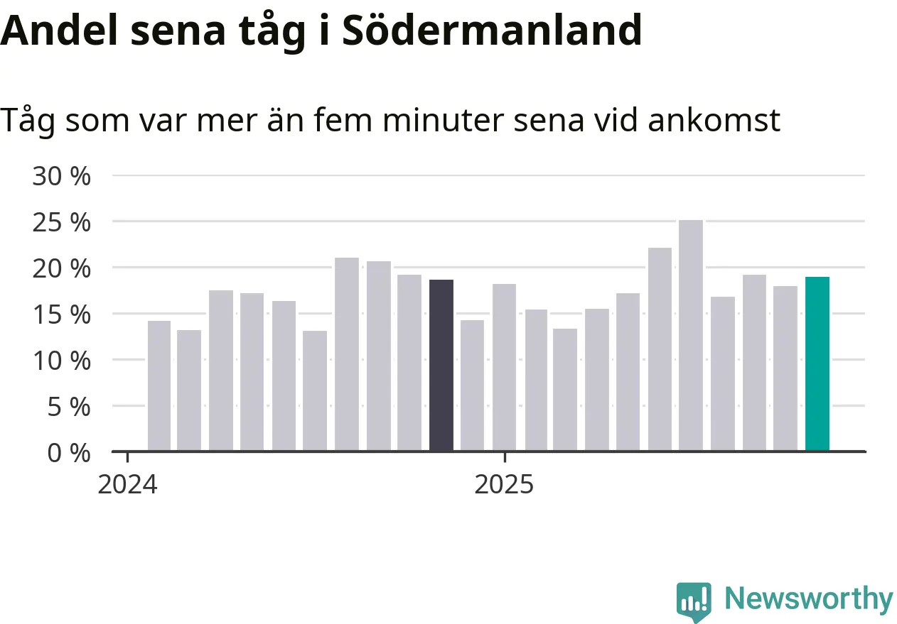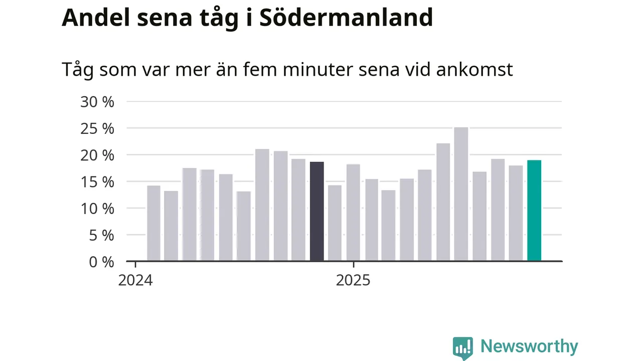 19 procent kan jämföras med 18 procent månaden innan, och 19 procent i november 2024. Siffrorna bygger på realtidsinformation om tågavgångar och ankomster från Trafikverket, som Newsworthy löpande samlar in.