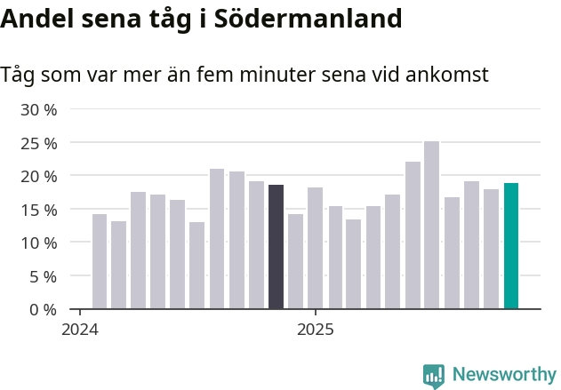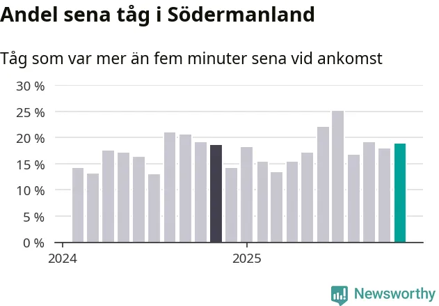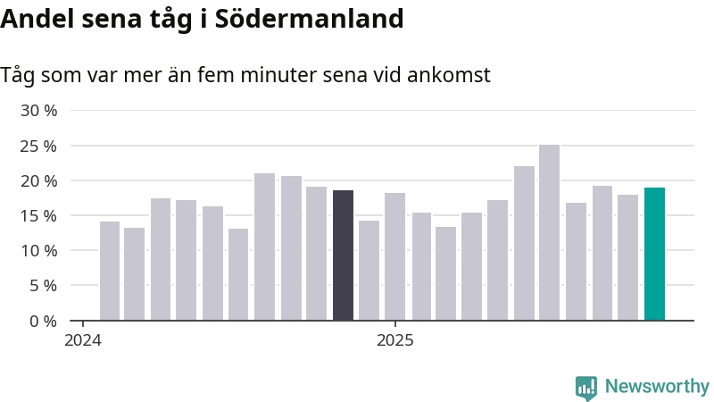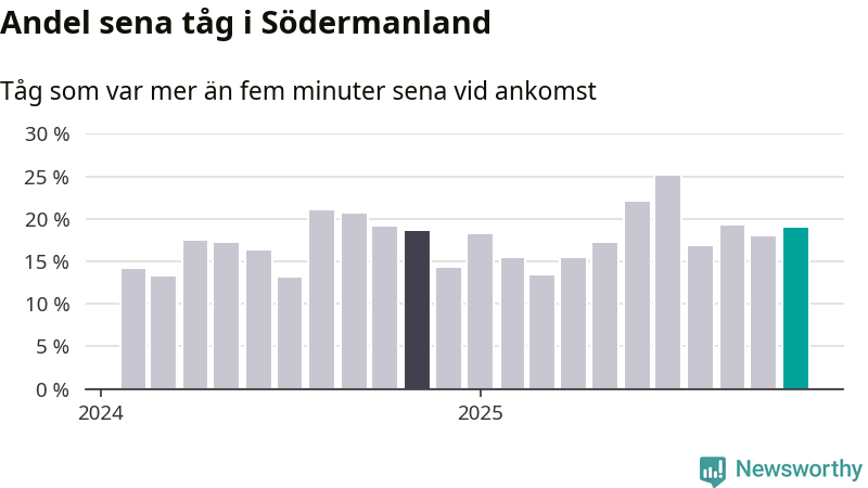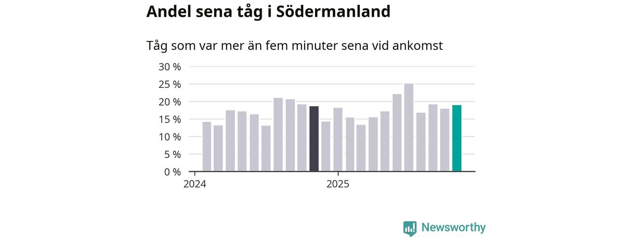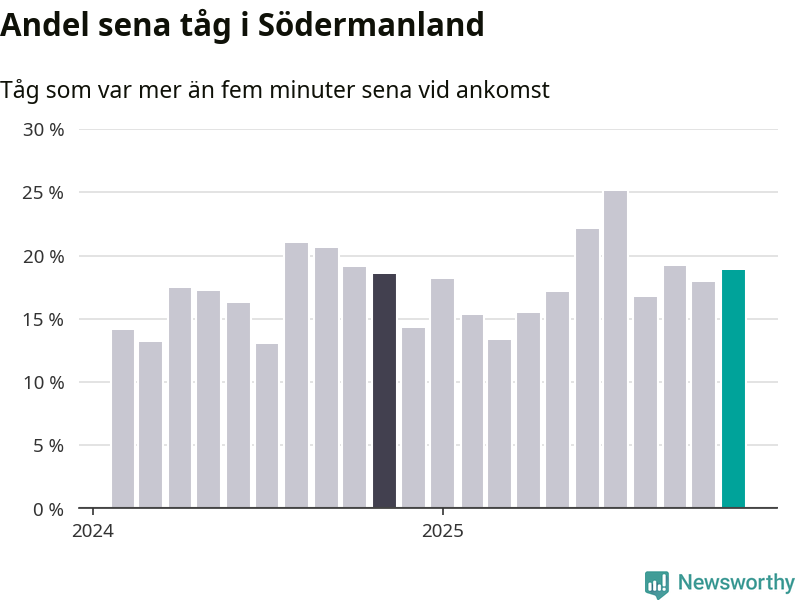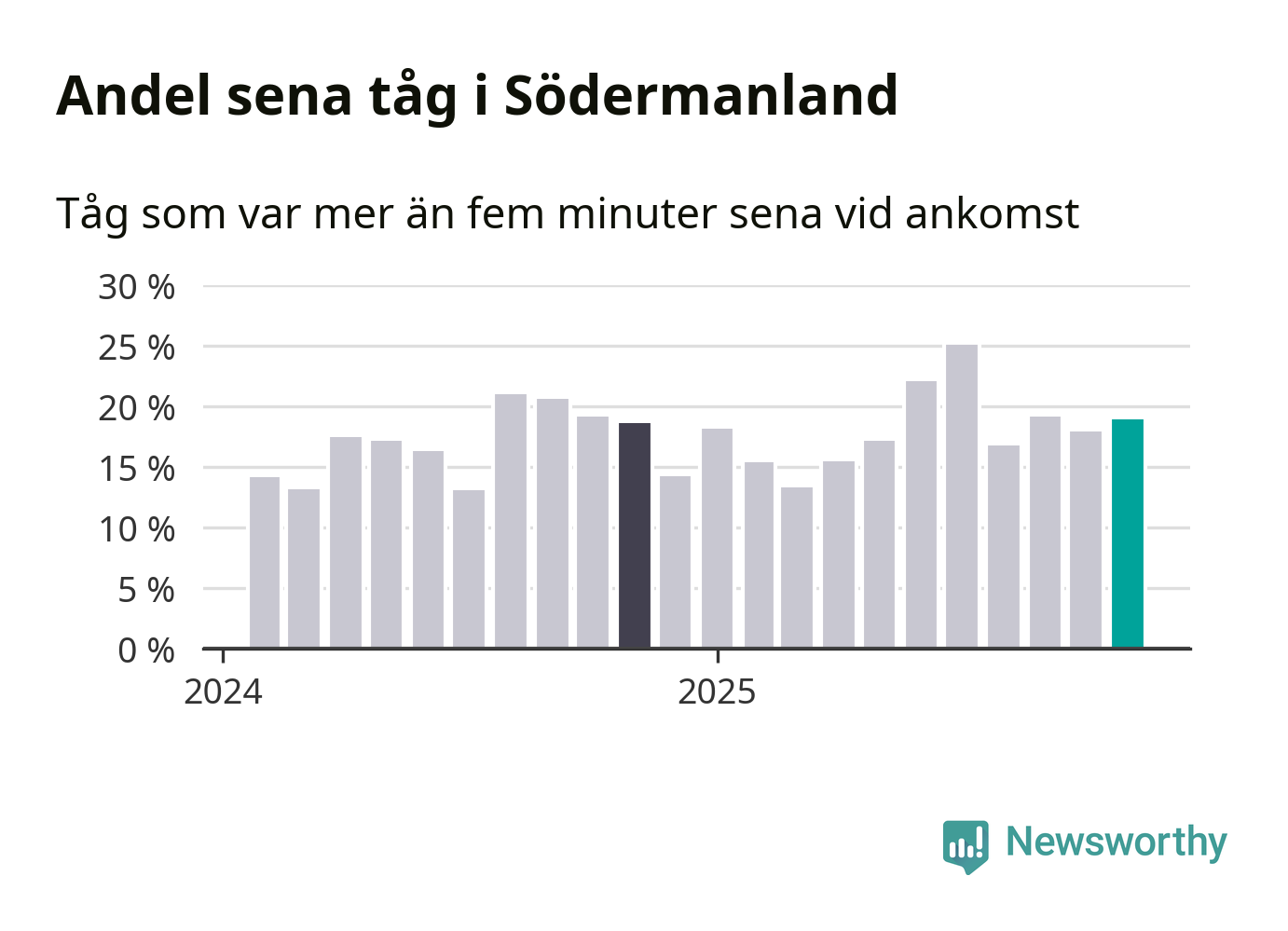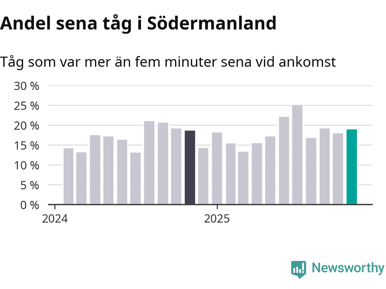 19 procent kan jämföras med 18 procent månaden innan, och 19 procent i november 2024. Siffrorna bygger på realtidsinformation om tågavgångar och ankomster från Trafikverket, som Newsworthy löpande samlar in.