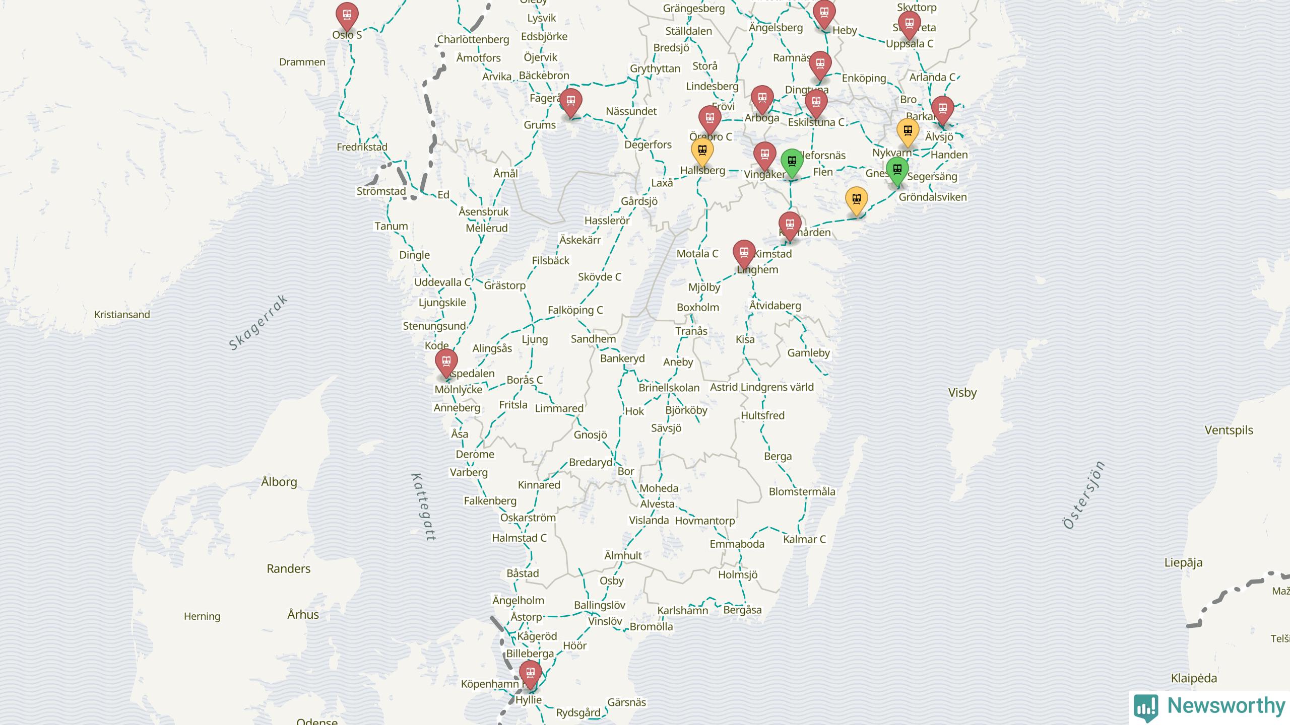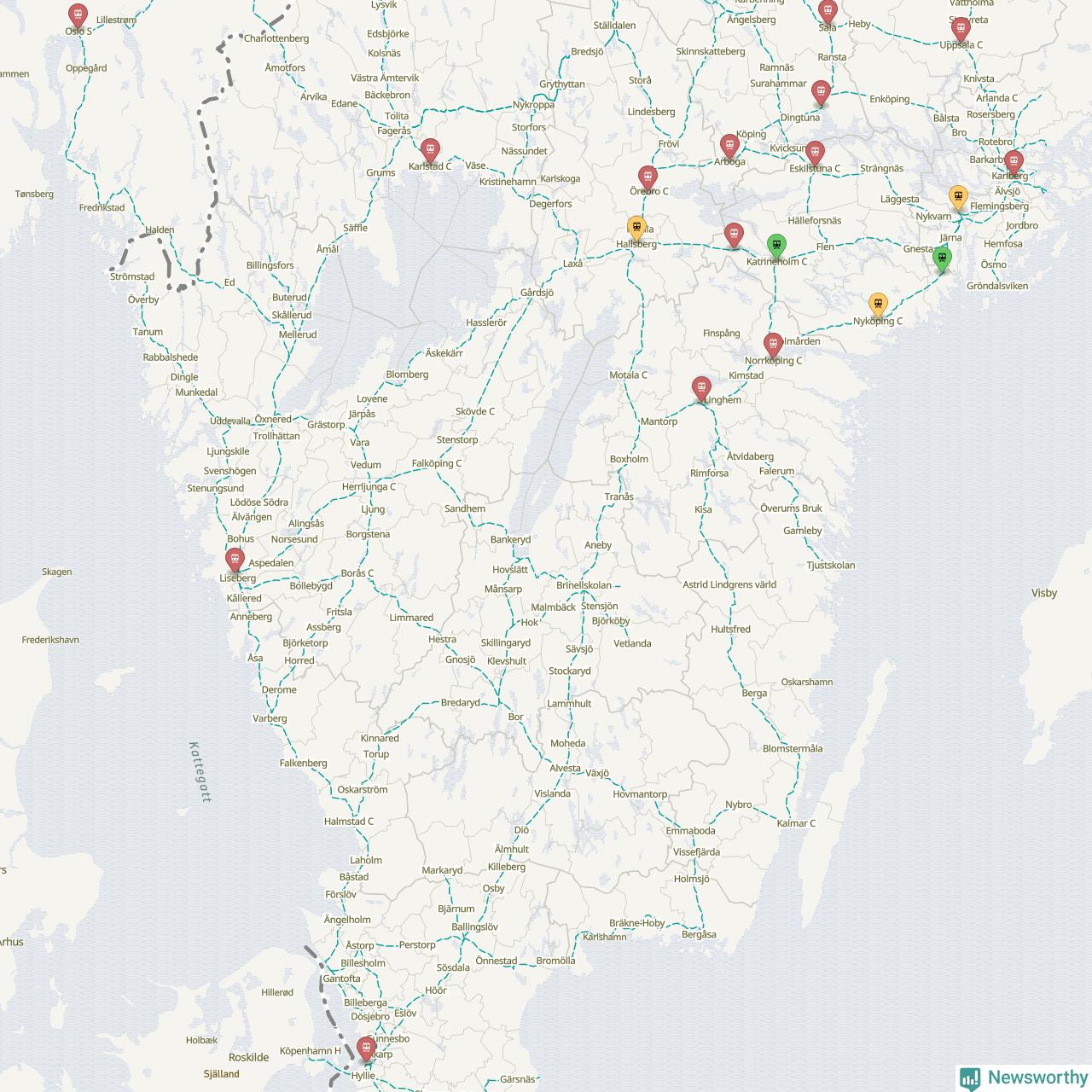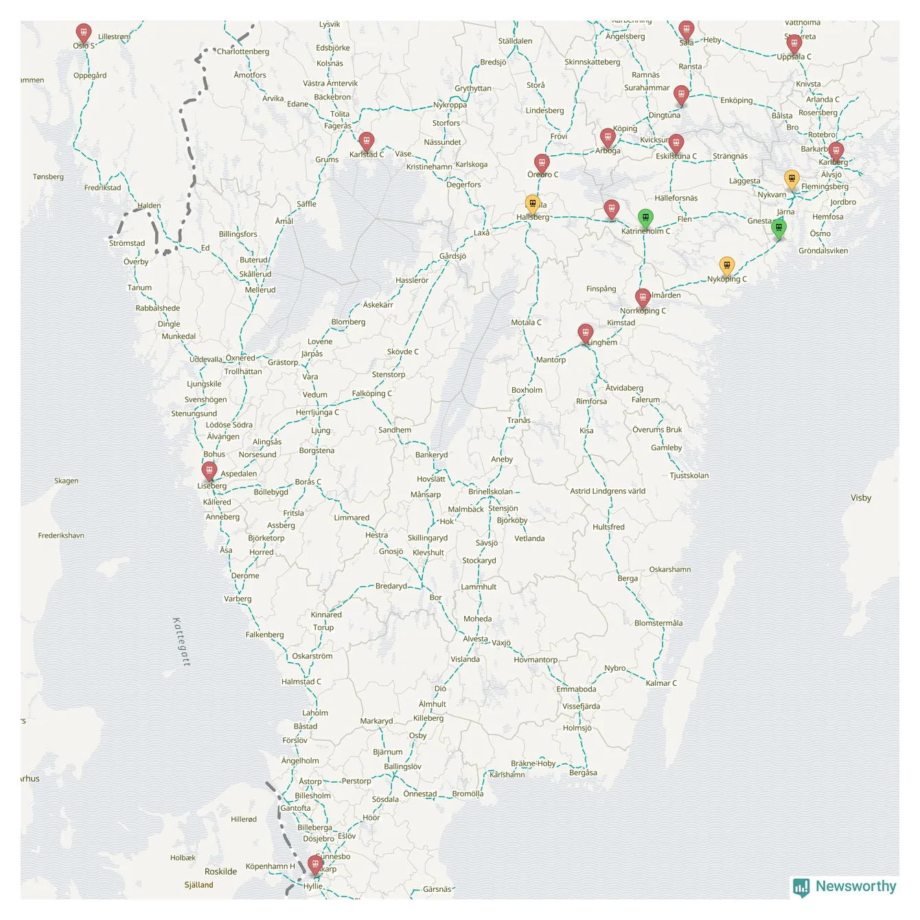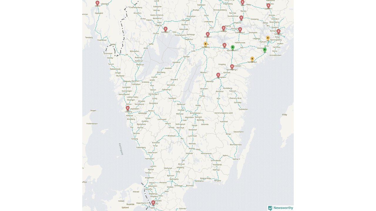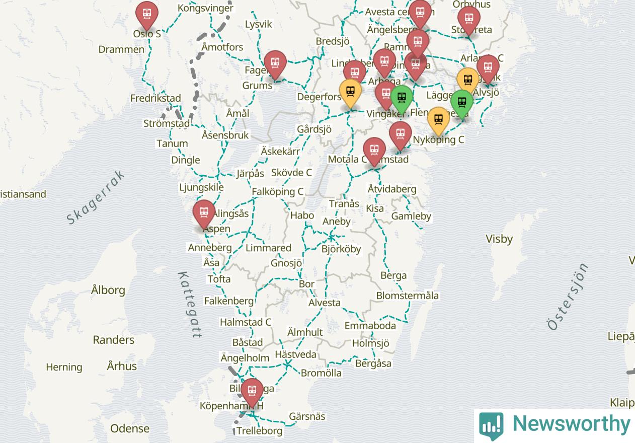 Kartdata från Mapbox, Newsworthy, OpenStreetMap och Trafikverket. Uppgifter om sträckor med passagerartrafik från jarnvag.net.