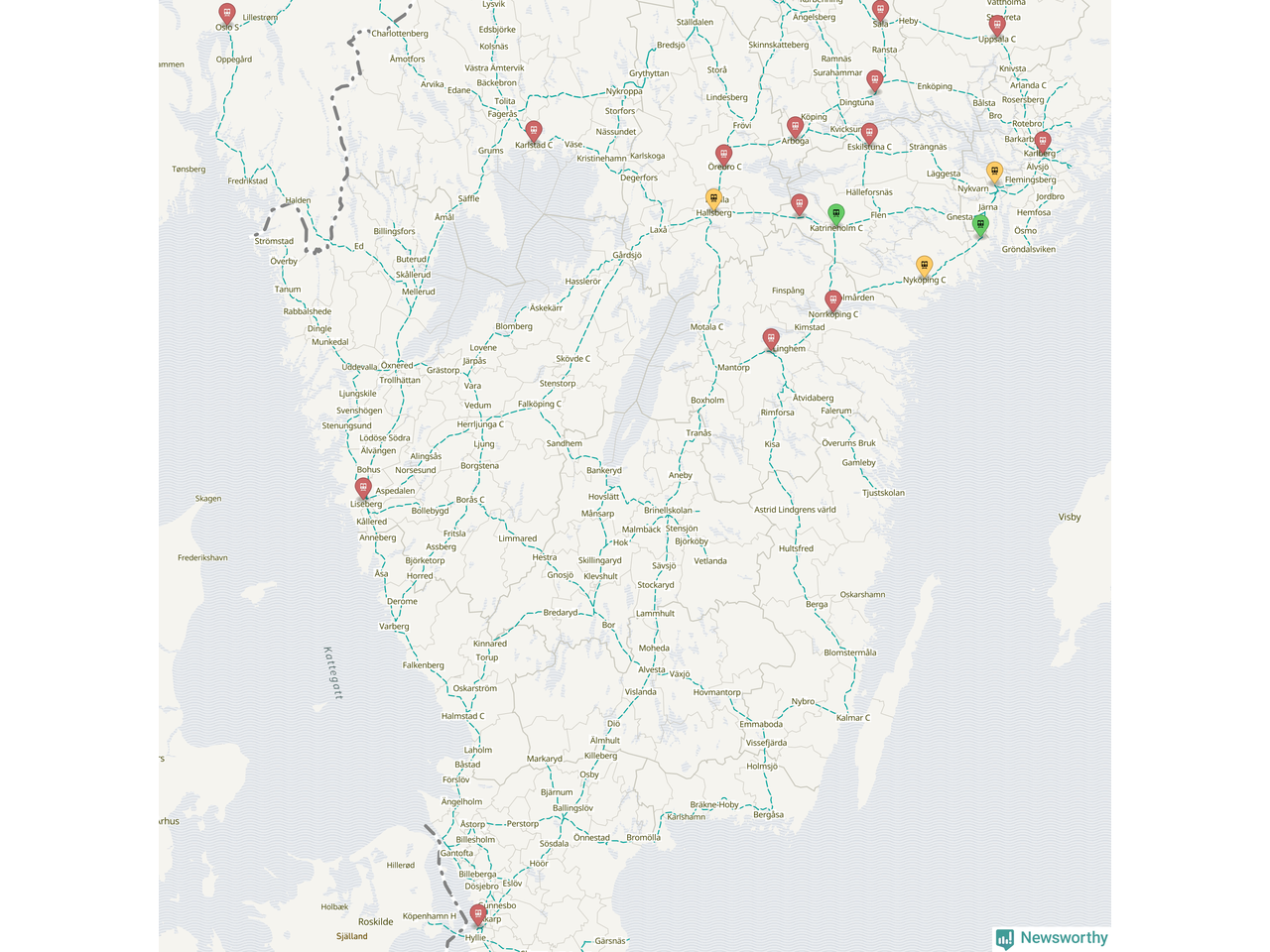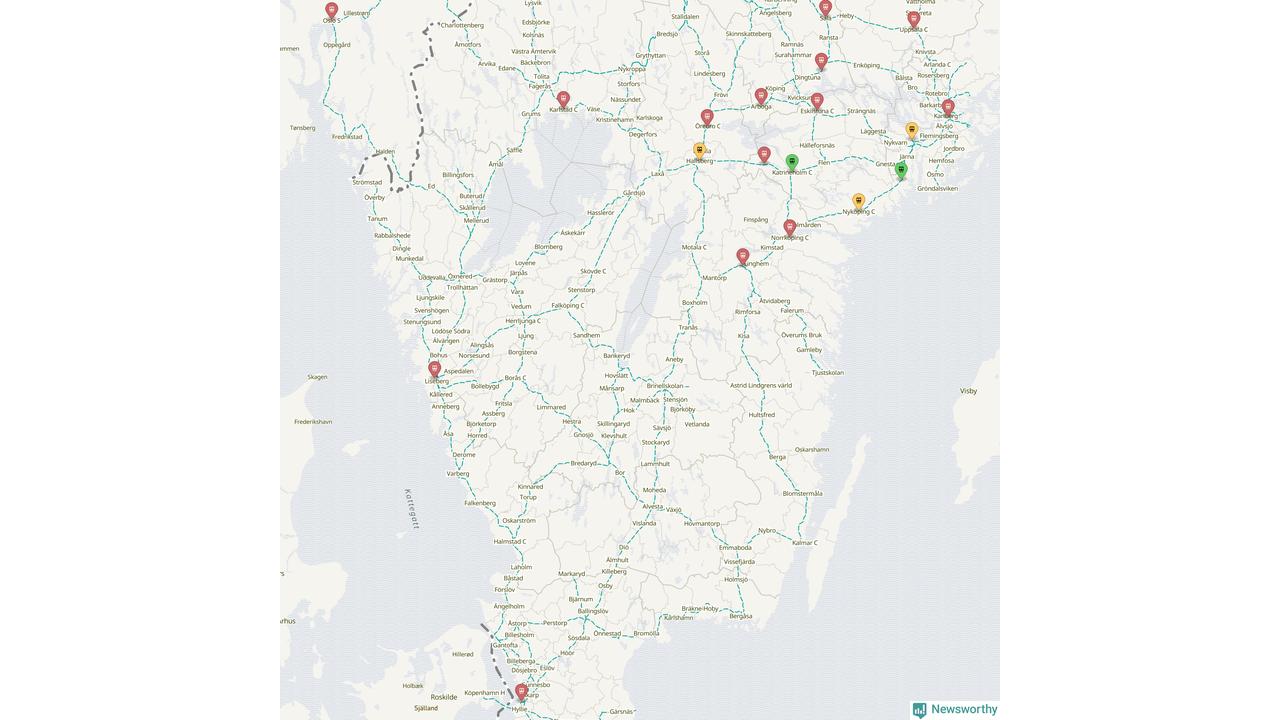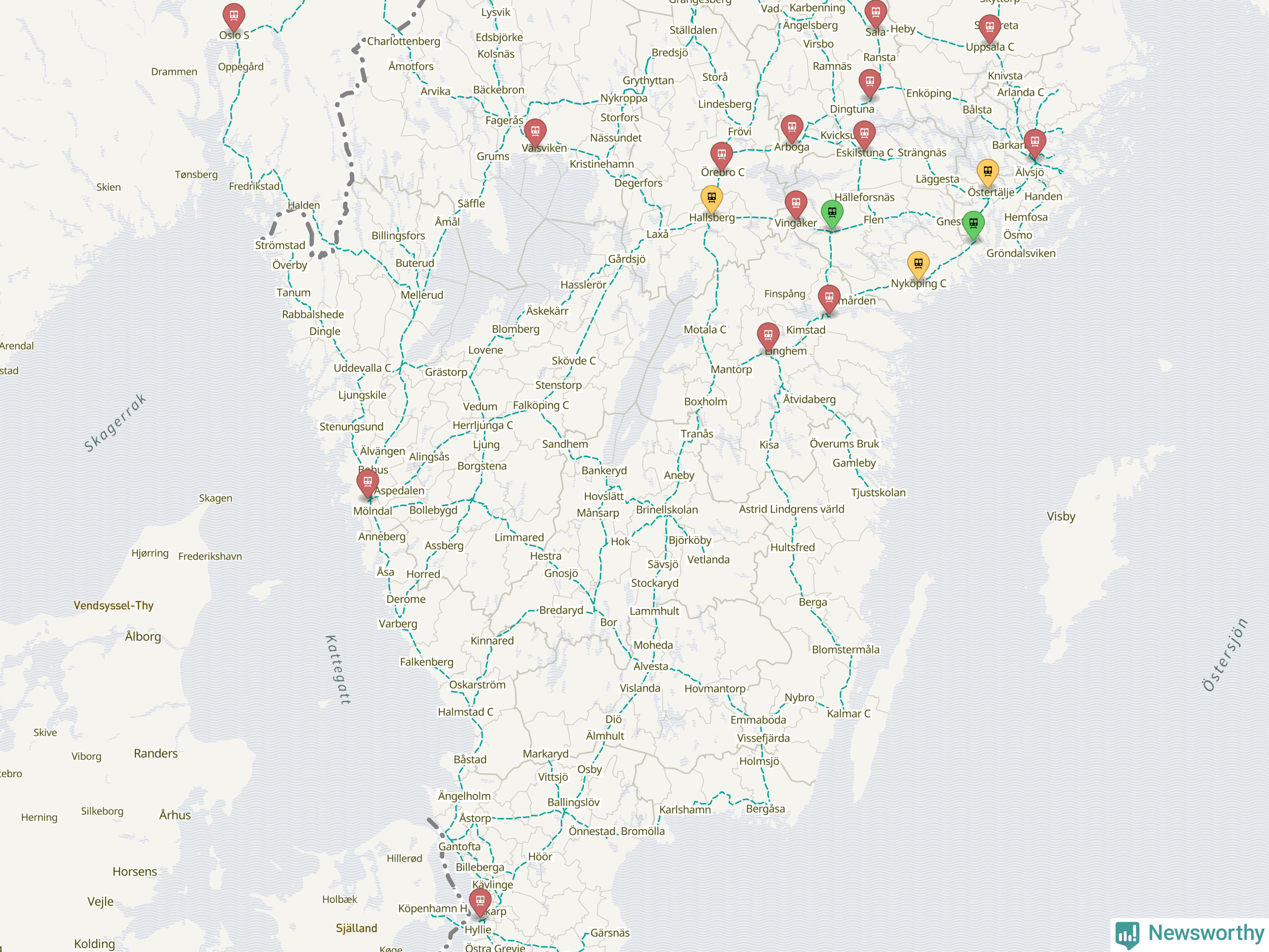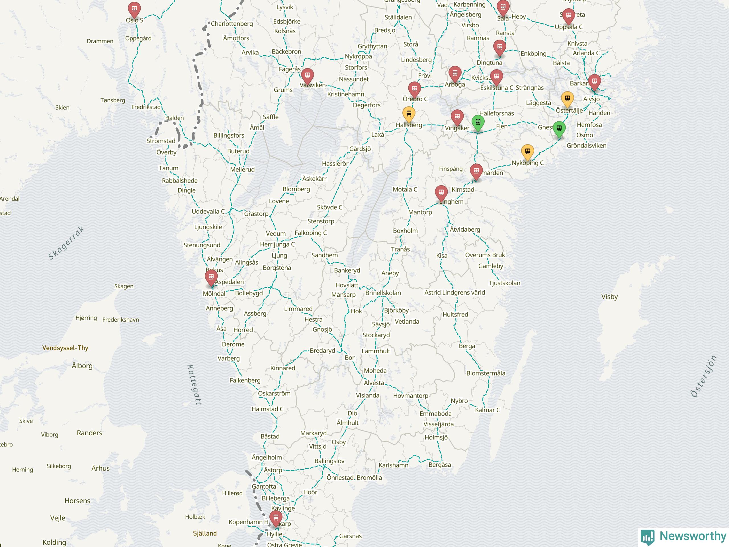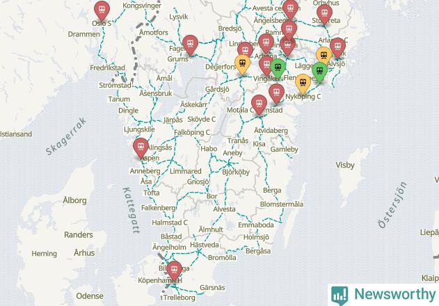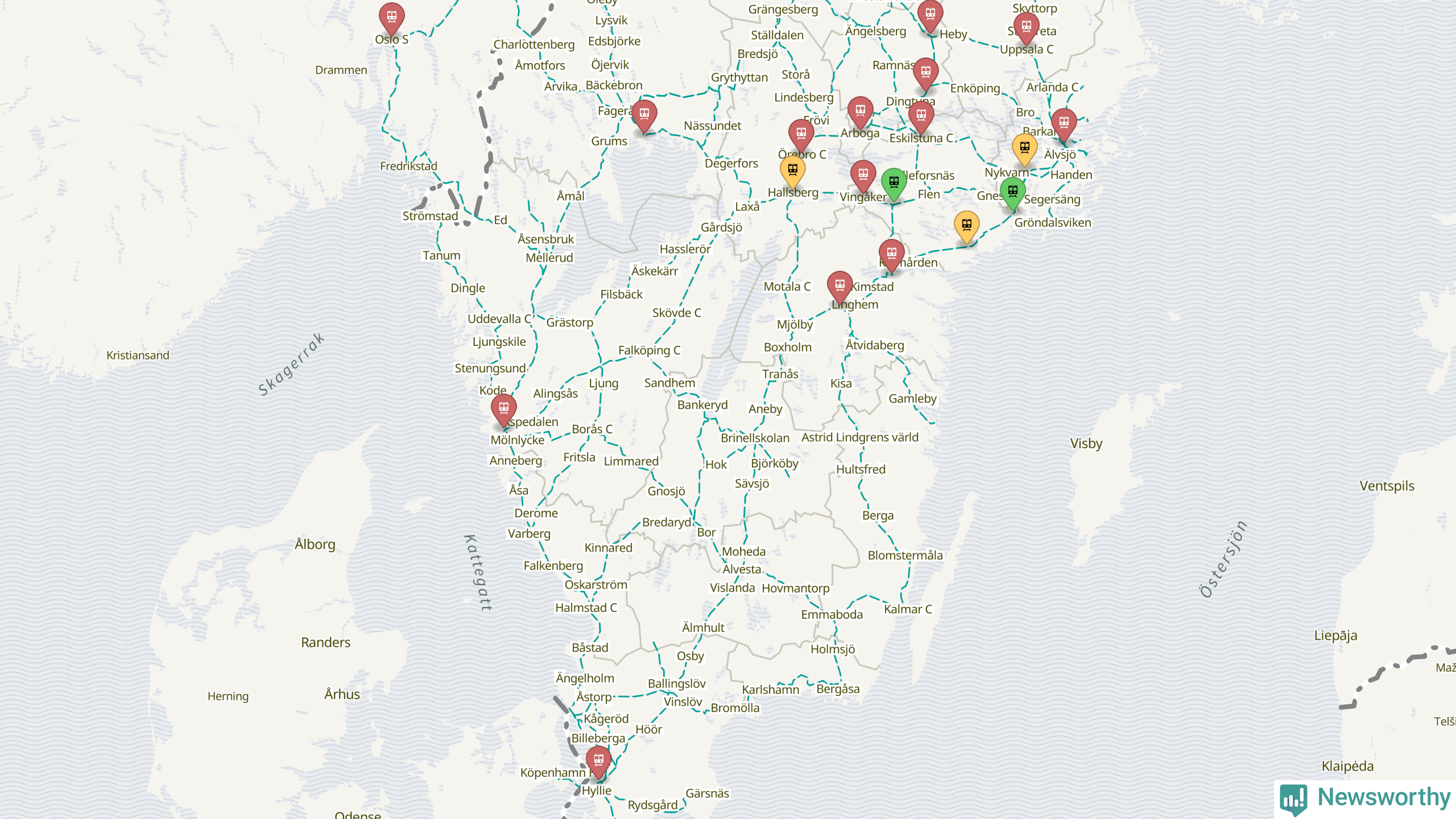 Kartdata från Mapbox, Newsworthy, OpenStreetMap och Trafikverket. Uppgifter om sträckor med passagerartrafik från jarnvag.net.