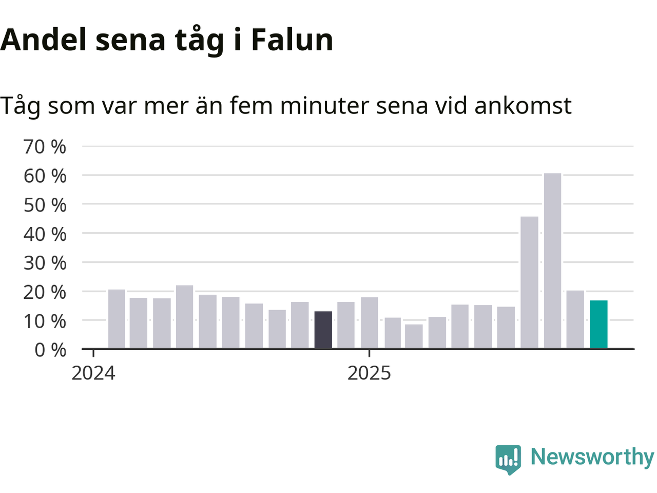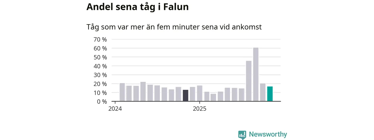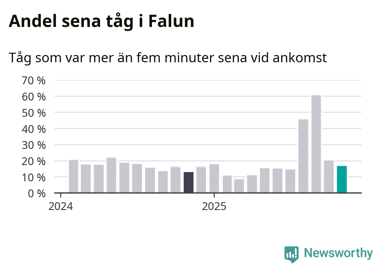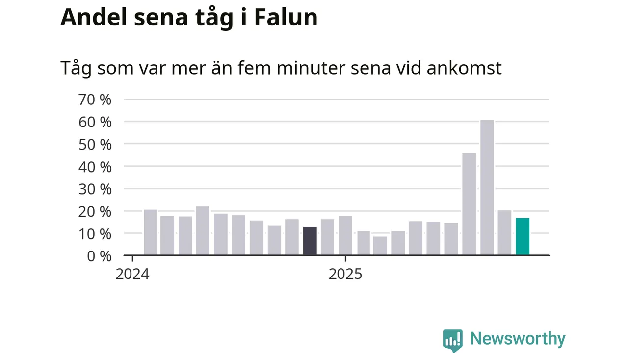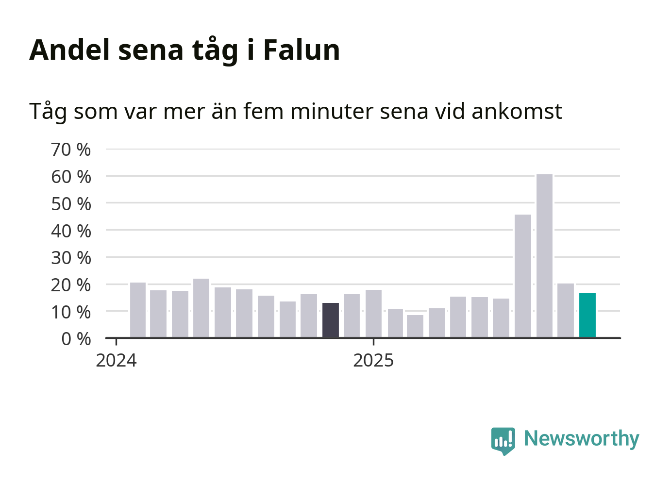 17 procent kan jämföras med 20 procent månaden innan, och 13 procent i november 2024. Siffrorna bygger på realtidsinformation om tågavgångar och ankomster från Trafikverket, som Newsworthy löpande samlar in.