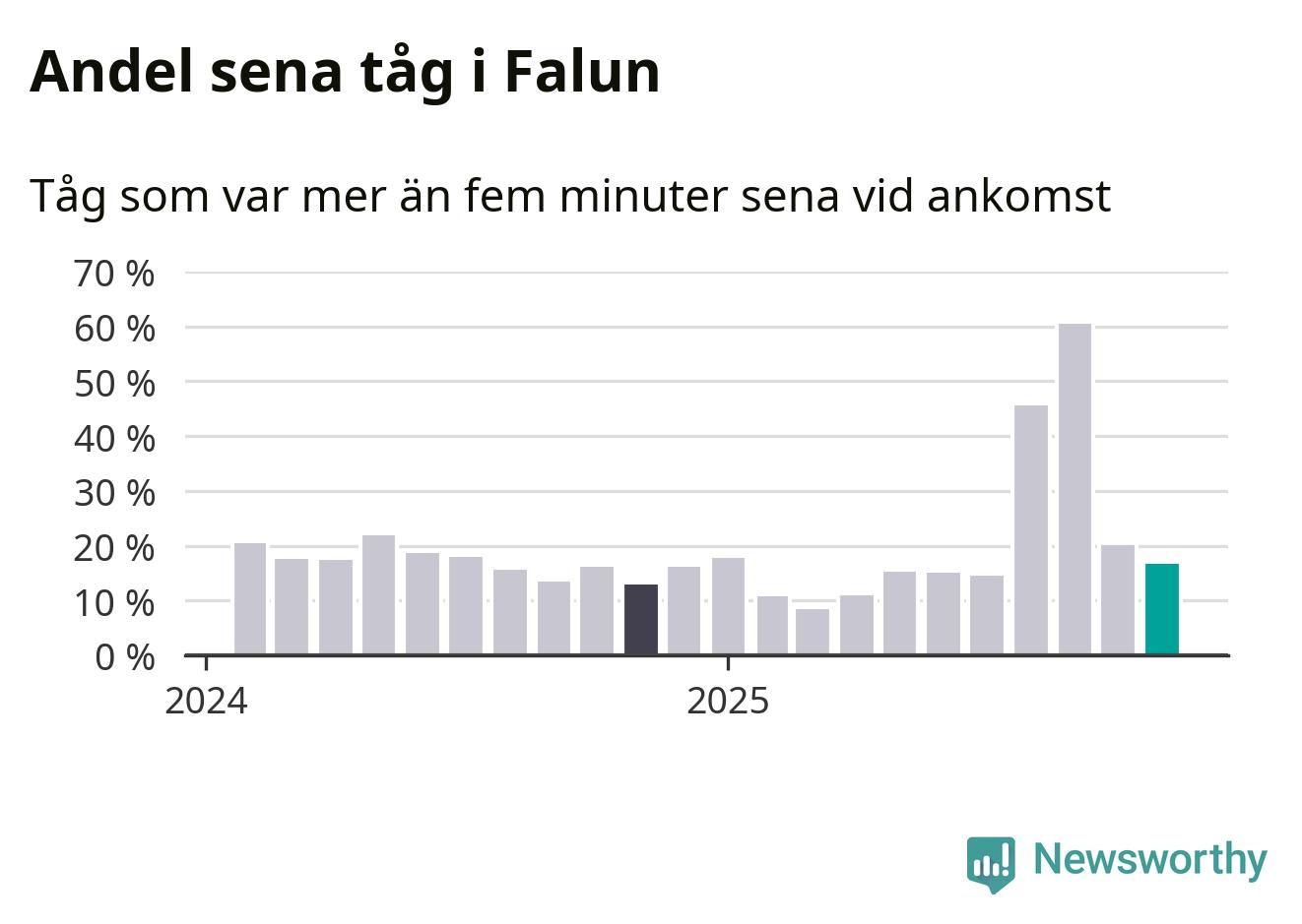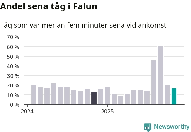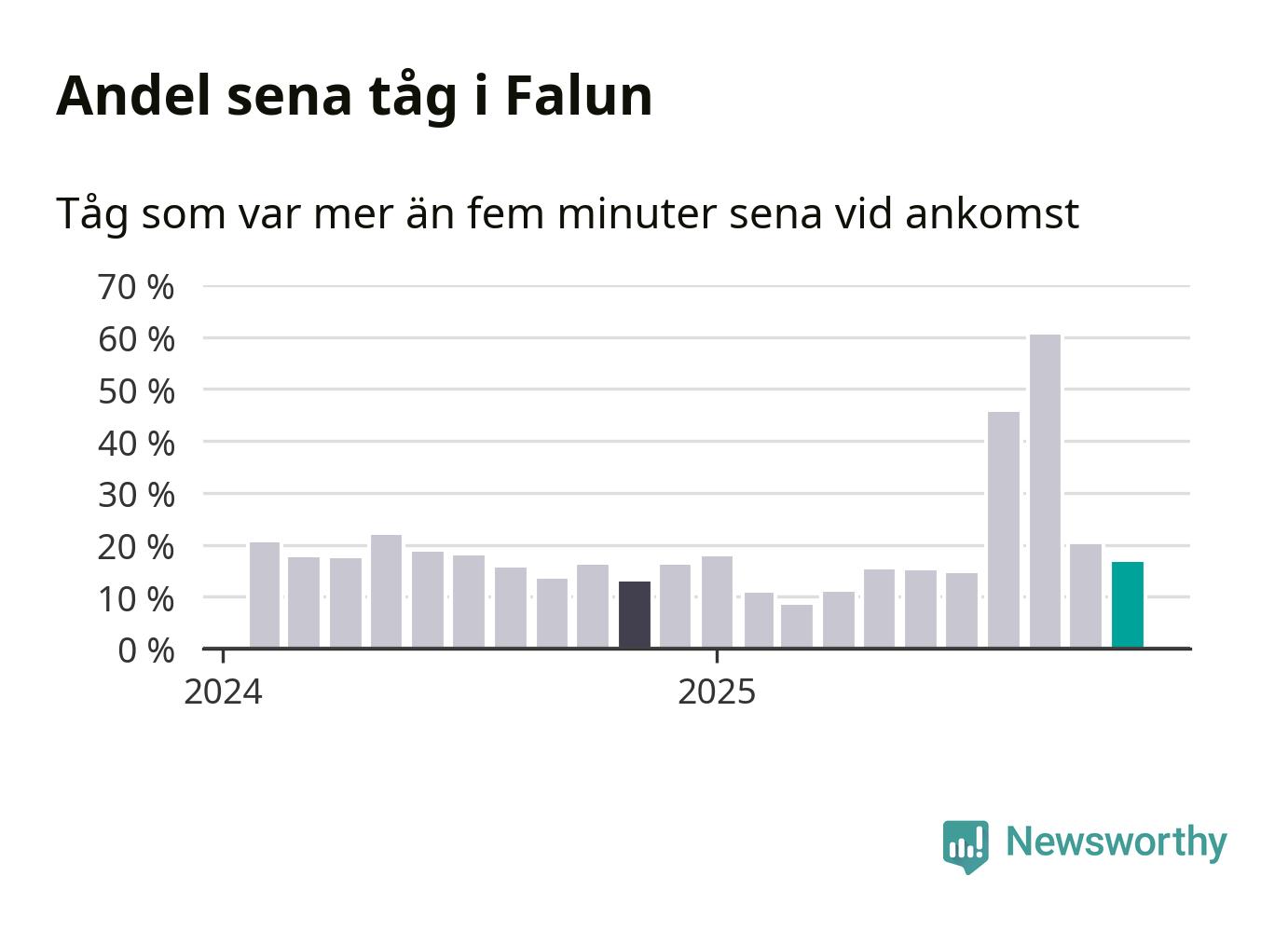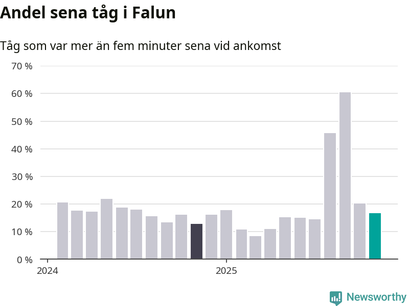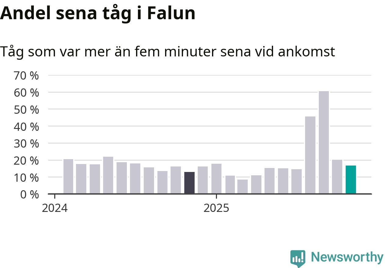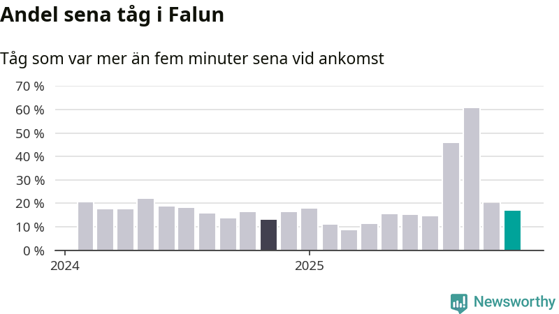 17 procent kan jämföras med 20 procent månaden innan, och 13 procent i november 2024. Siffrorna bygger på realtidsinformation om tågavgångar och ankomster från Trafikverket, som Newsworthy löpande samlar in.