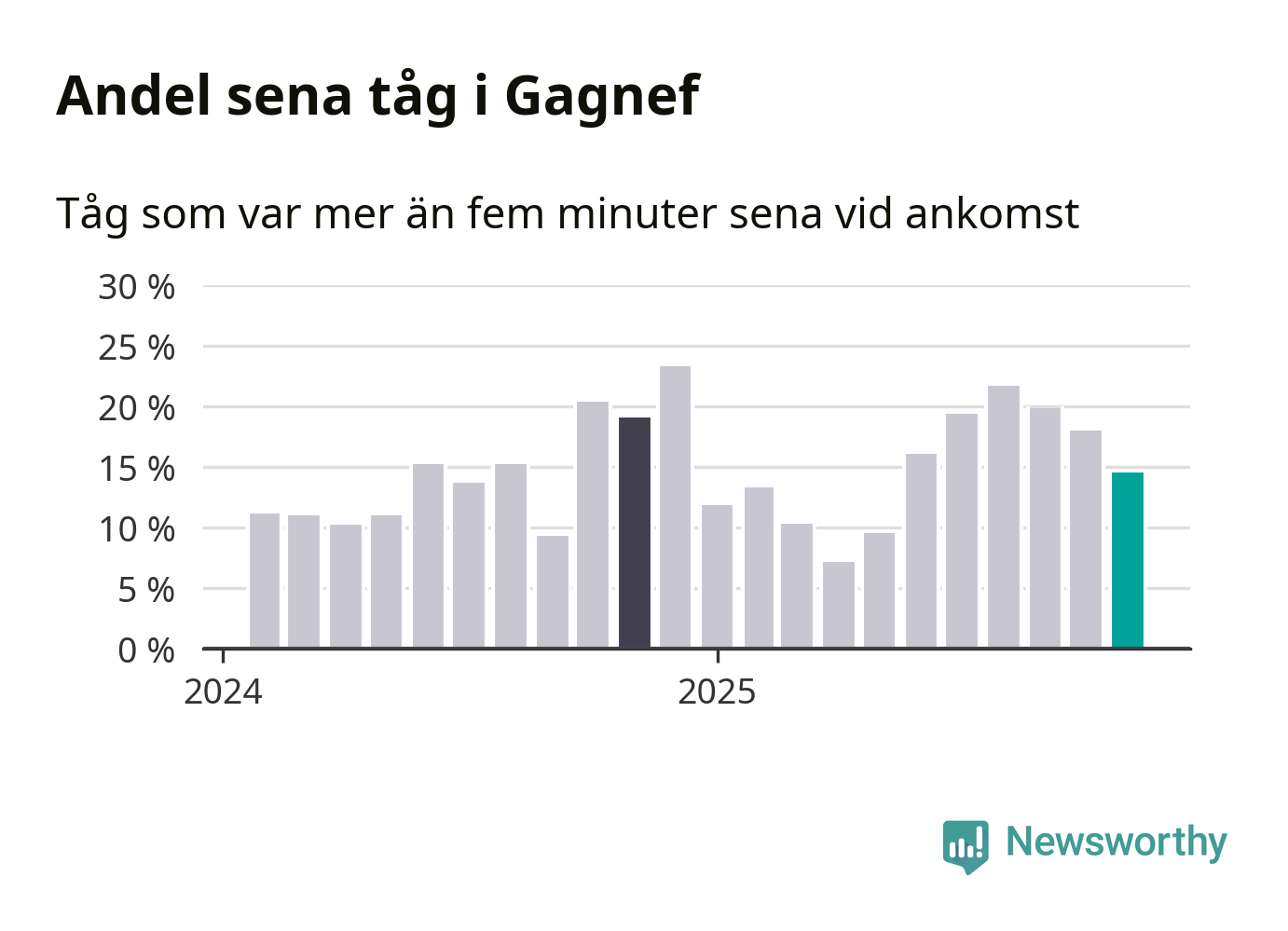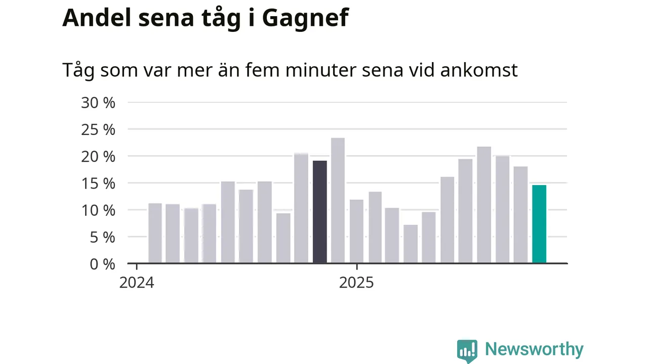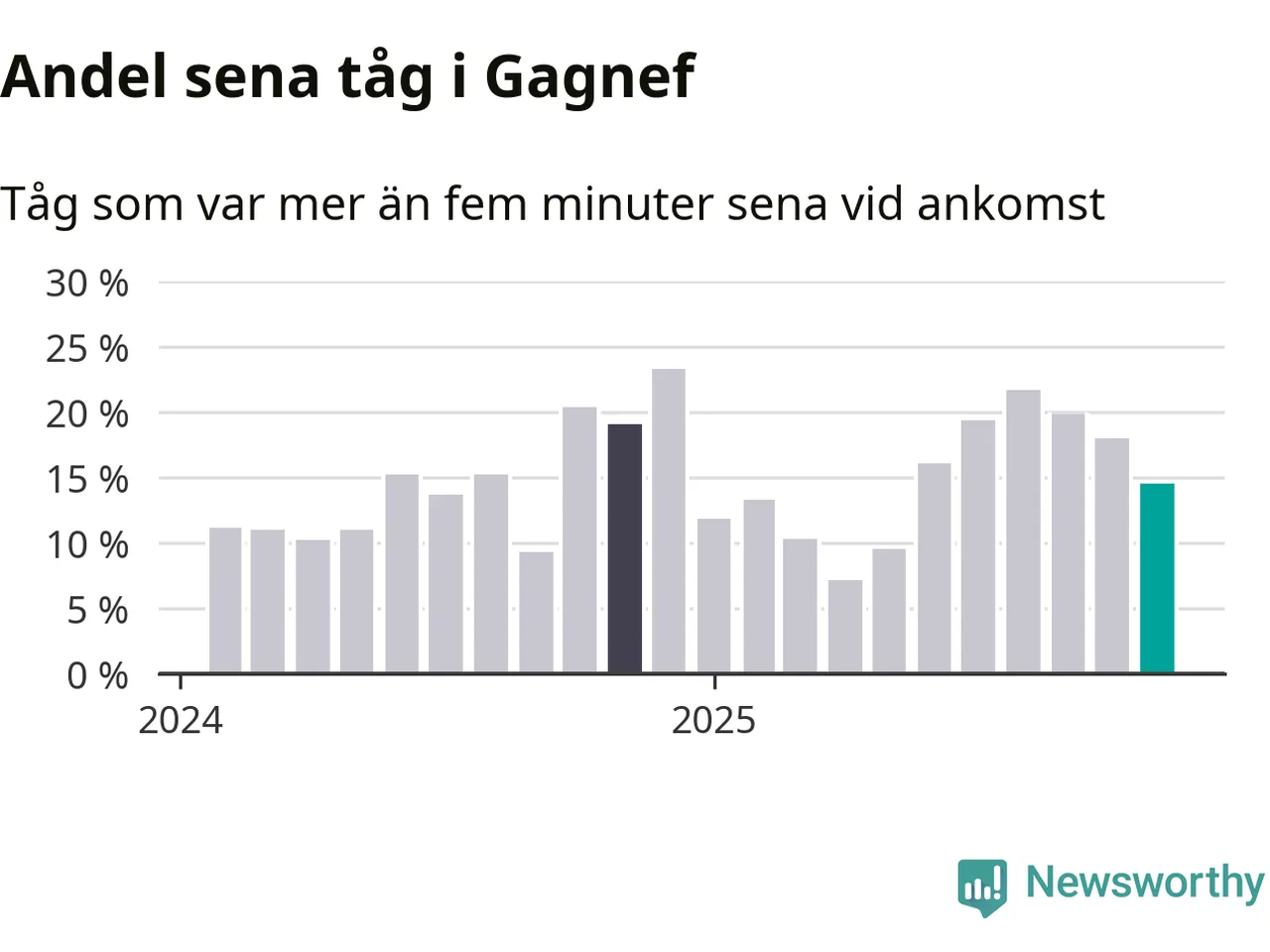15 procent kan jämföras med 18 procent månaden innan, och 19 procent i november 2024. November är den tredje månaden i rad med minskande förseningar i Gagnef. Siffrorna bygger på realtidsinformation om tågavgångar och ankomster från Trafikverket, som Newsworthy löpande samlar in.