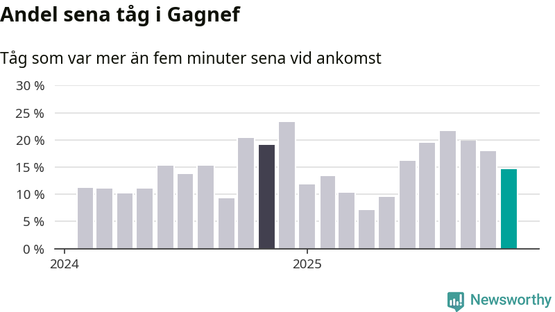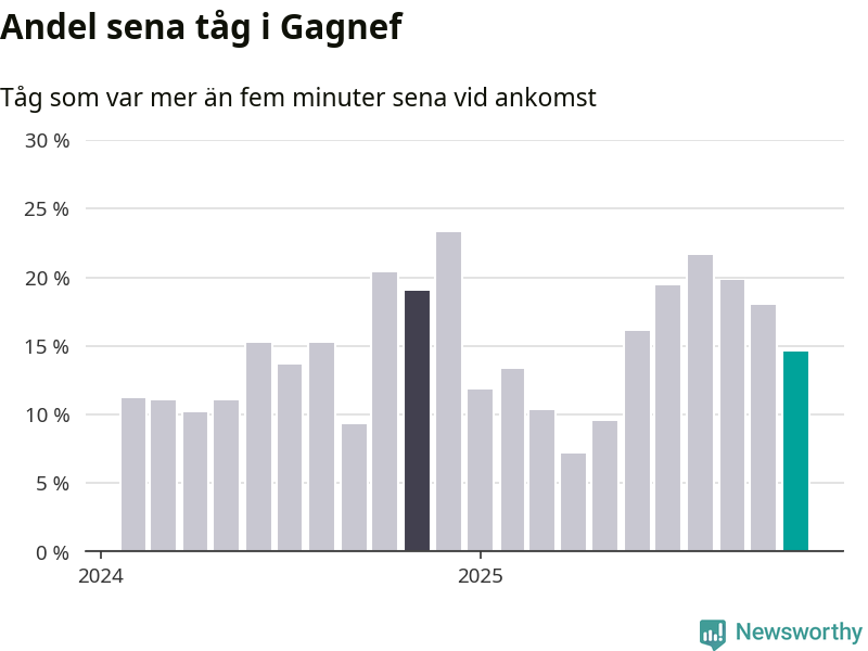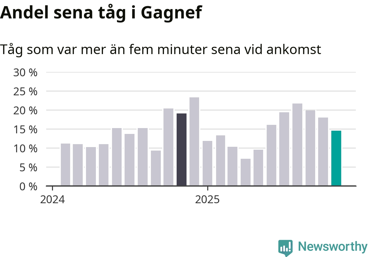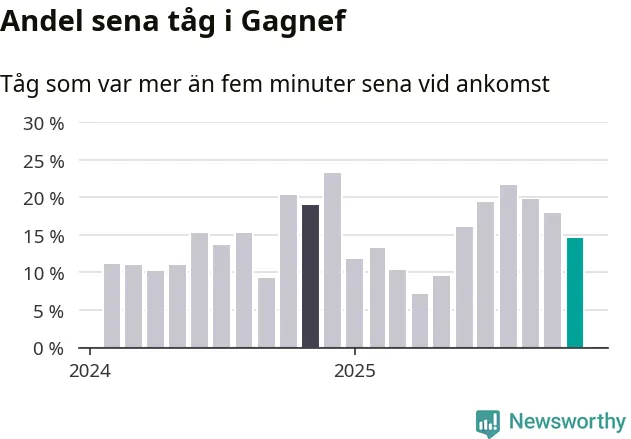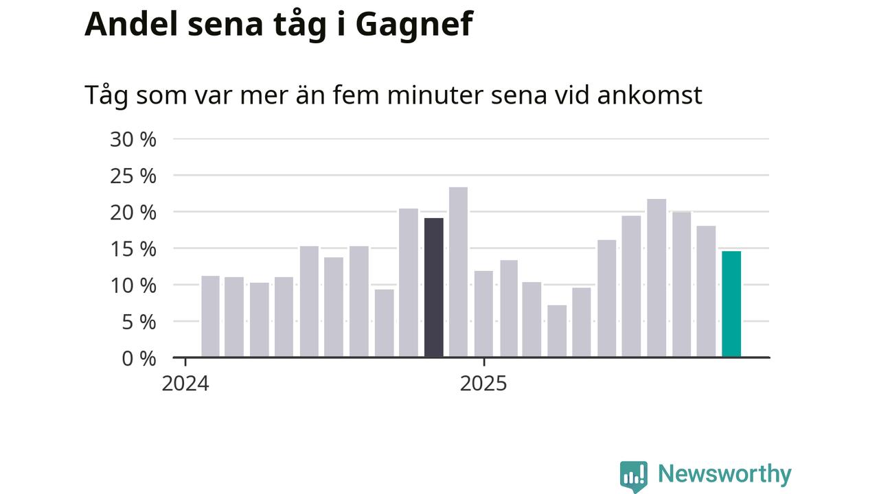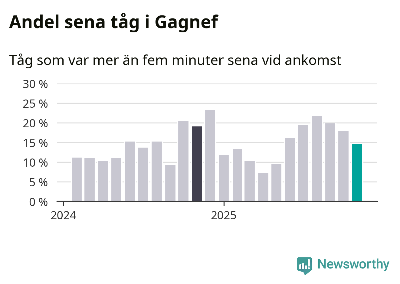 15 procent kan jämföras med 18 procent månaden innan, och 19 procent i november 2024. November är den tredje månaden i rad med minskande förseningar i Gagnef. Siffrorna bygger på realtidsinformation om tågavgångar och ankomster från Trafikverket, som Newsworthy löpande samlar in.