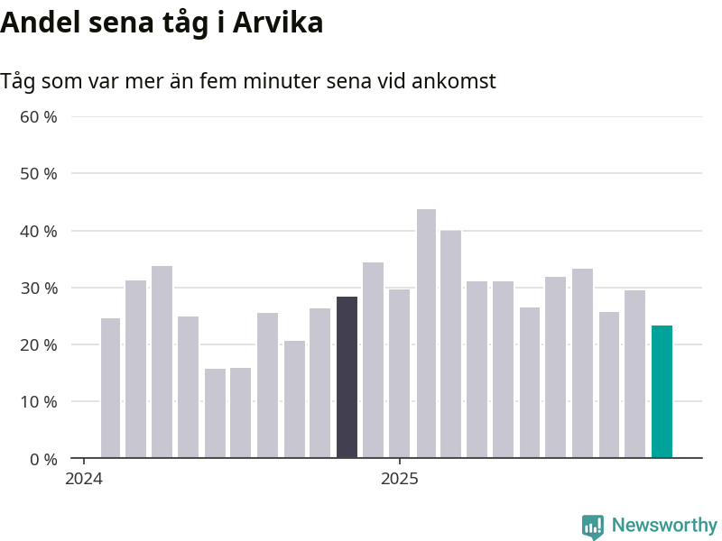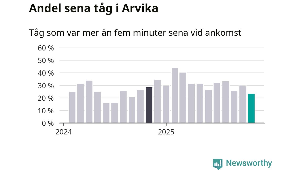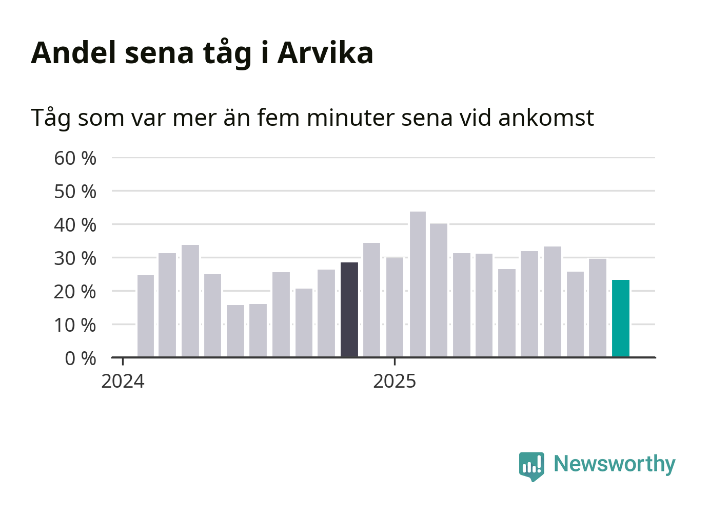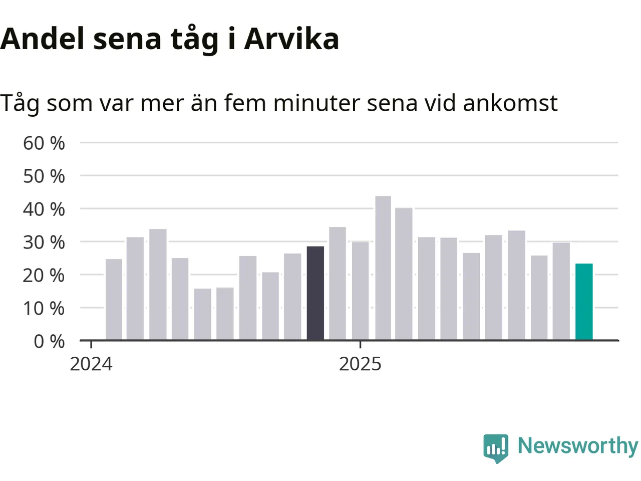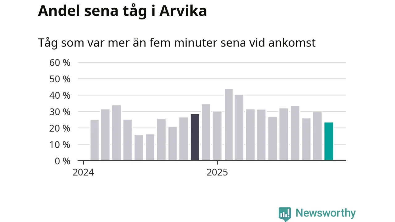 Senast andelen förseningar var så låg var i september 2024. Siffrorna bygger på realtidsinformation om tågavgångar och ankomster från Trafikverket, som Newsworthy löpande samlar in.