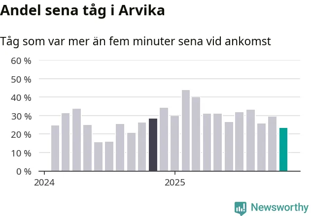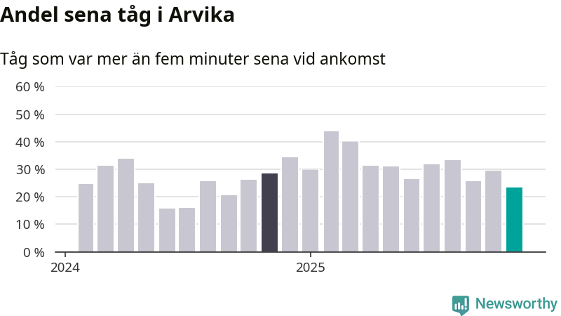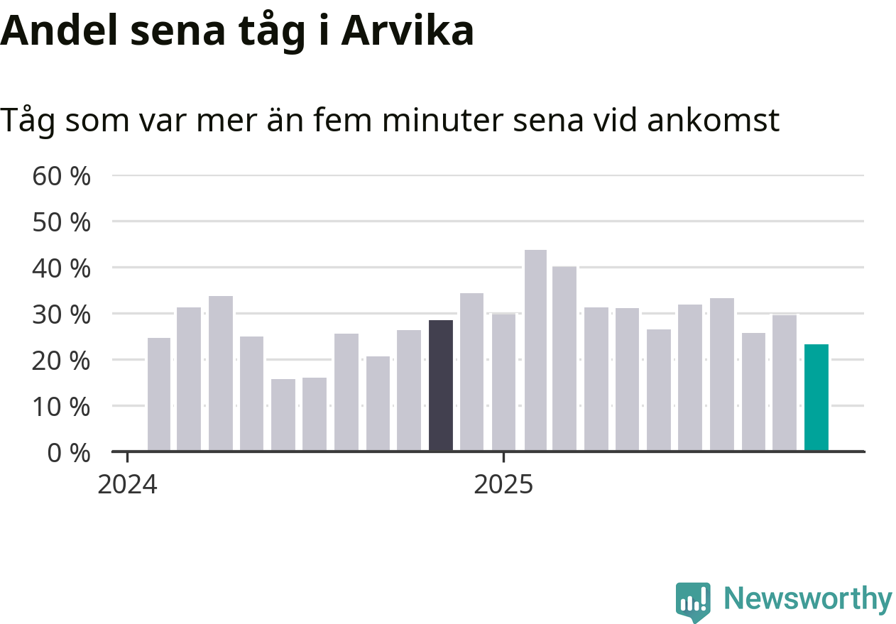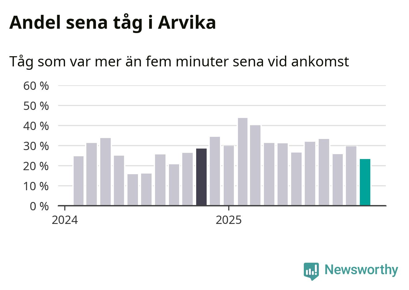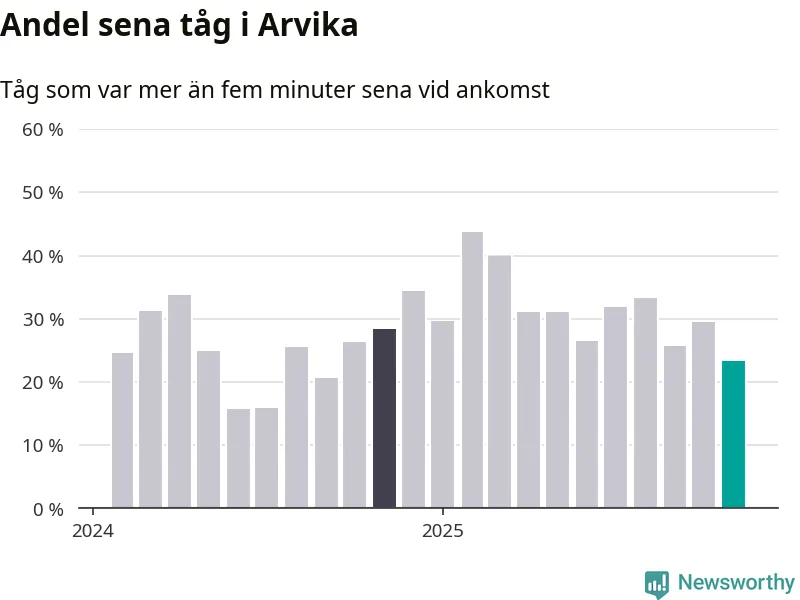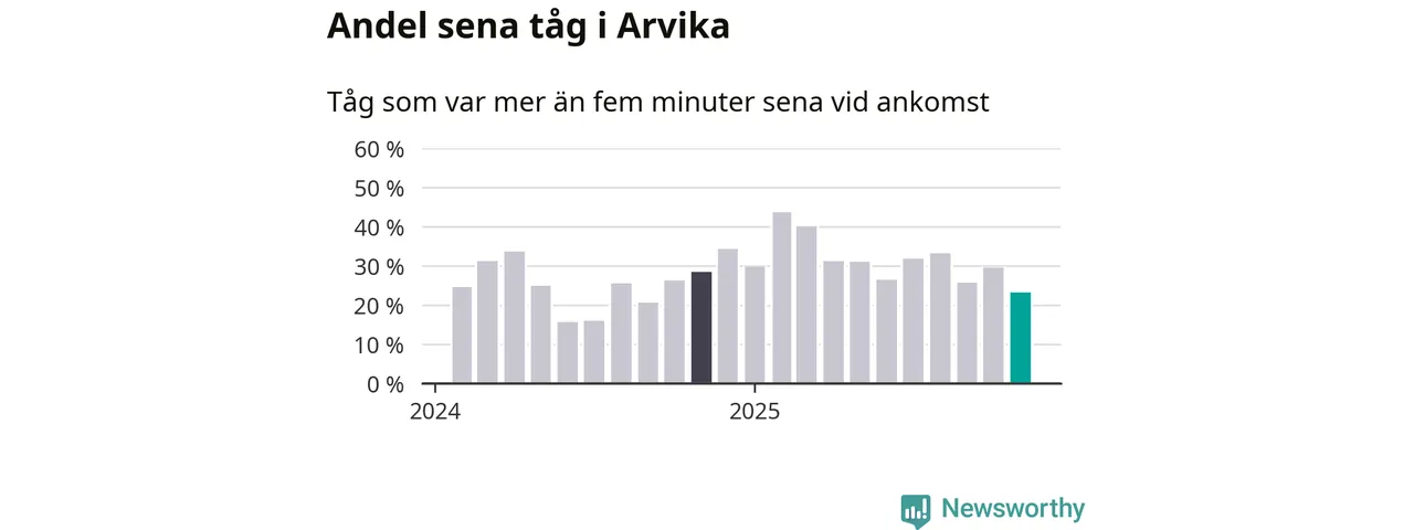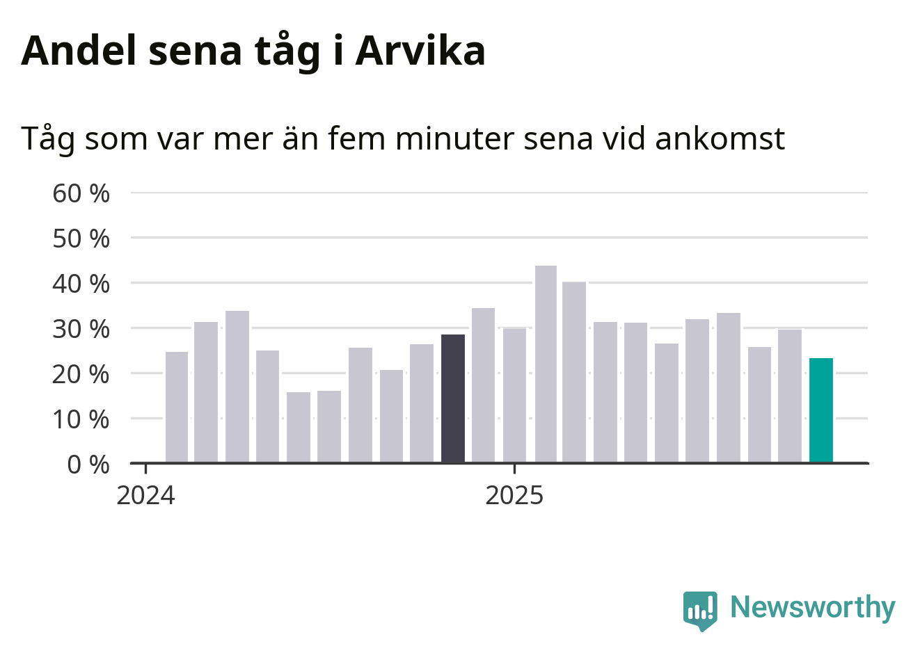 Senast andelen förseningar var så låg var i september 2024. Siffrorna bygger på realtidsinformation om tågavgångar och ankomster från Trafikverket, som Newsworthy löpande samlar in.