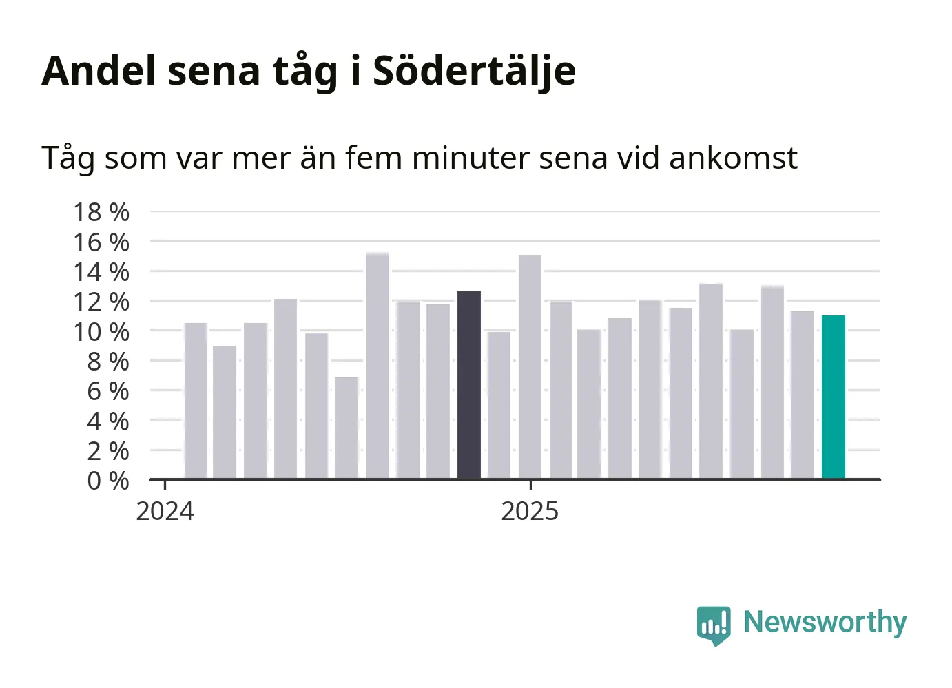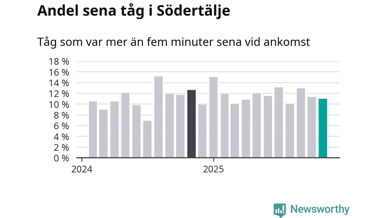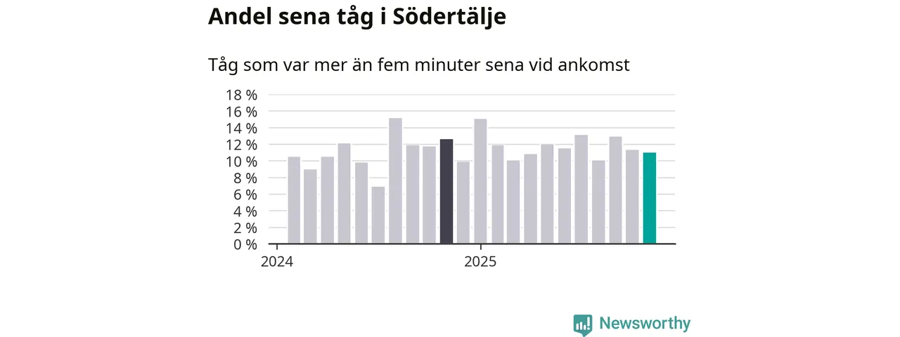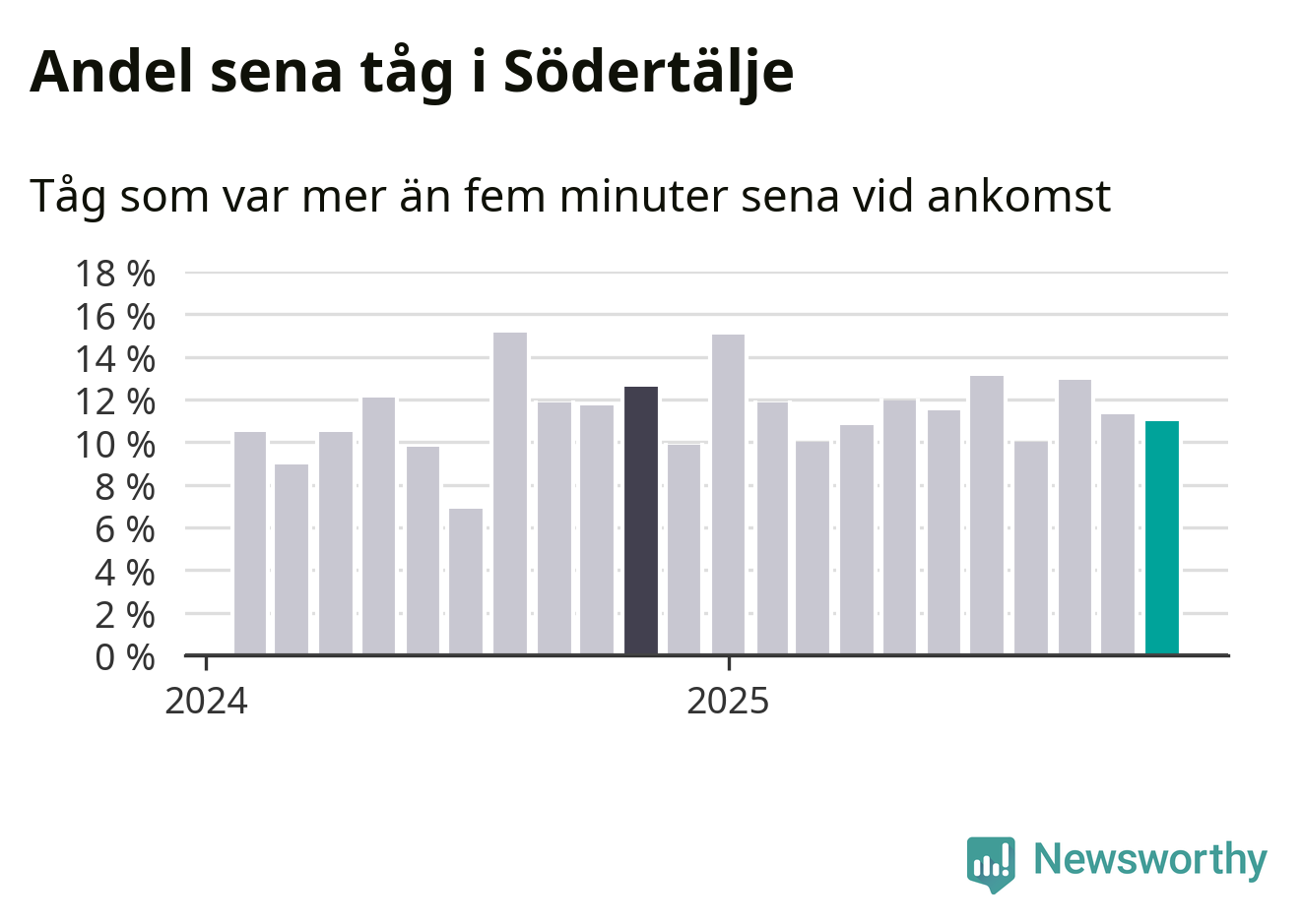 Av omkring 10 400 tåg som passerade någon av stationerna i Södertälje kommun i november var 1 138 mer än fem minuter sena. Det motsvarar 11 procent, en bit över den nationella målsättningen som säger att inte mer än fem procent av tågen ska vara sena.