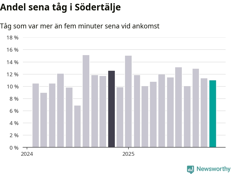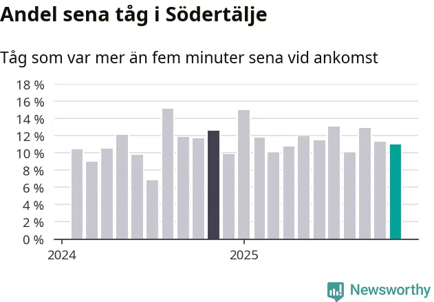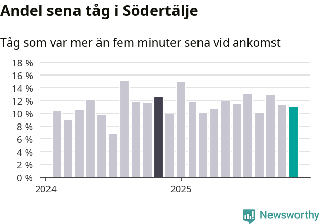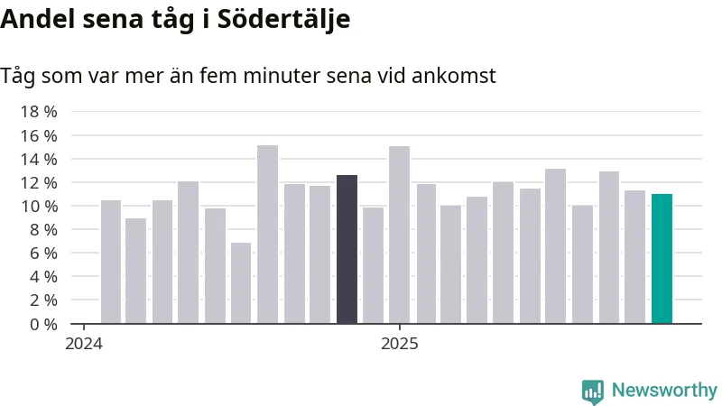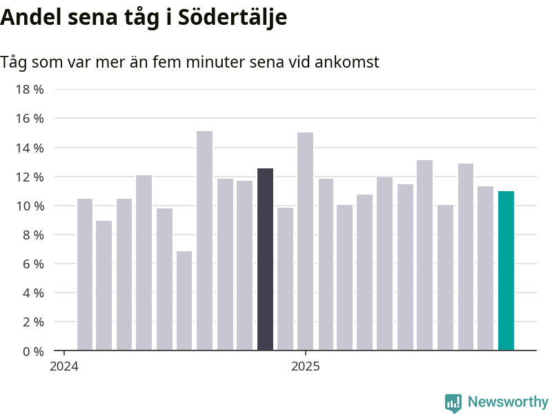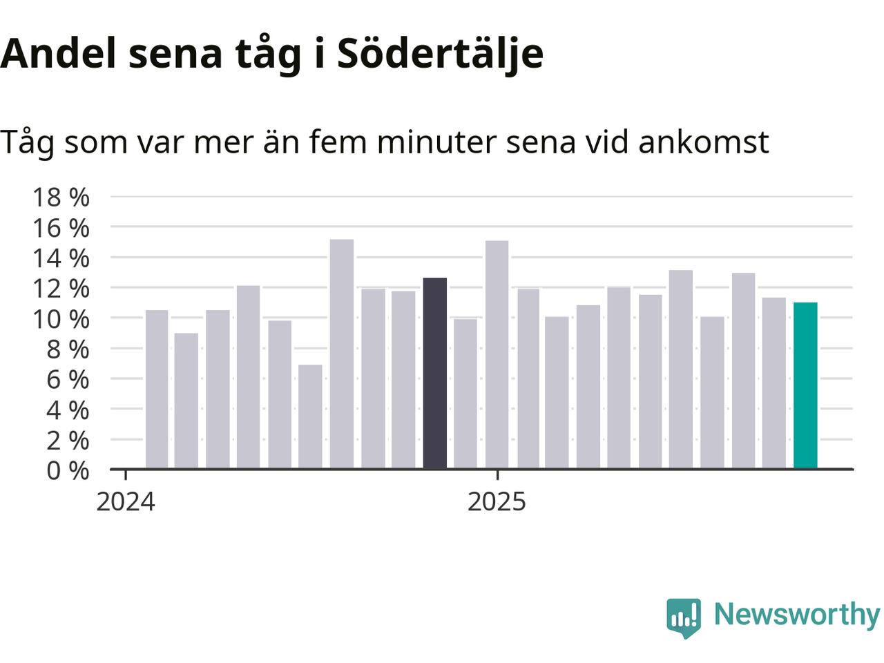Av omkring 10 400 tåg som passerade någon av stationerna i Södertälje kommun i november var 1 138 mer än fem minuter sena. Det motsvarar 11 procent, en bit över den nationella målsättningen som säger att inte mer än fem procent av tågen ska vara sena.