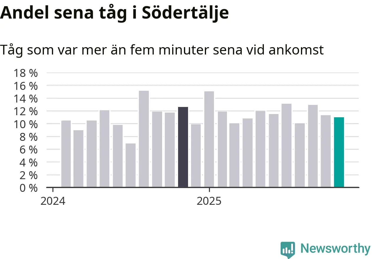 Elva procent är marginellt mindre än månaden innan, och kan jämföras med 13 procent i november 2024. Siffrorna bygger på realtidsinformation om tågavgångar och ankomster från Trafikverket, som Newsworthy löpande samlar in.