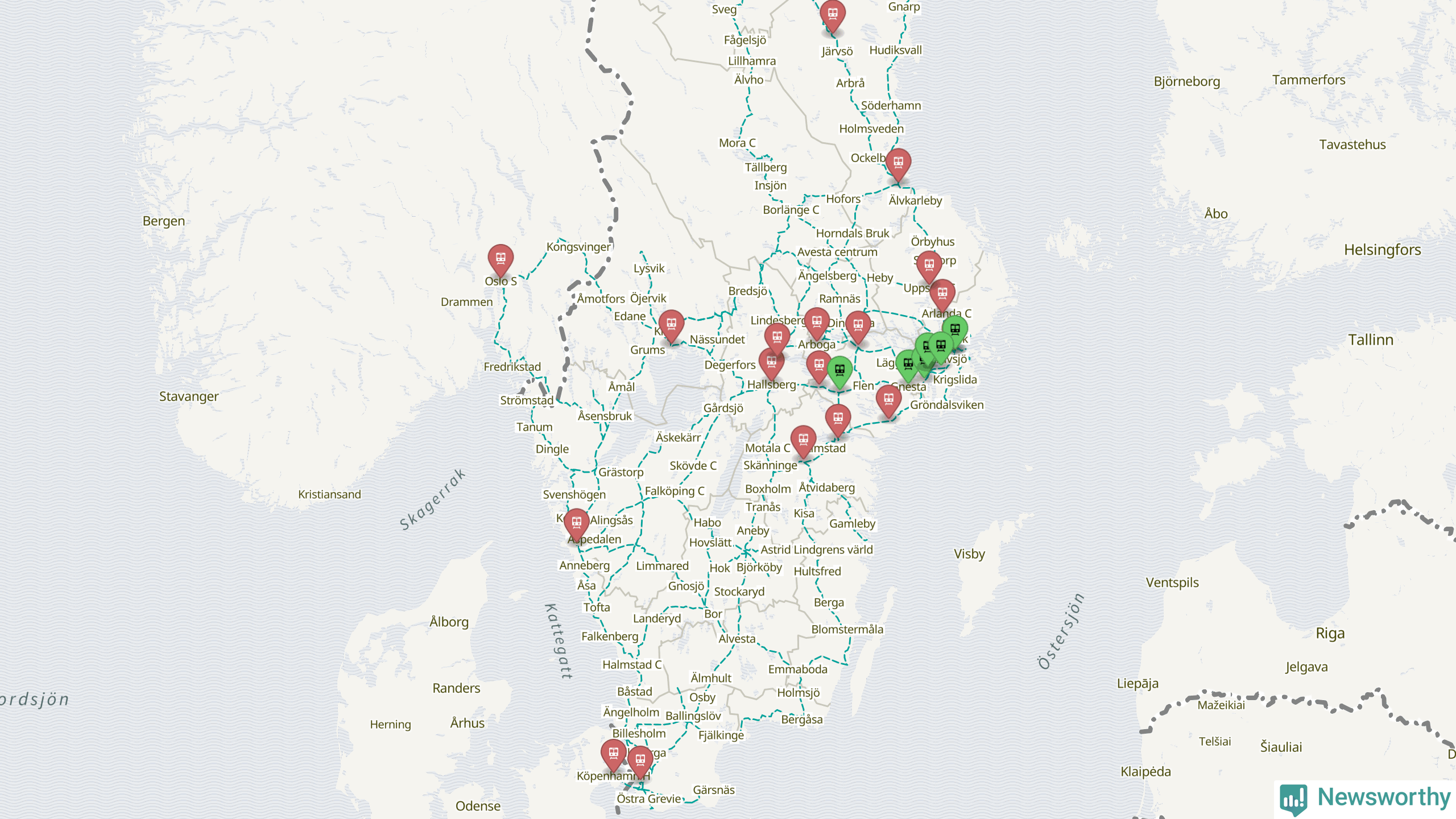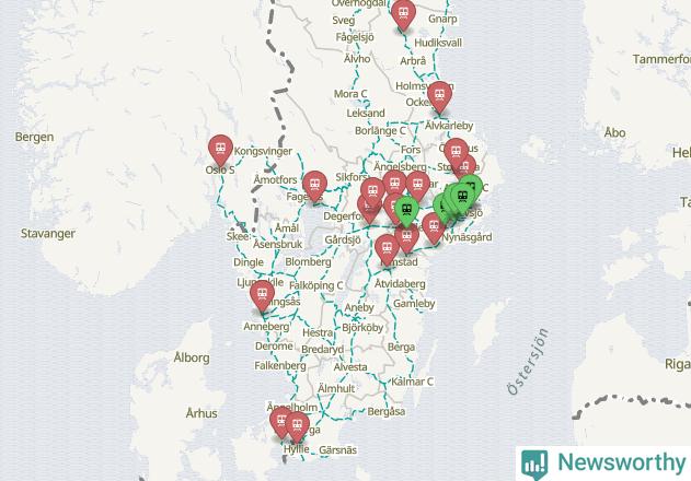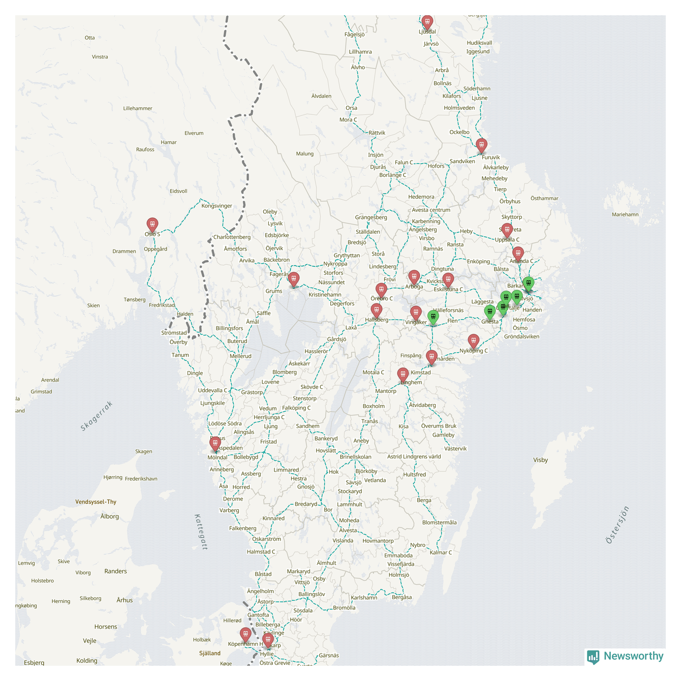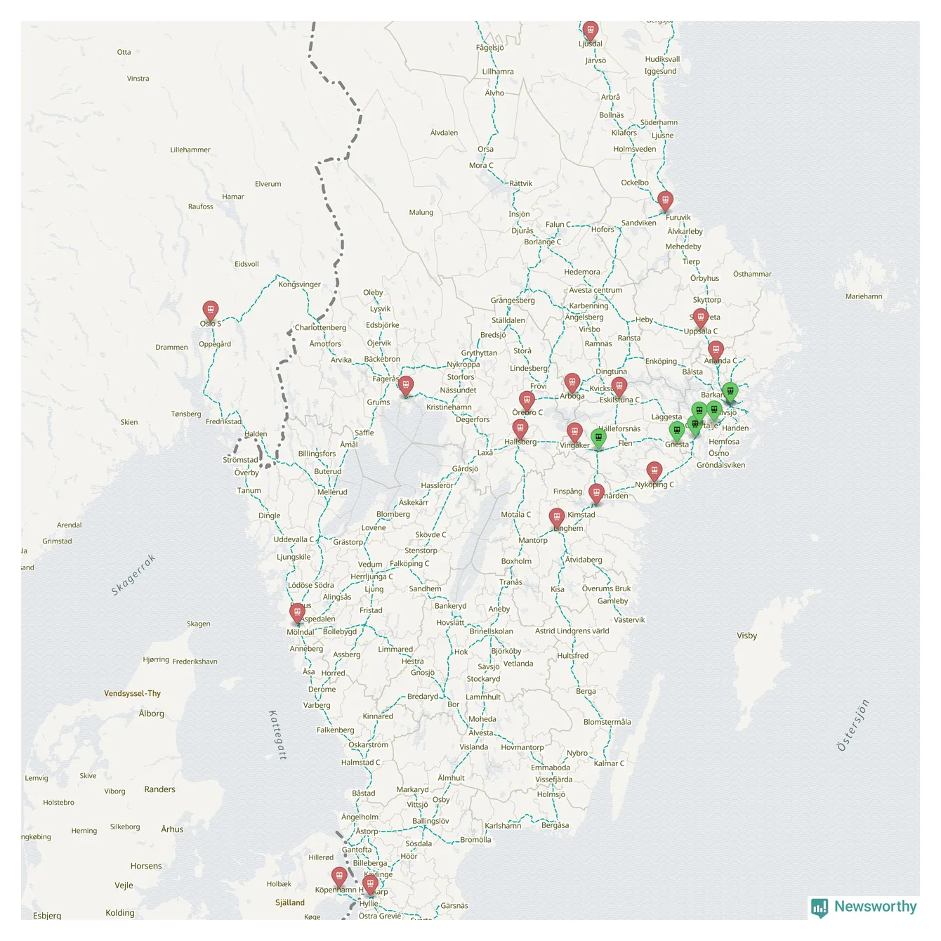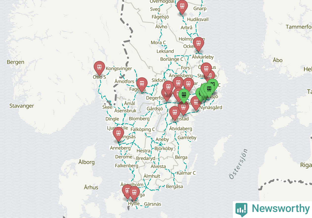 Kartdata från Mapbox, Newsworthy, OpenStreetMap och Trafikverket. Uppgifter om sträckor med passagerartrafik från jarnvag.net.