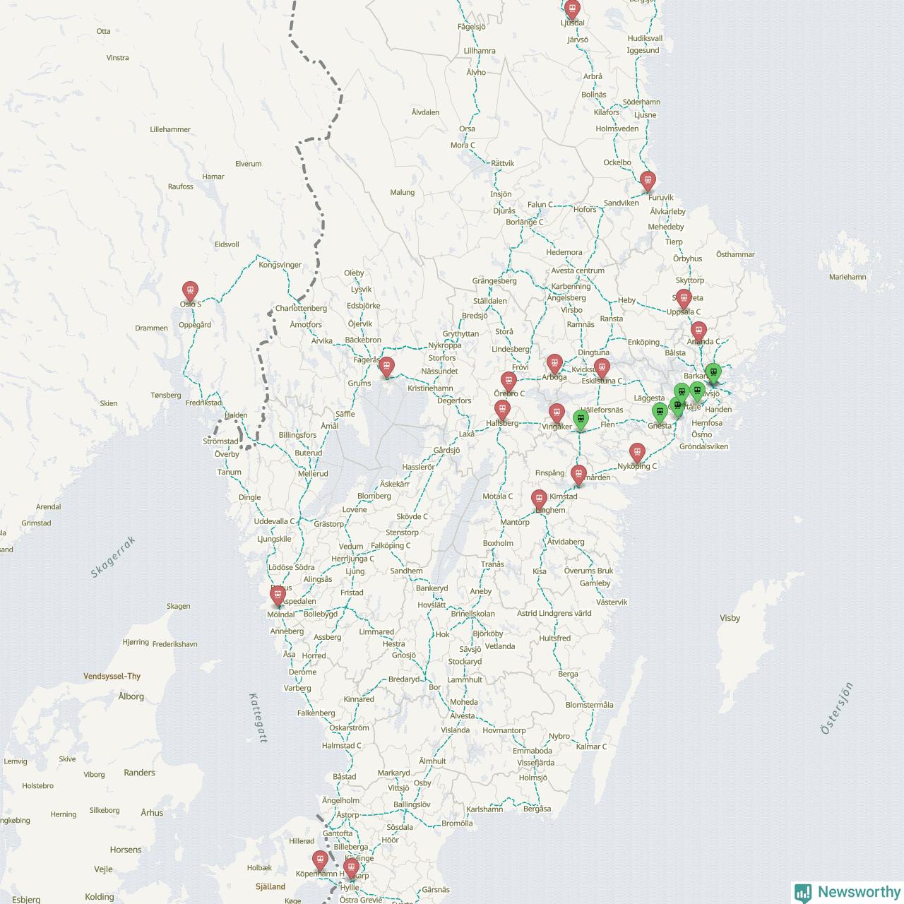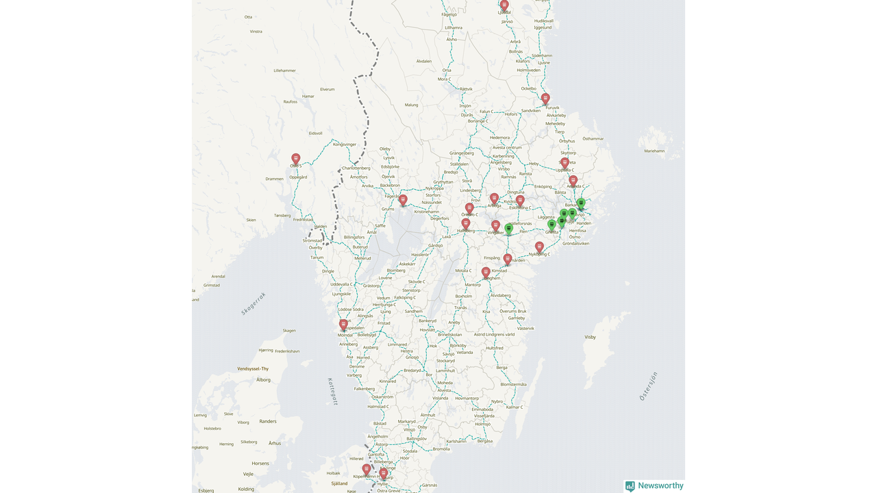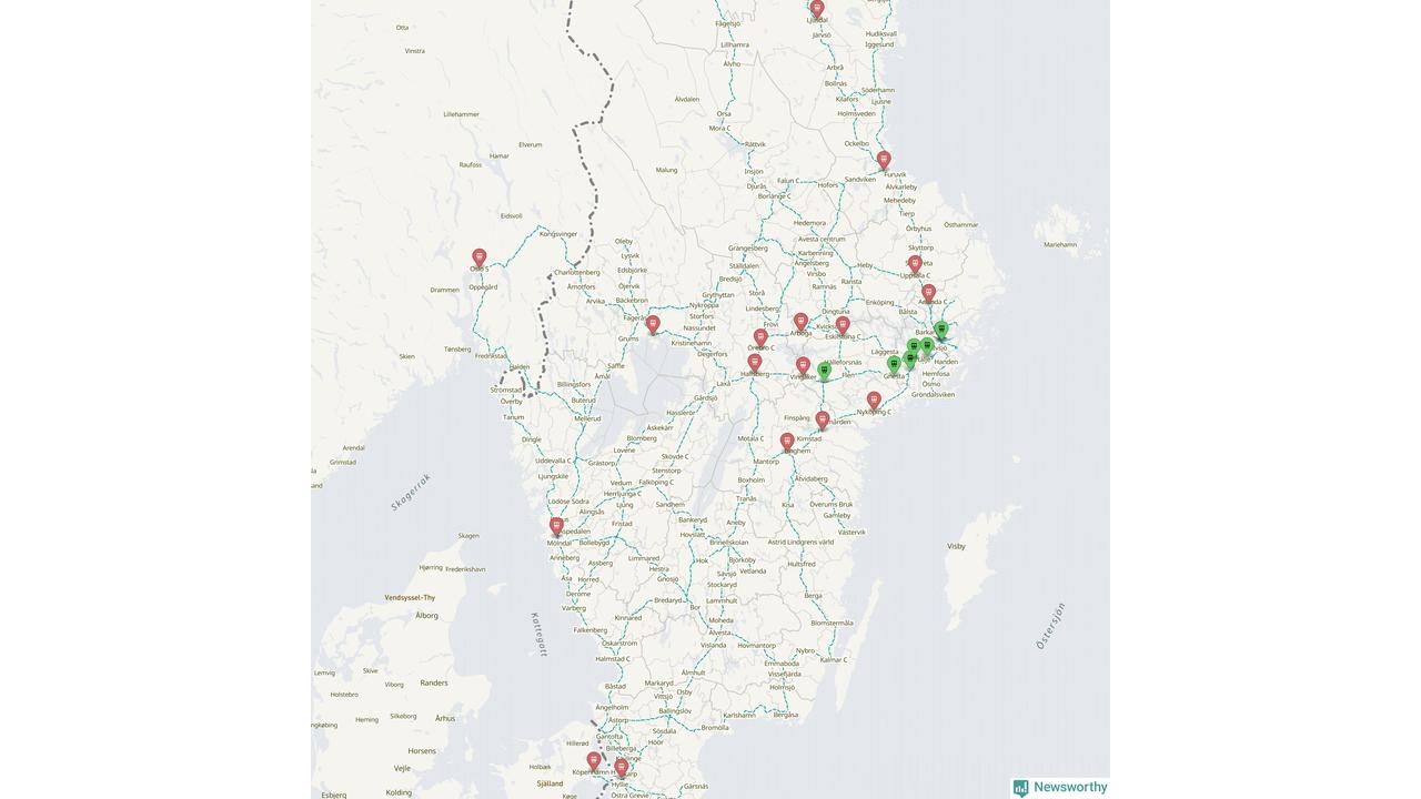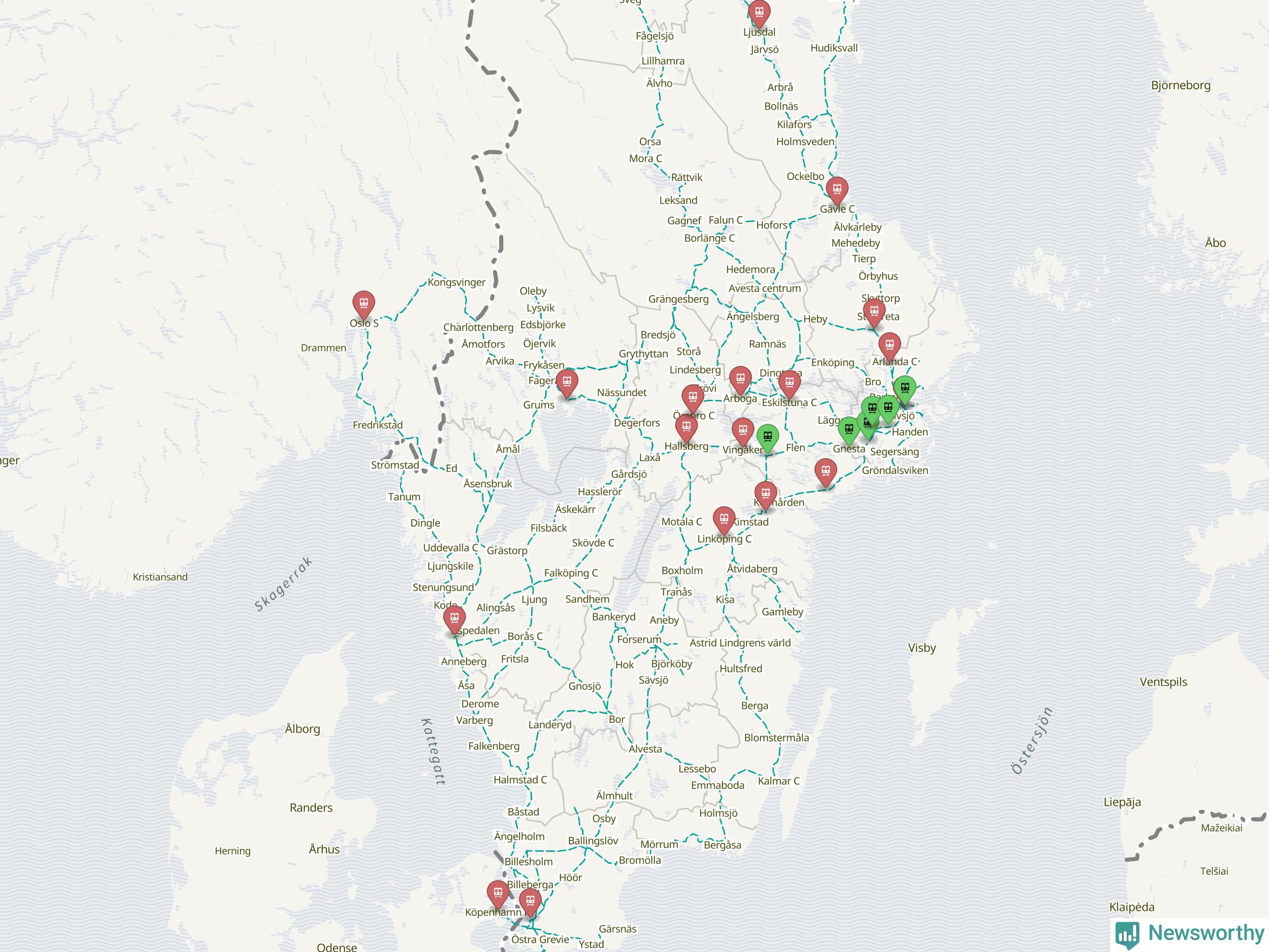 Kartdata från Mapbox, Newsworthy, OpenStreetMap och Trafikverket. Uppgifter om sträckor med passagerartrafik från jarnvag.net.